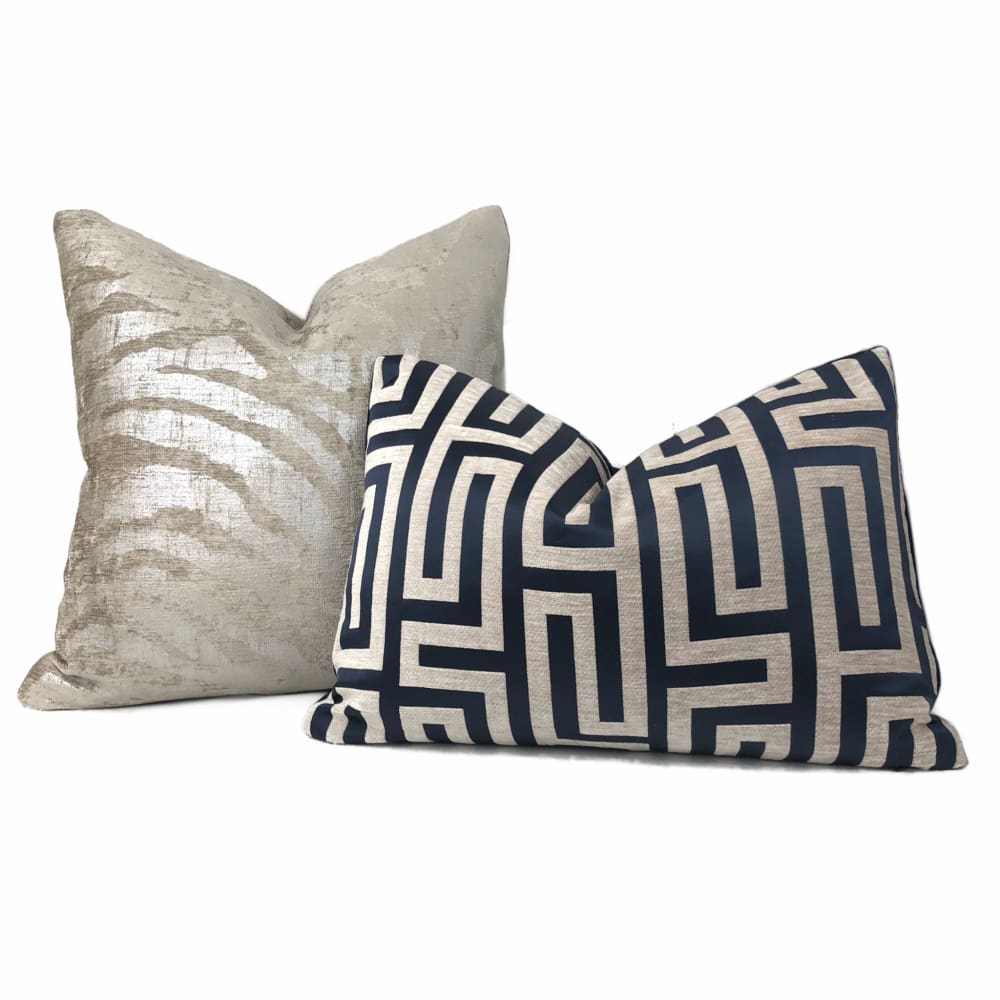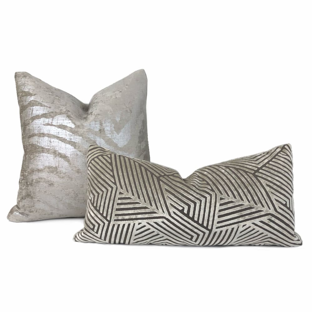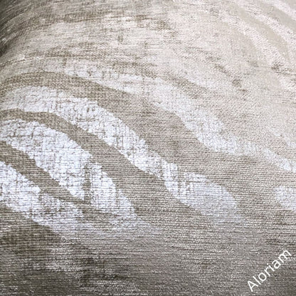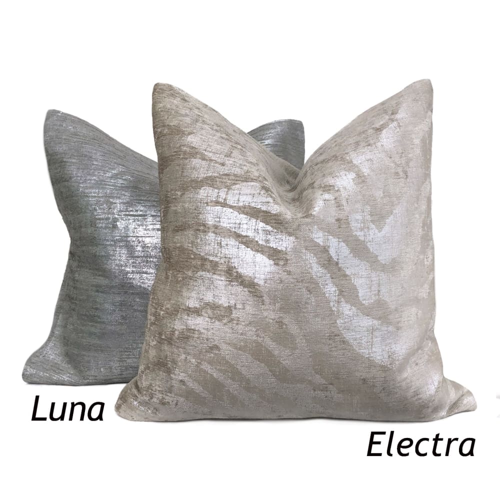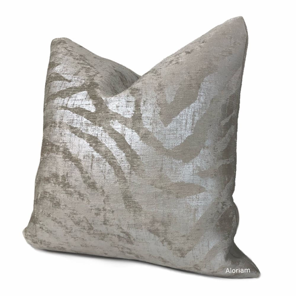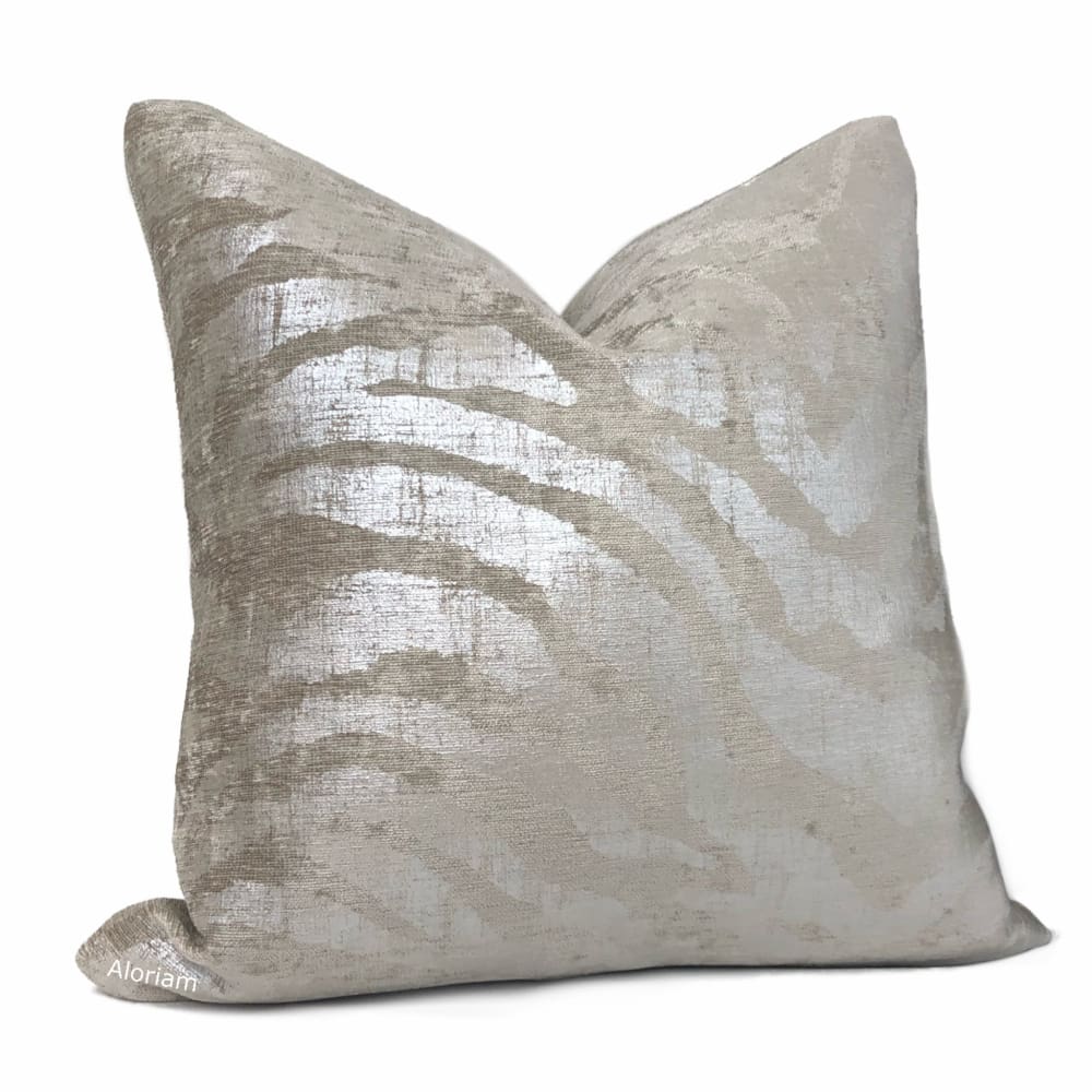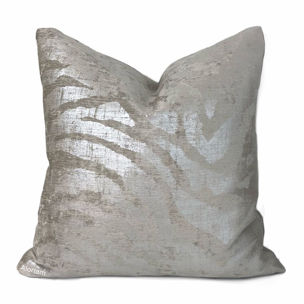 Electra is no ordinary tiger stripe pillow cover! Metallic silver stripes over printed on a light taupe chenille background bring a sleek and sophisticated finishing touch to any contemporary interior.