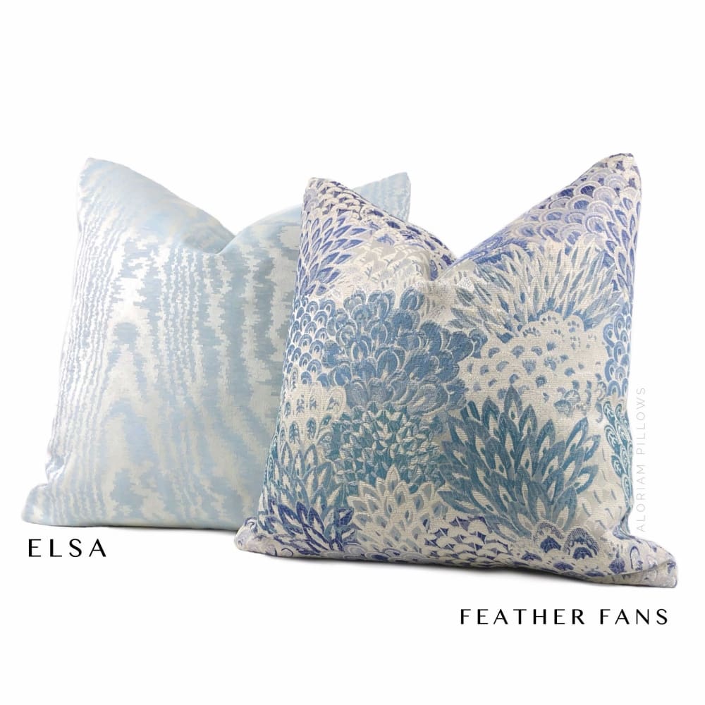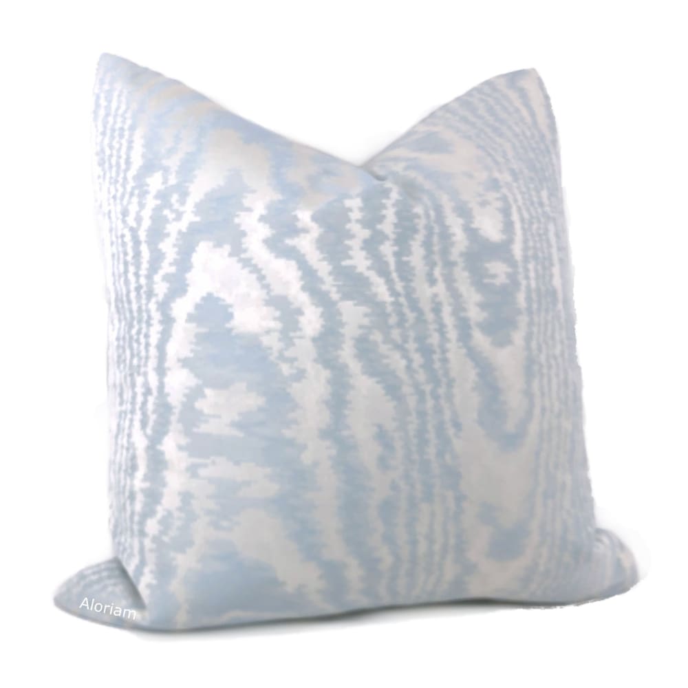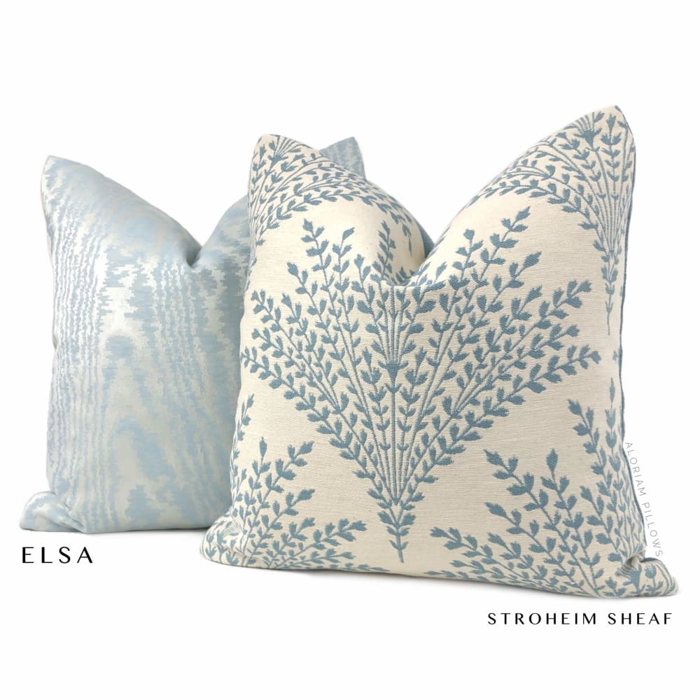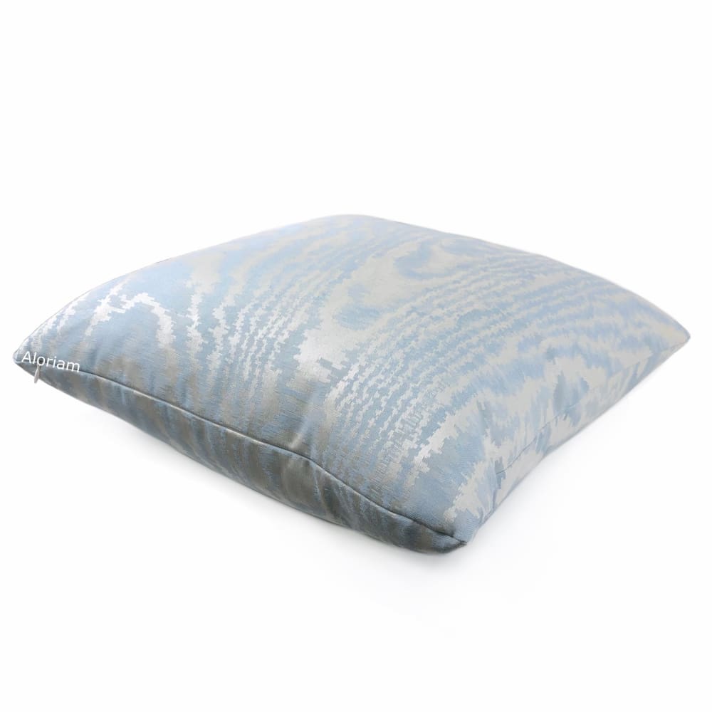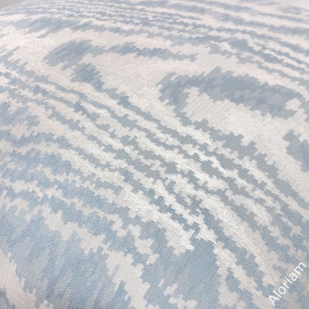 Elsa is a faux bois patterned pillow cover woven in pale ice blue and off-white.
