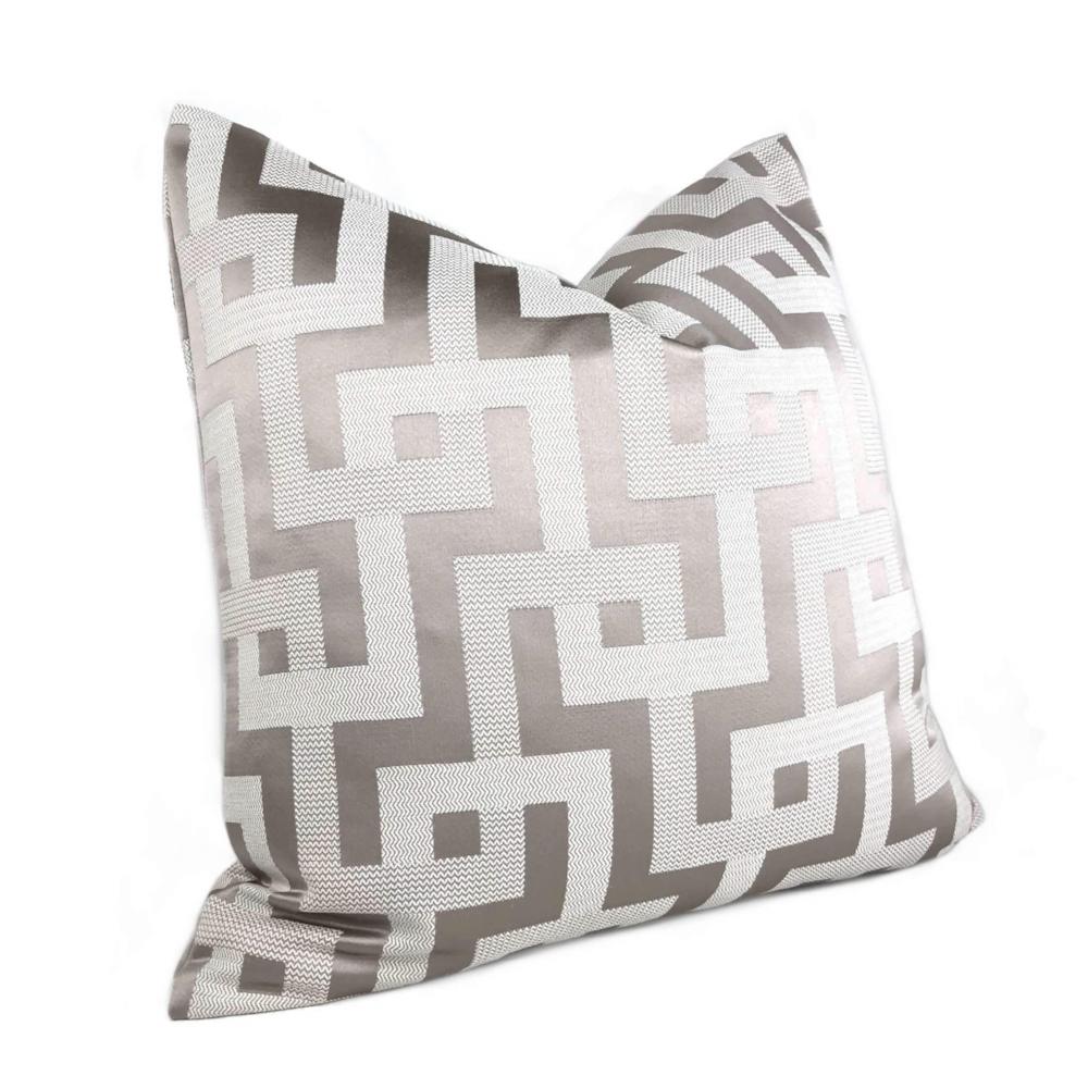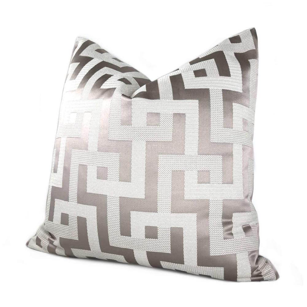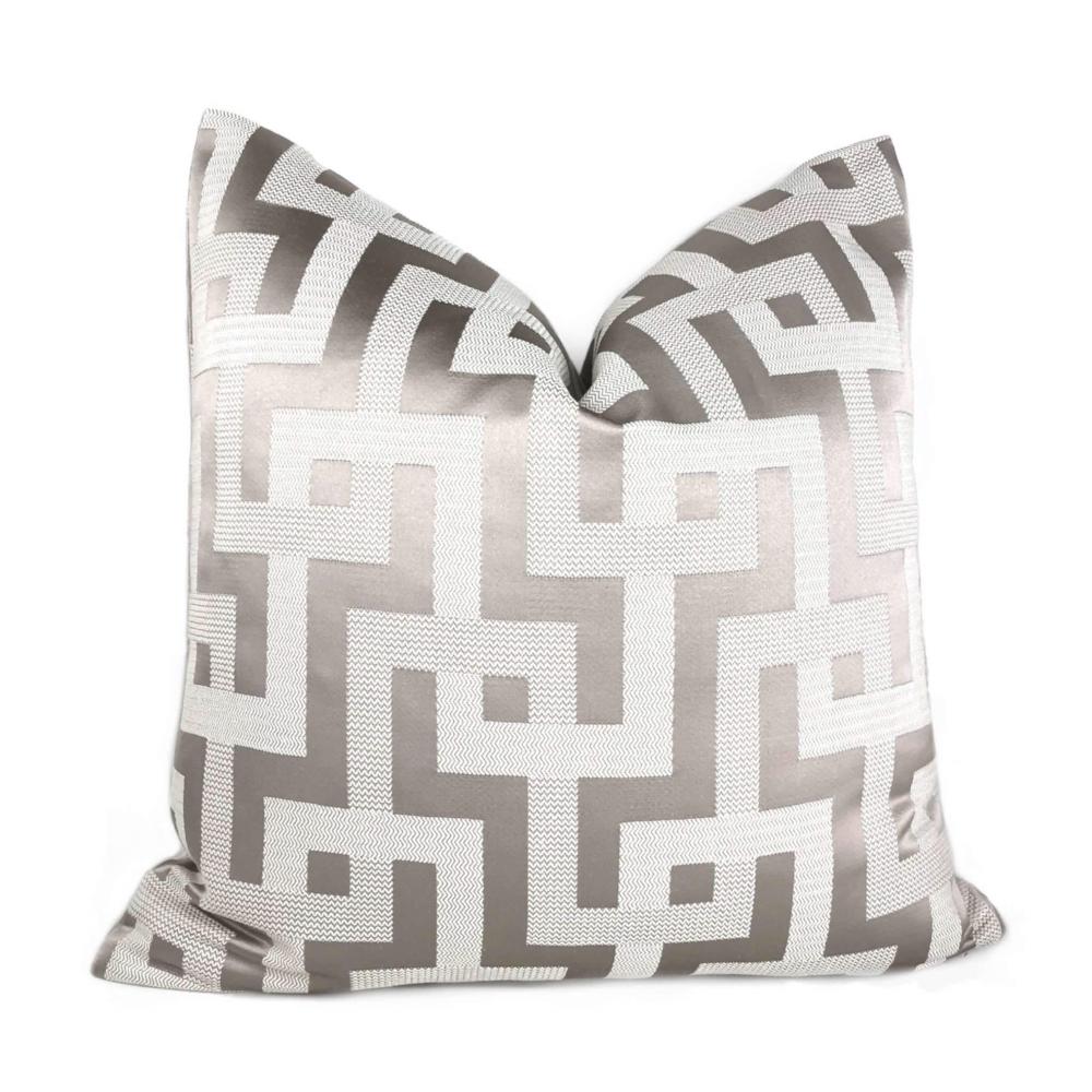 This designer pillow cover features a Greek key or maze geometric fretwork pattern woven in two-tones of silver gray and light dove gray. So gorgeous! Pattern fabric is used on both sides. Photographed on 19x19 cover (filled with 20x20 insert). Available in additonal colors.