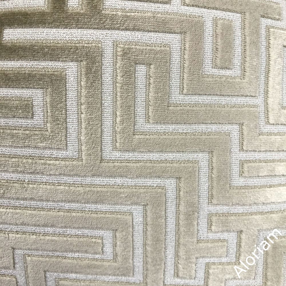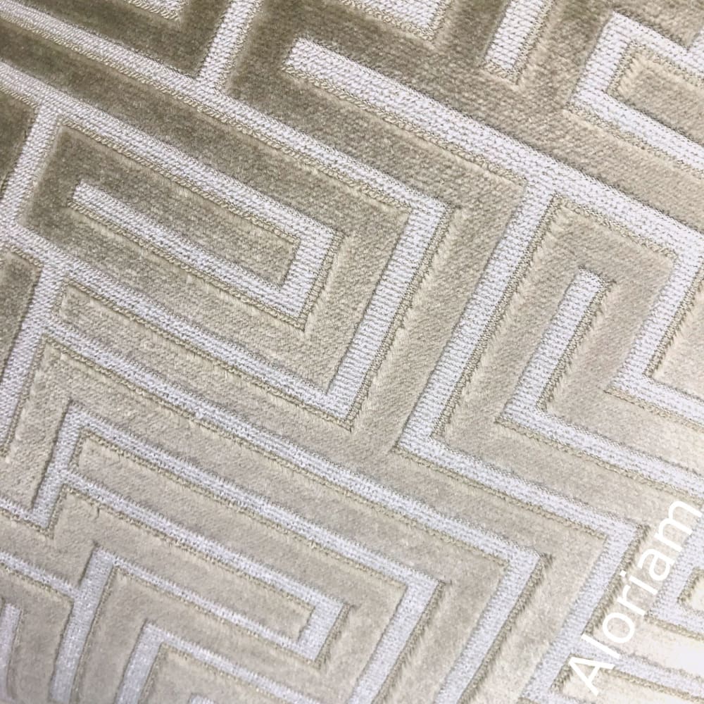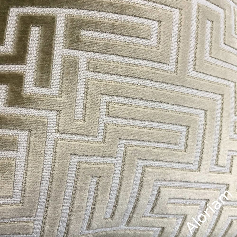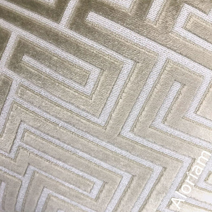 The Eugene pillow cover combines luxurious velvet texture with a classical greek key design. The raised geometric maze pattern is woven in a stunning champagne beige against a cream background.