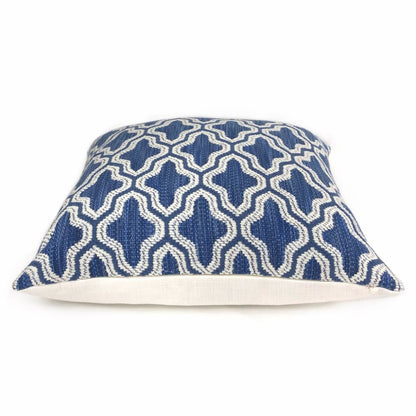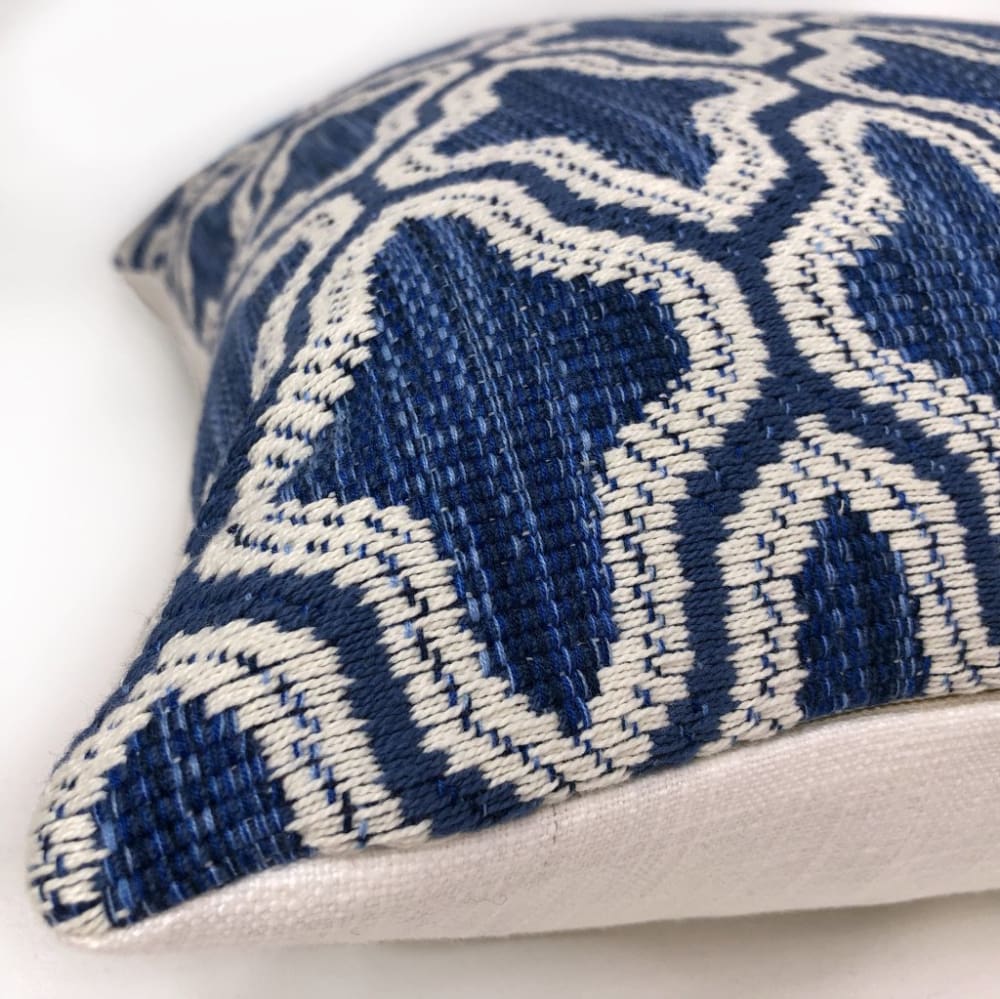 Ezra is a blue and white pillow cover inspired by Moorish tile work designs. This geometric pillow cover brings global sophistication in a classic color combination to any home. Photographed on 19x19 cover (filled with 20x20 insert).