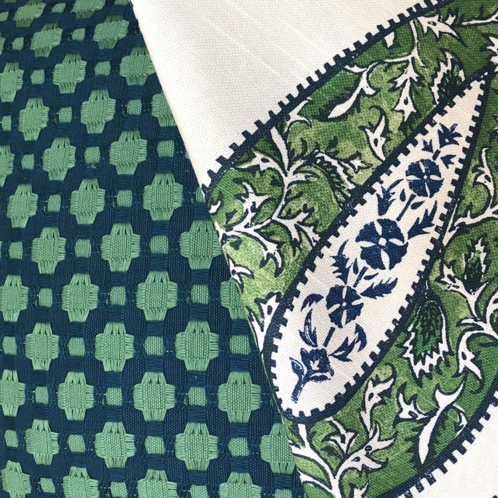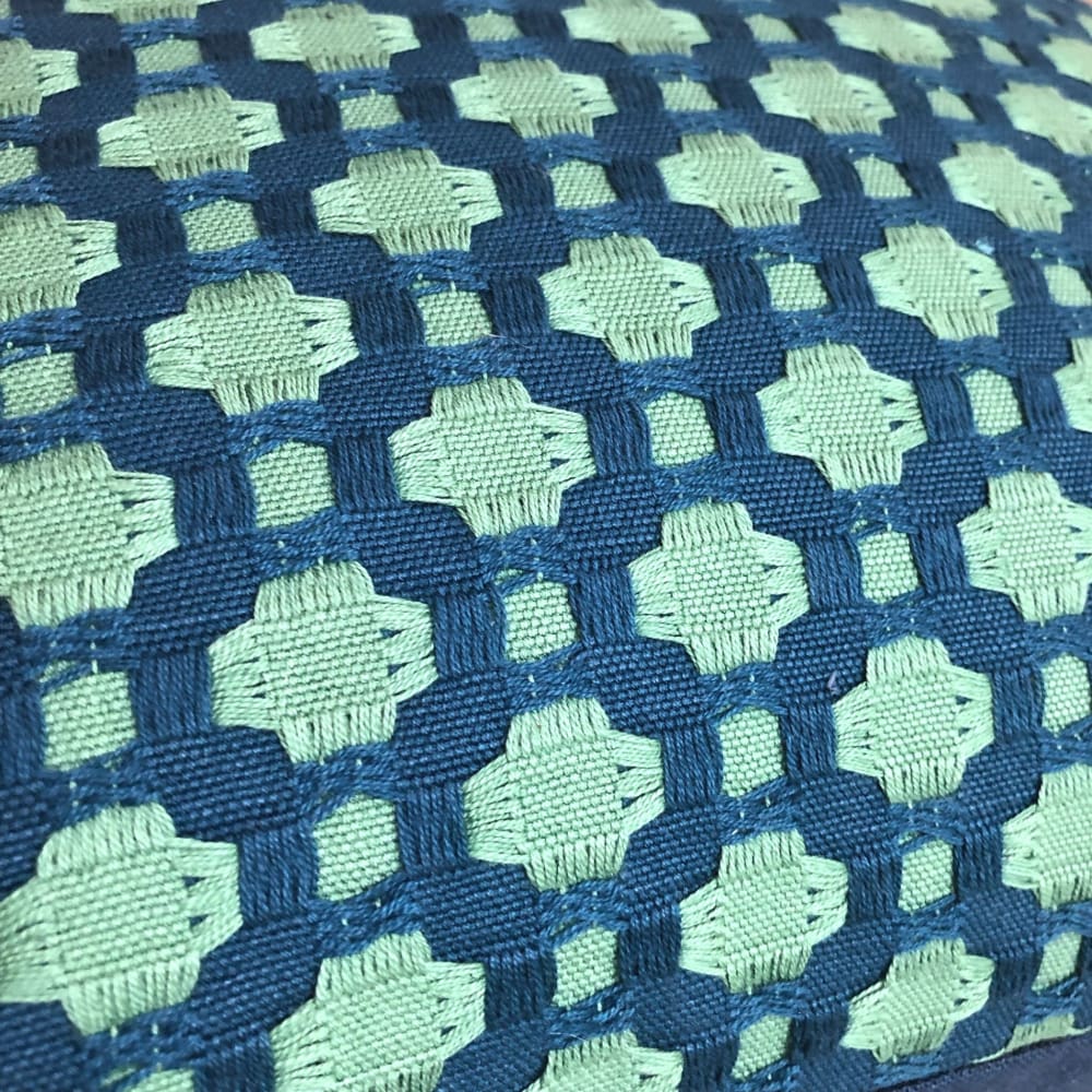Last two! Betwixt is an iconic F Schumacher fabric that has been the star of countless magazine spreads and blog features. This pillow cover in their peacock/seaglass colorway combines small checks in a textured weave in a beguiling combination of blue and green. The Betwixt pillow cover is amazing as a contrast to large scale and abstract patterns.