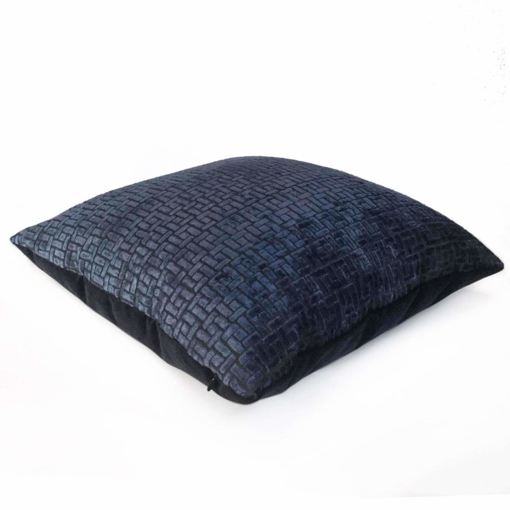 Bari is a gorgeous ink blue velvet pillow cover featuring a classic lattice geometric pattern.