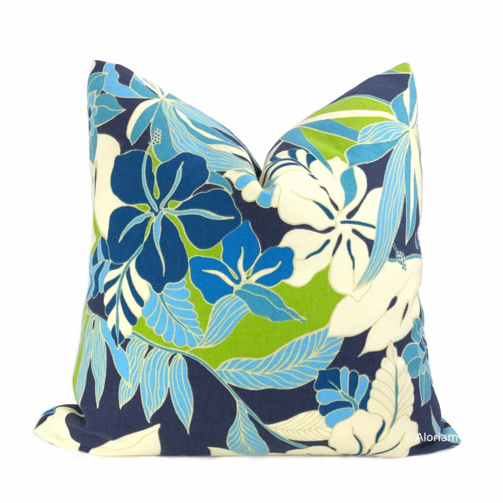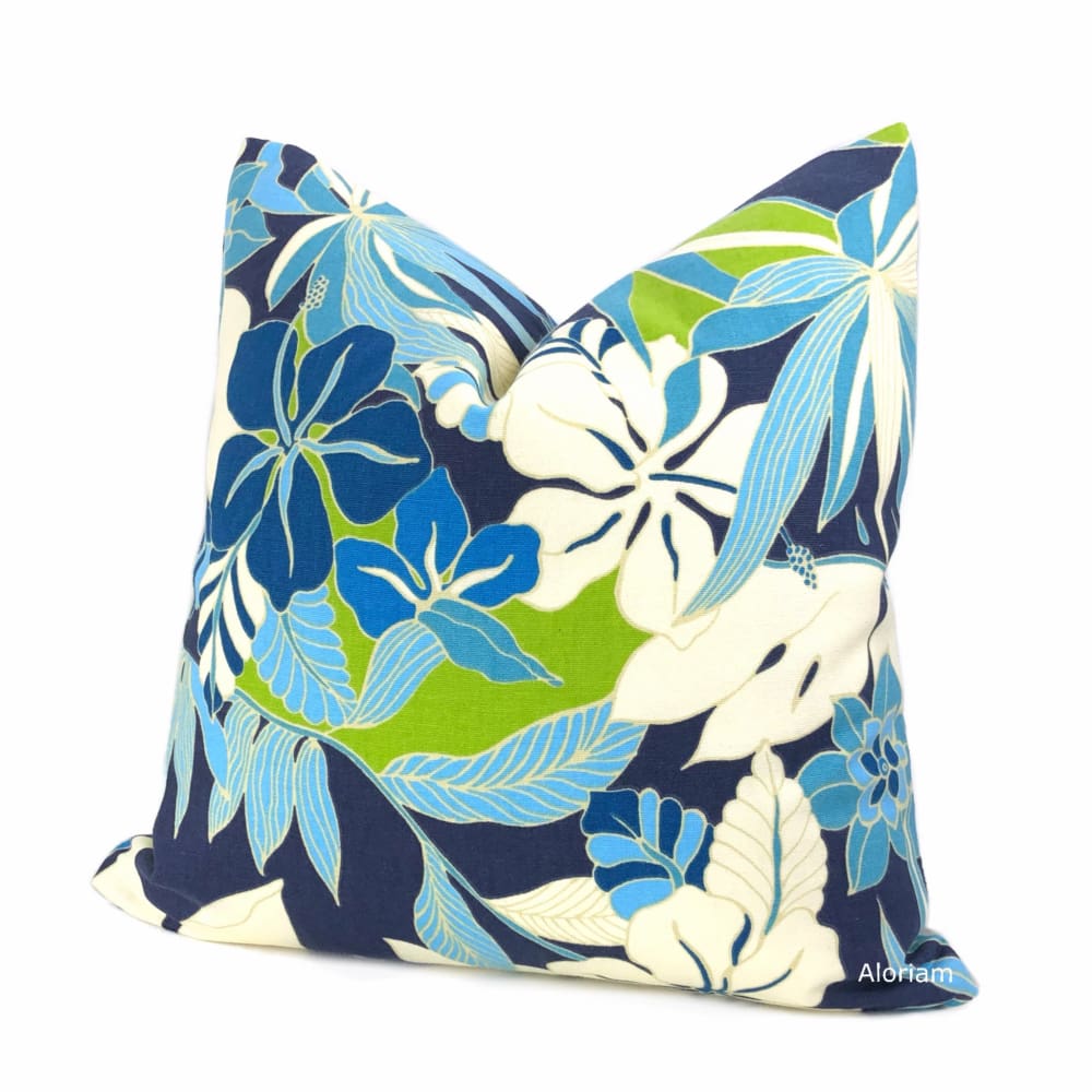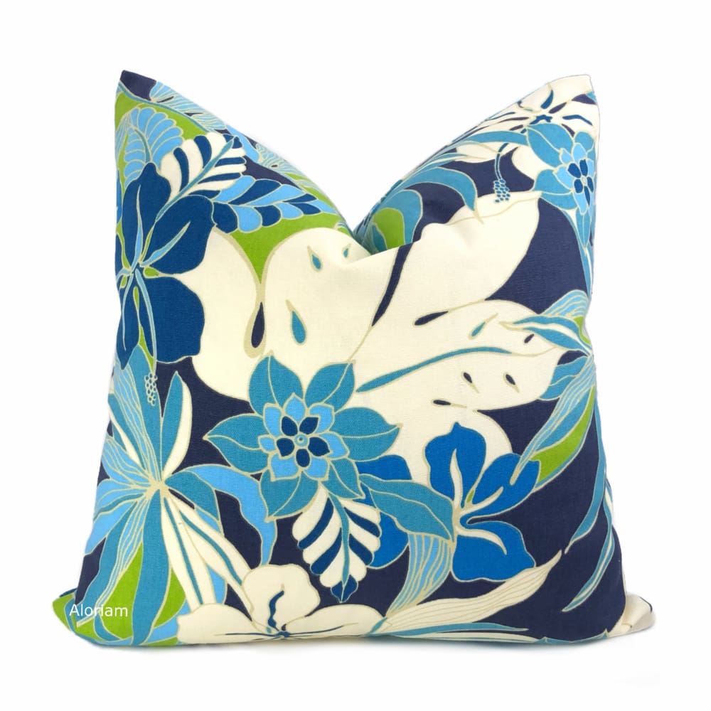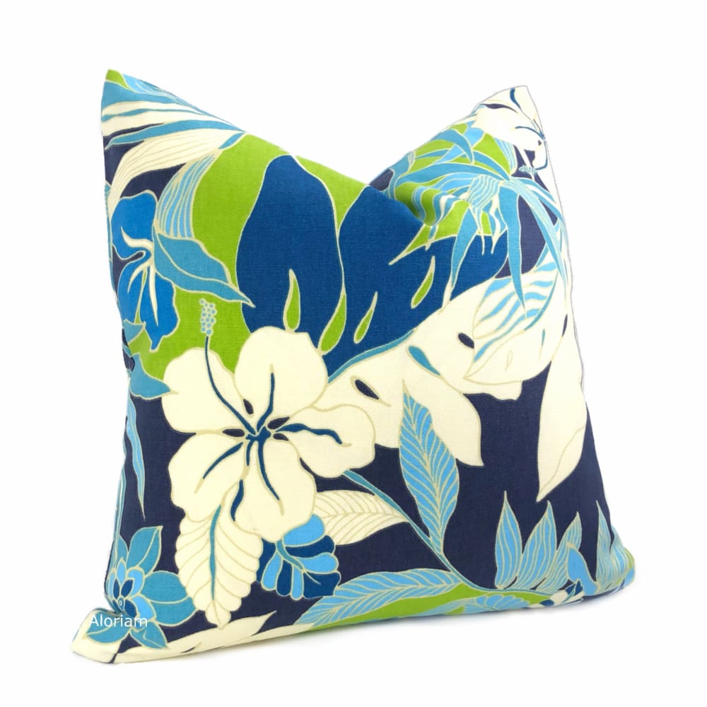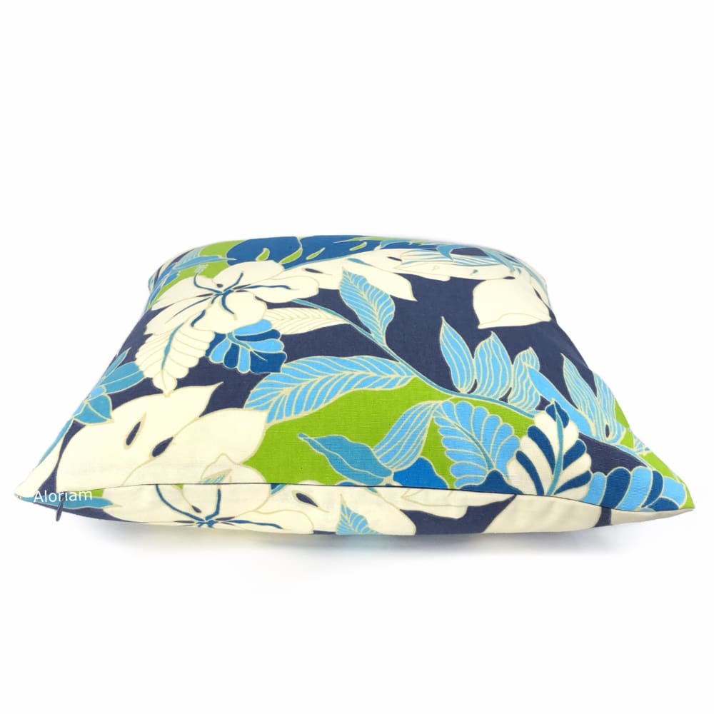 The Fiji pillow cover is a glorious tropical floral print in blues, greens and creamy white. This modern floral design is perfect for any contemporary casual interior. Photographed on 17x17 cover (filled with 18x18 insert). Designer cotton print pattern fabric is used on both sides of the pillow cover.