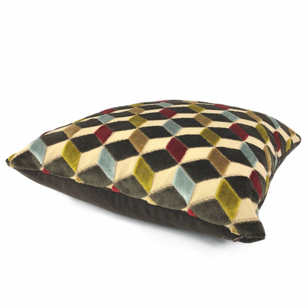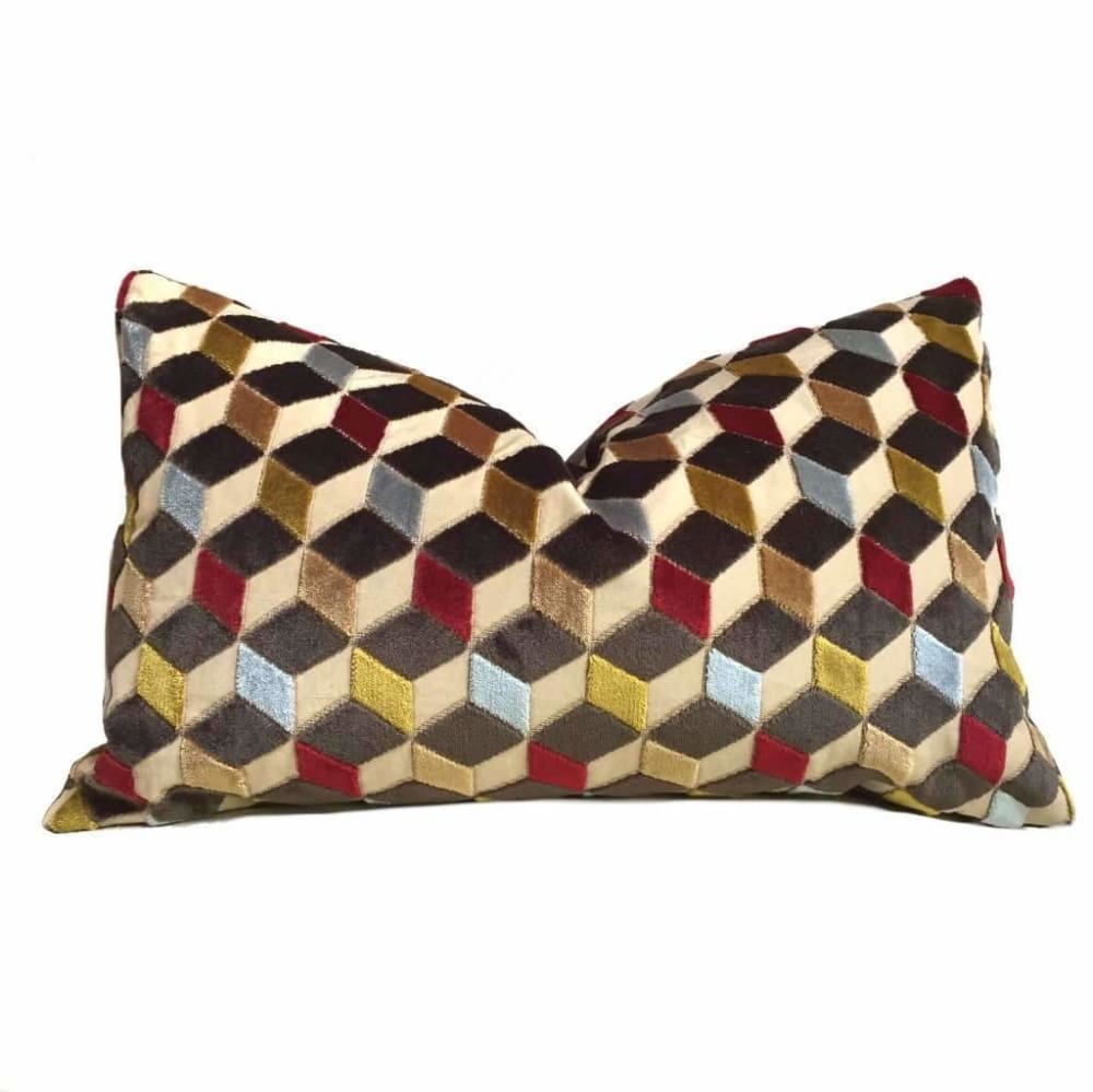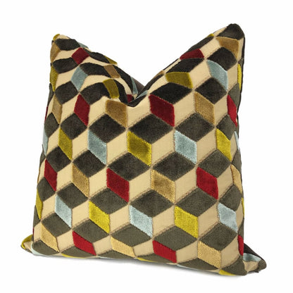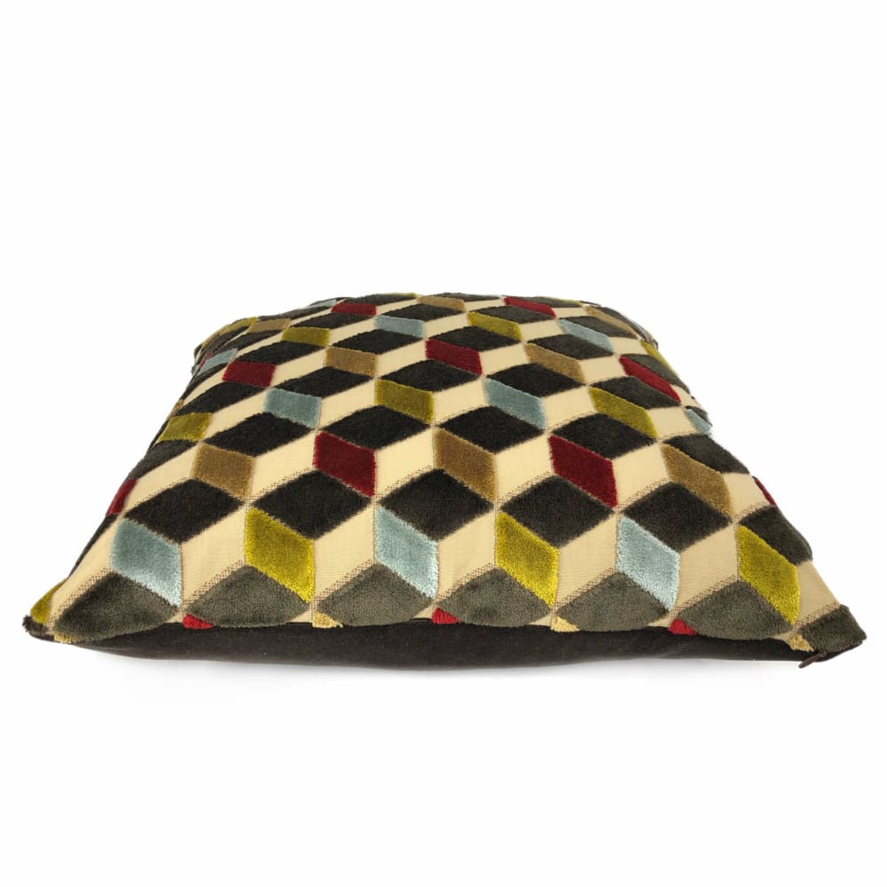 Lush velvet texture meets geometric cube forms in this eye catching cut velvet pillow cover. Dark espresso brown, sky blue, ruby red and golden brown velvet woven on a beige background come together in this dynamic 3-dimensional design.