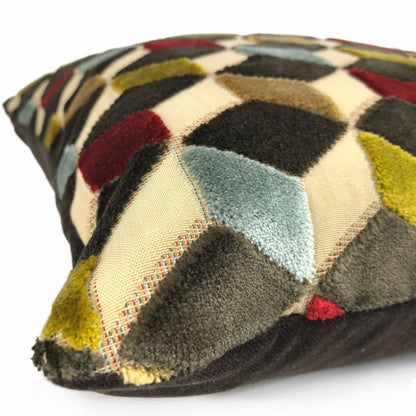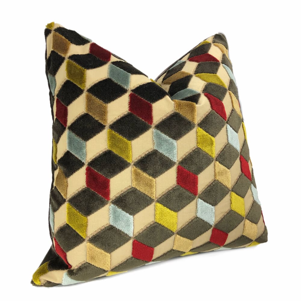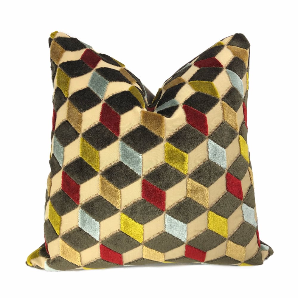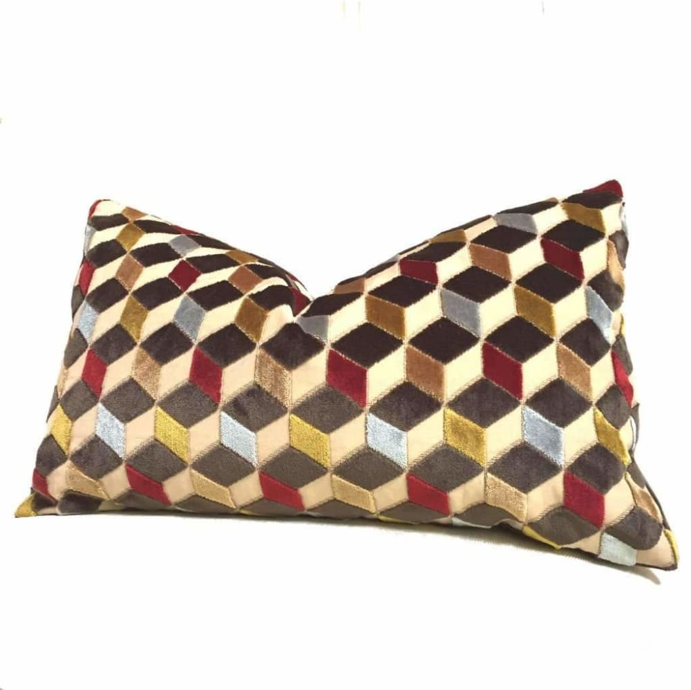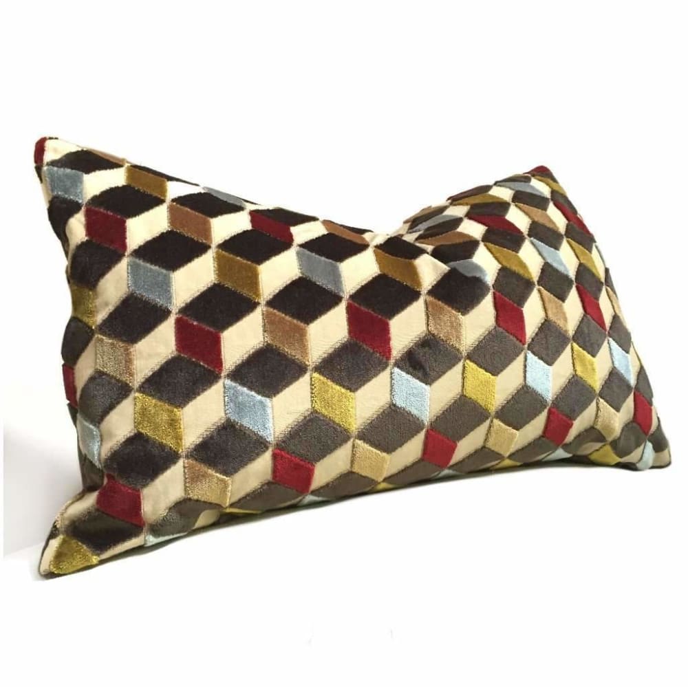 Lush velvet texture meets geometric cube forms in this eye catching cut velvet pillow cover. Dark espresso brown, sky blue, ruby red and golden brown velvet woven on a beige background come together in this dynamic 3-dimensional design.