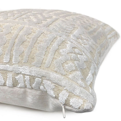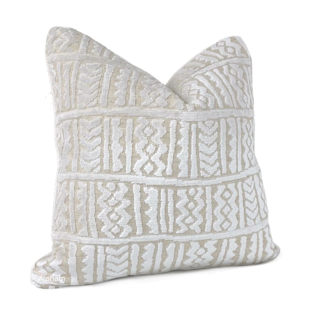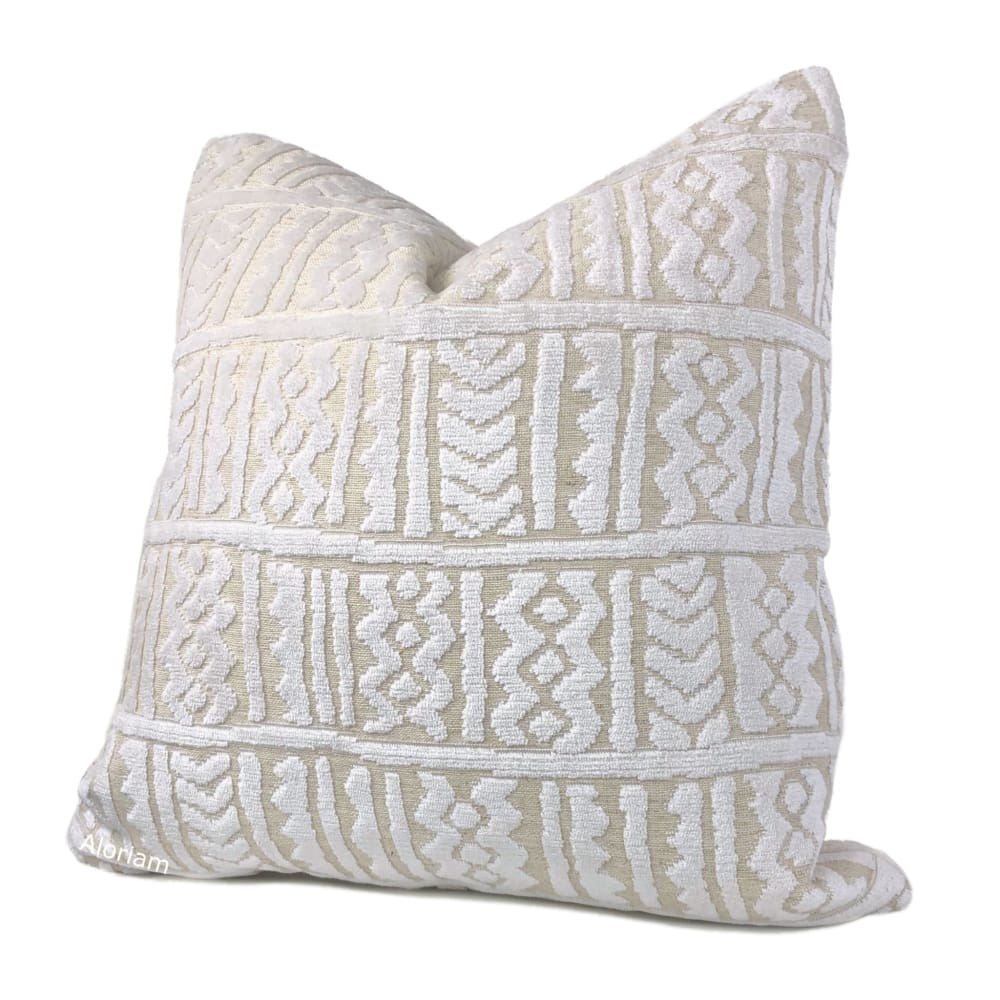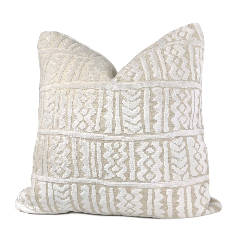 Giza is a warm white cut velvet pillow cover featuring an ethnic inspired design.