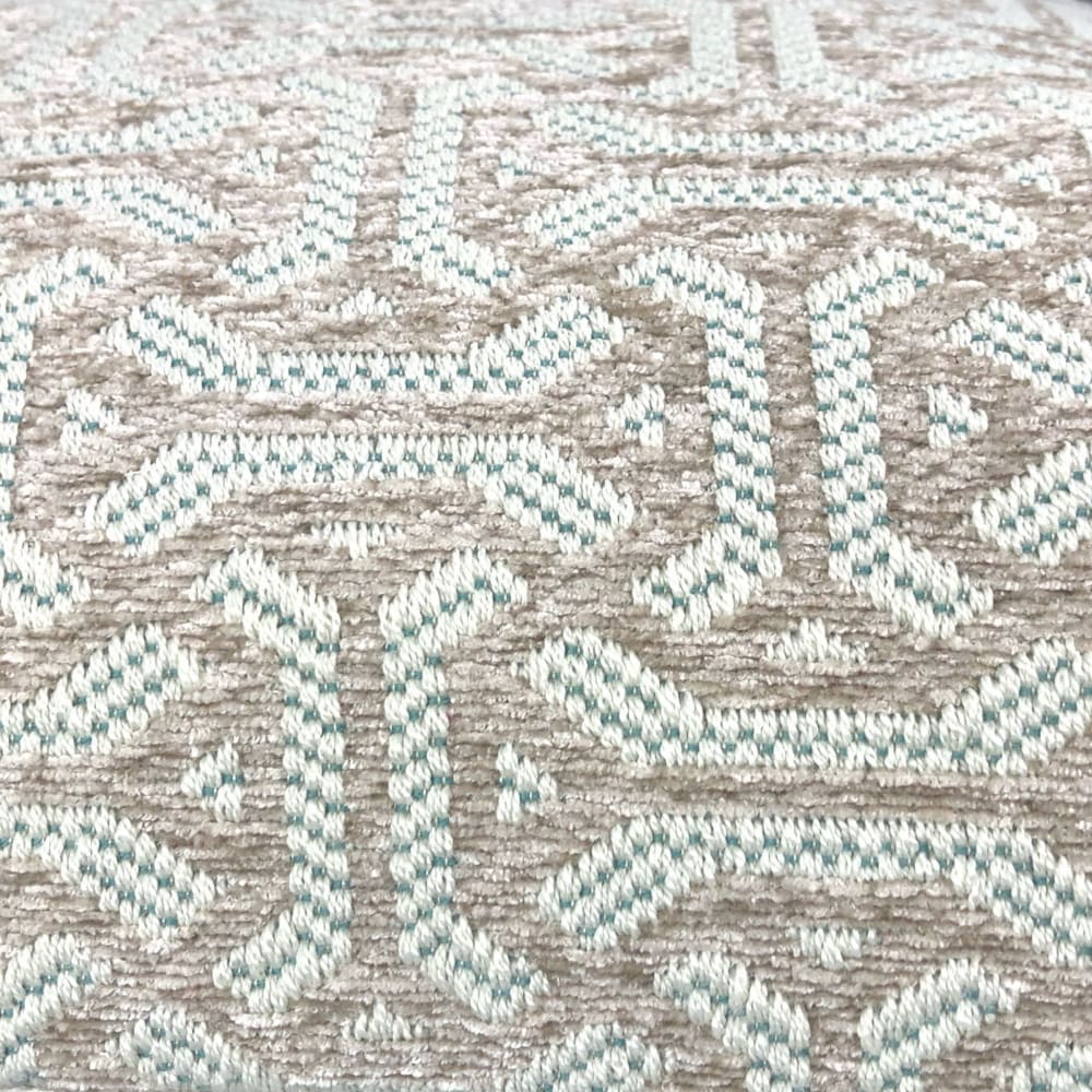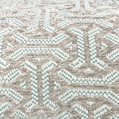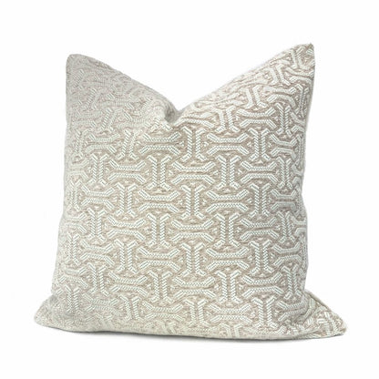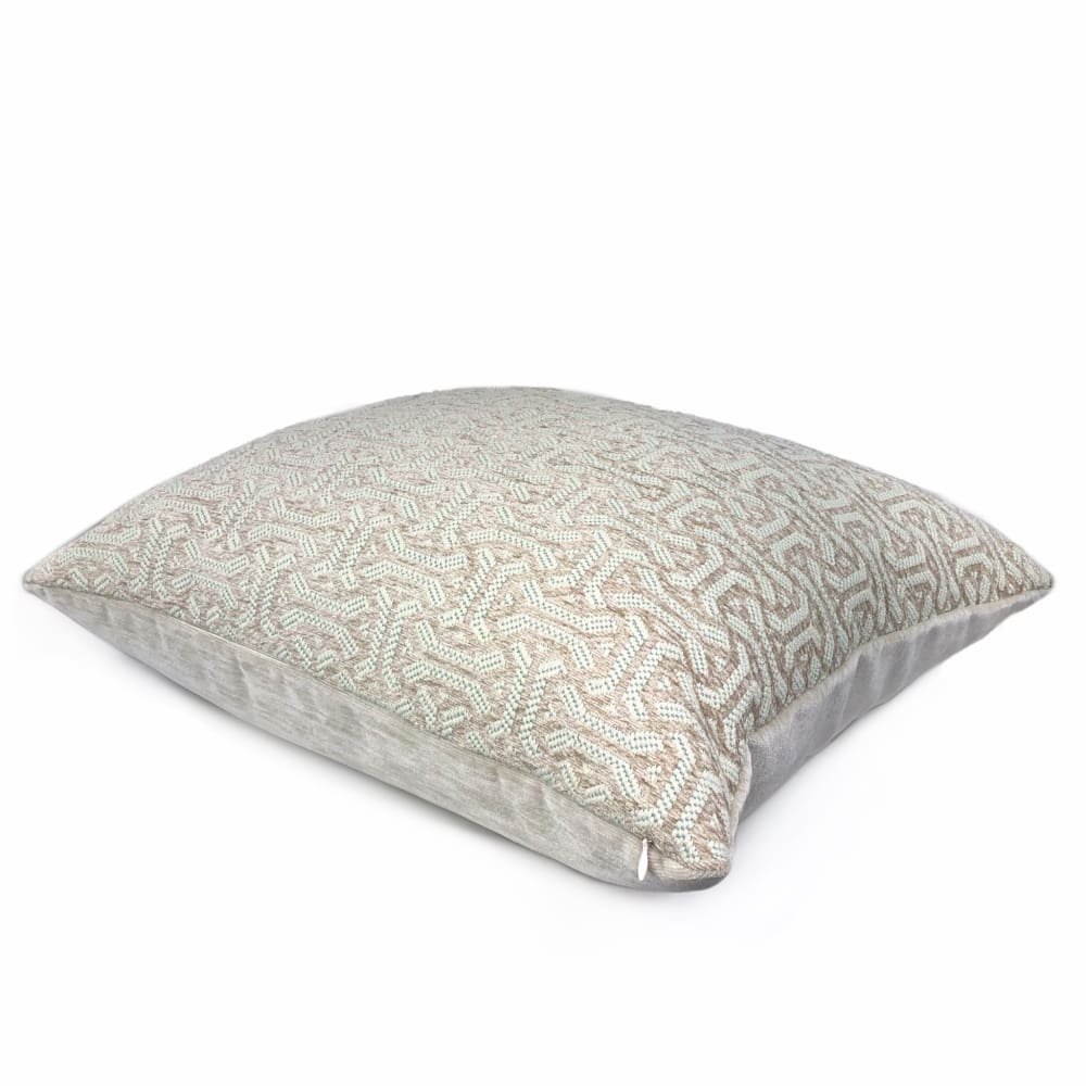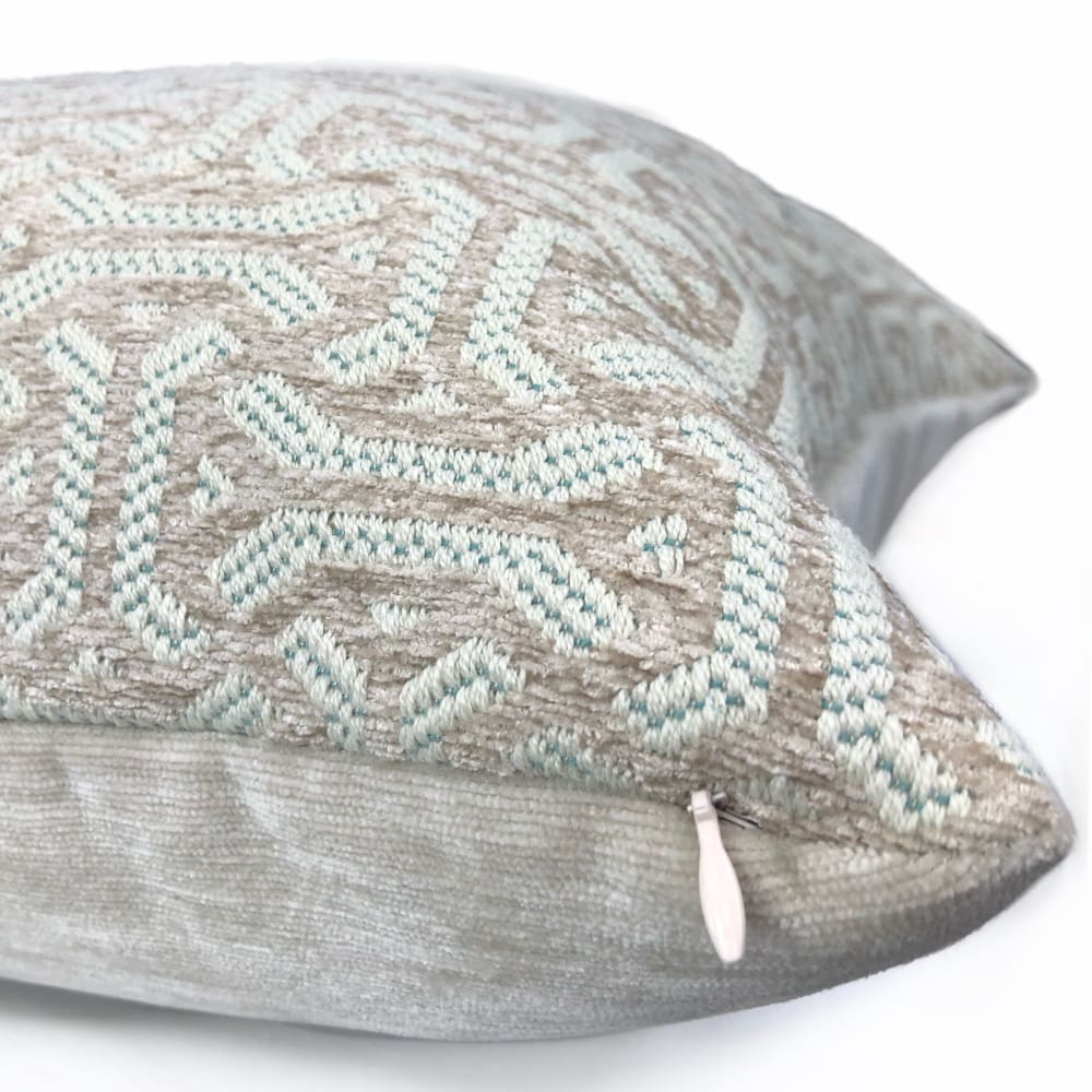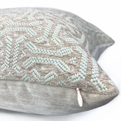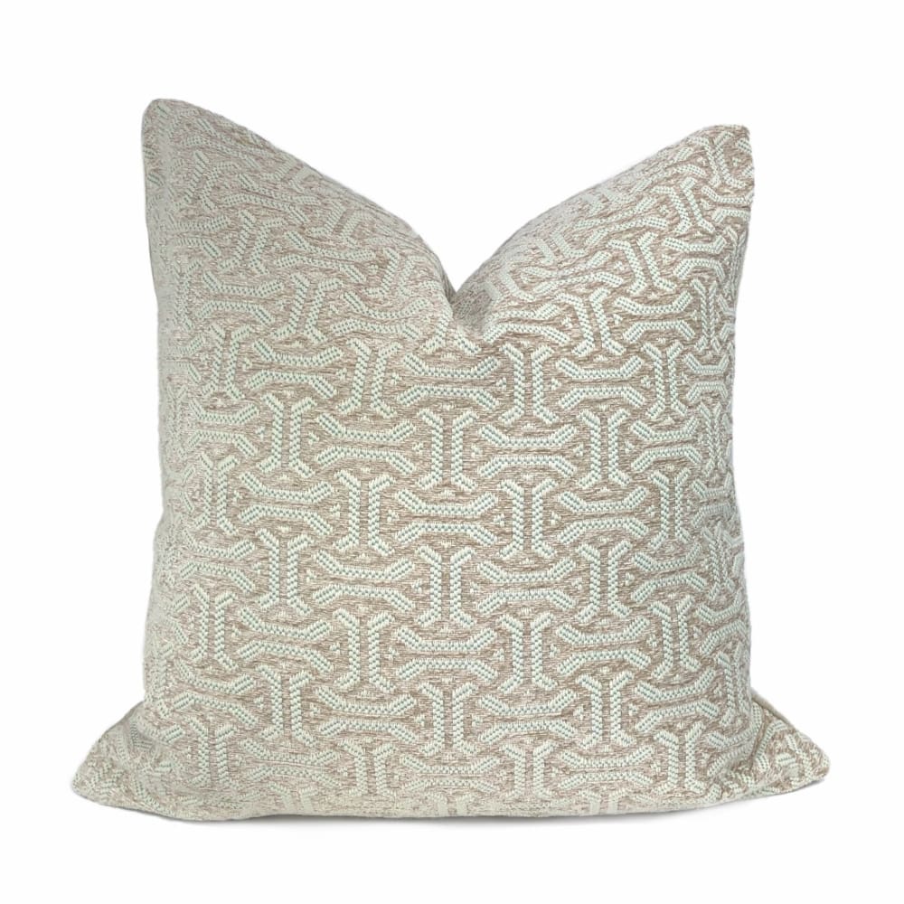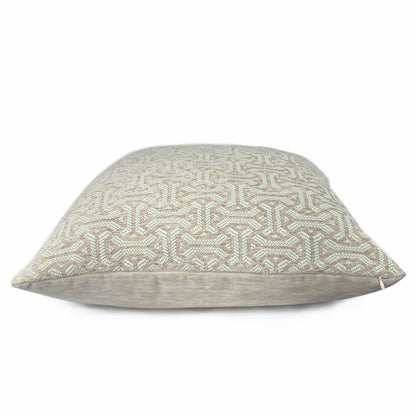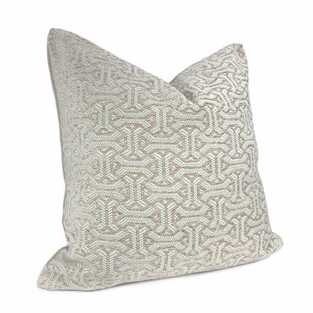 The Gramercy pillow features a classic geometric pattern woven in pale aqua green and light taupe. Choose from the designer pattern fabric on both sides or with a coordinating solid backside. Photographed on 19x19 cover (filled with 20x20 insert).