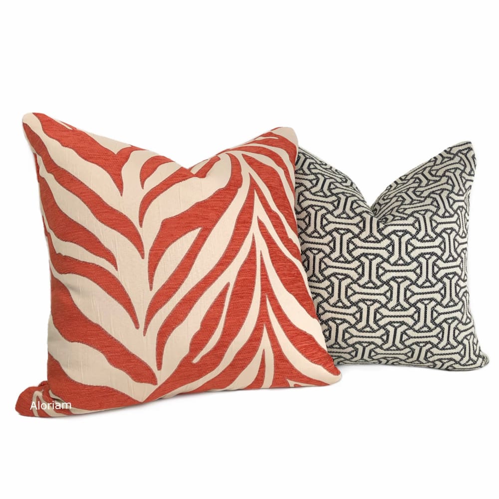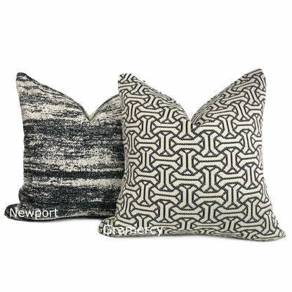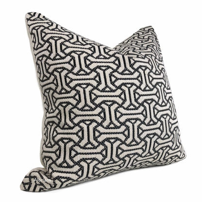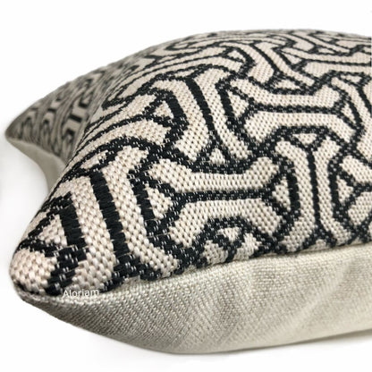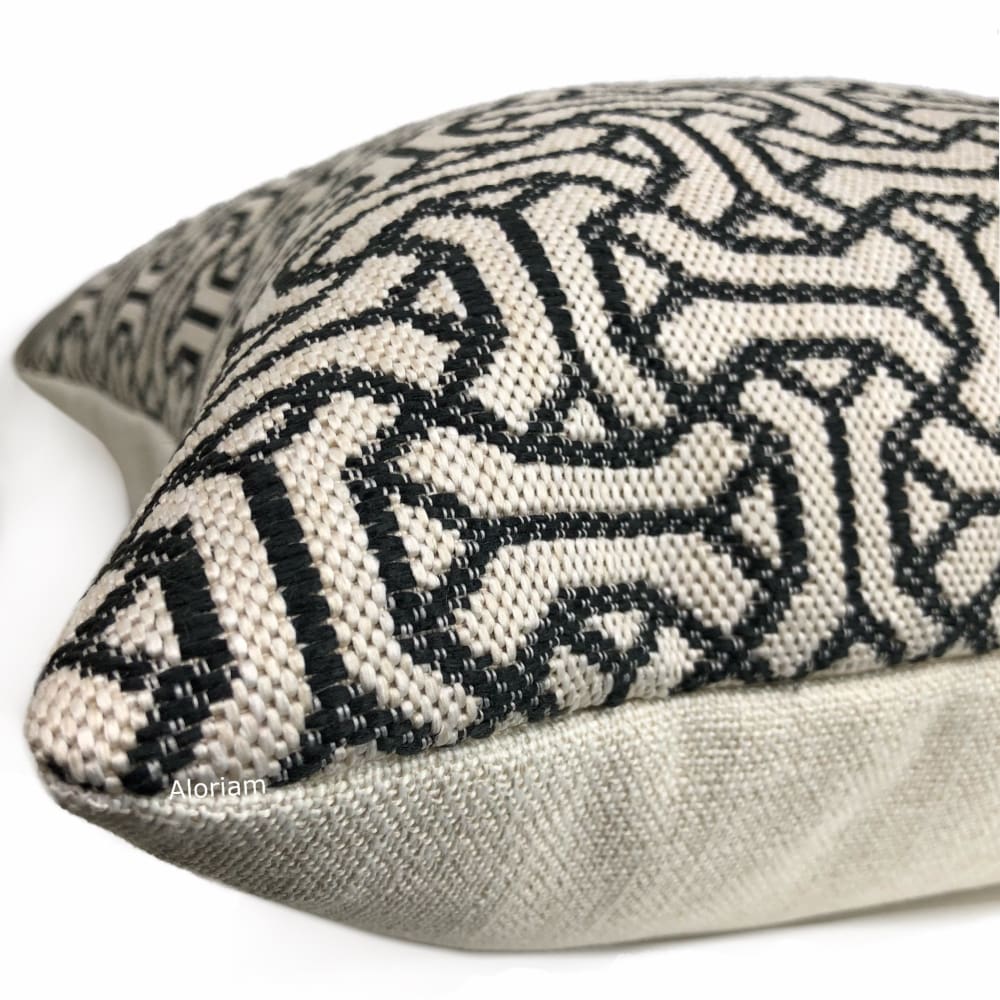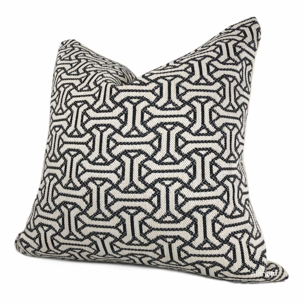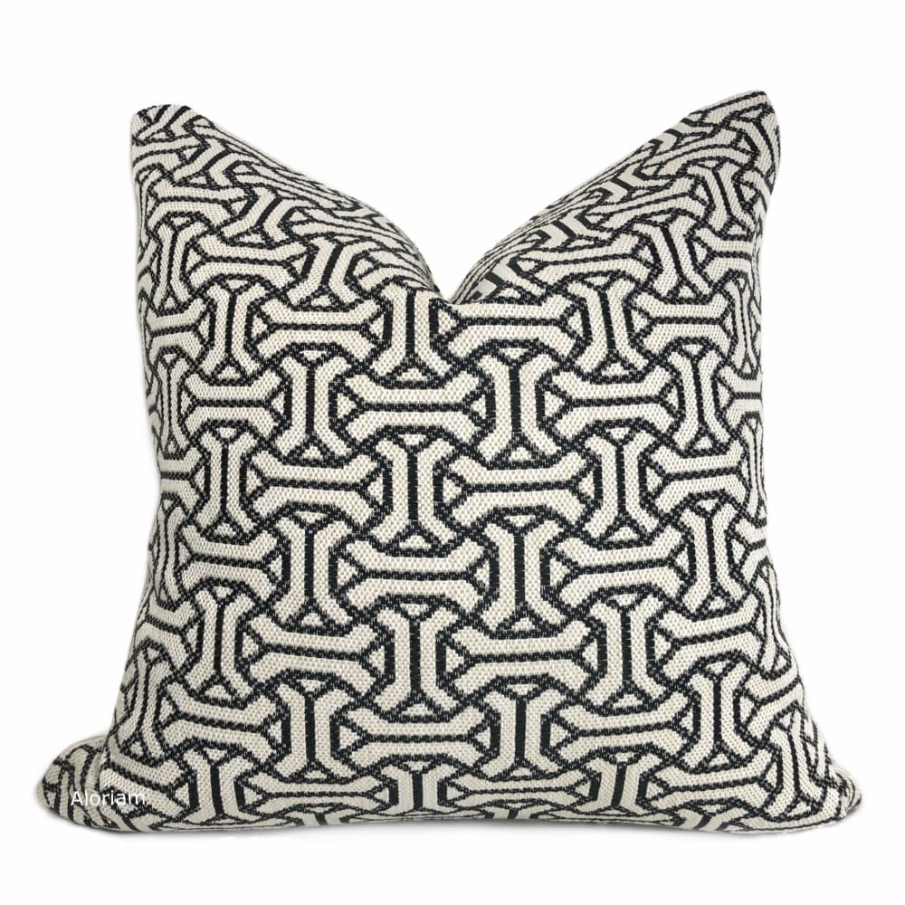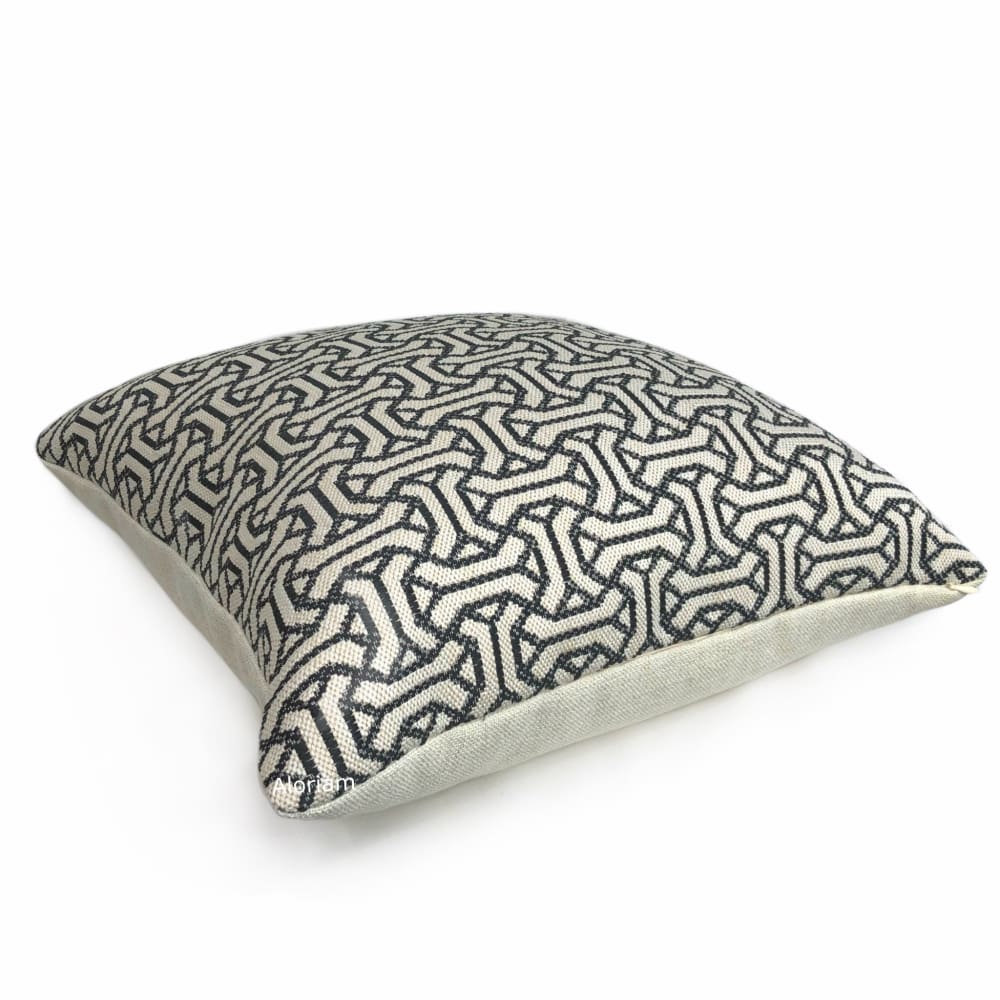 The Gramercy II pillow features a classic geometric pattern woven in black and cream. Choose from the designer pattern fabric on both sides or with a coordinating solid backside. Photographed on 19x19 cover (filled with 20x20 insert).