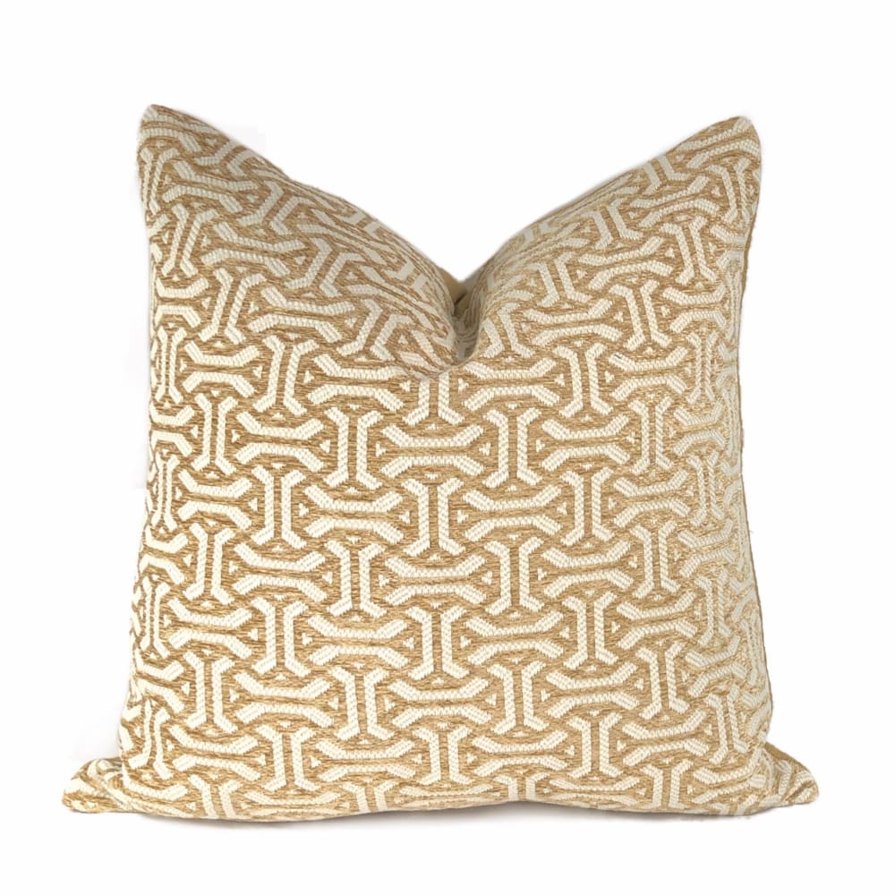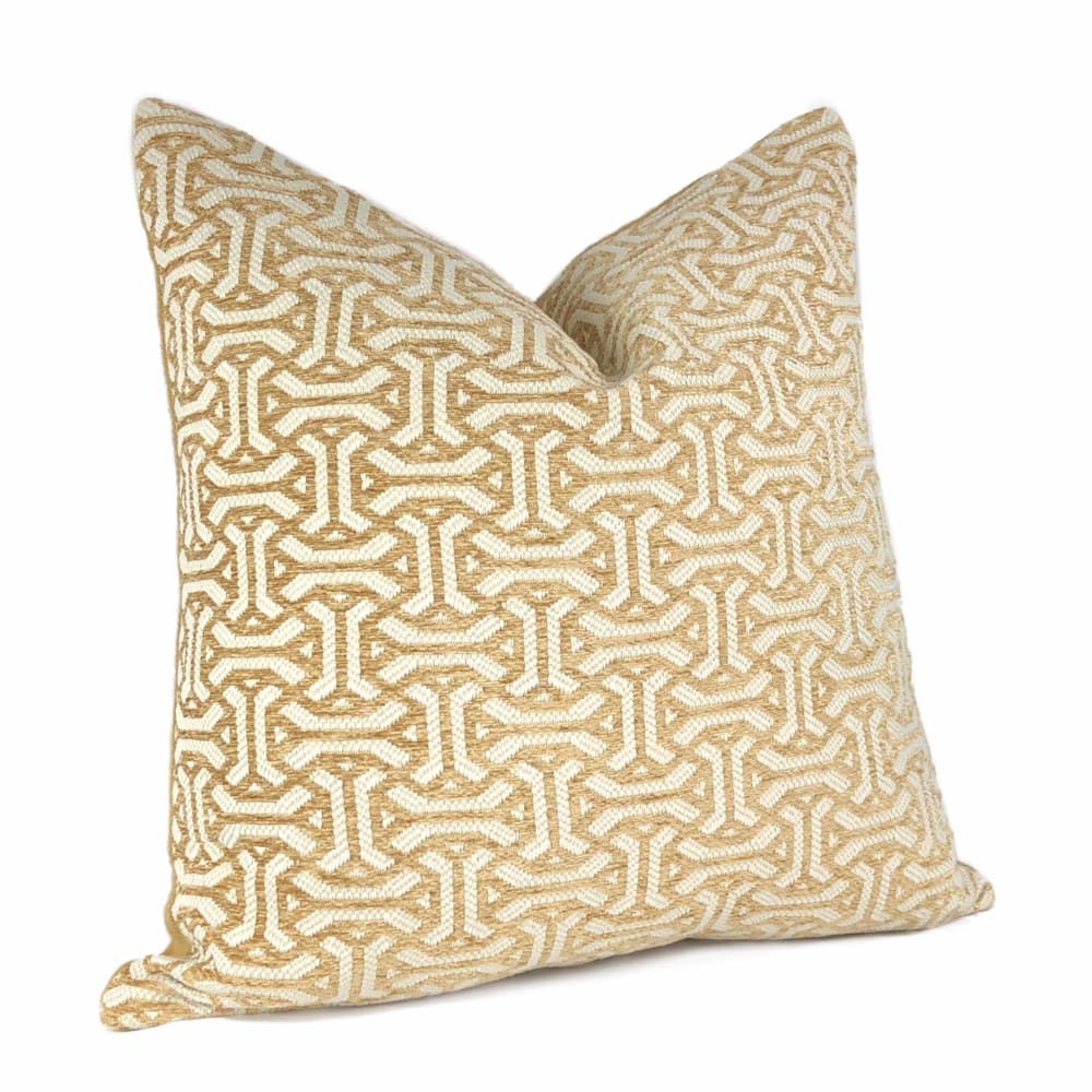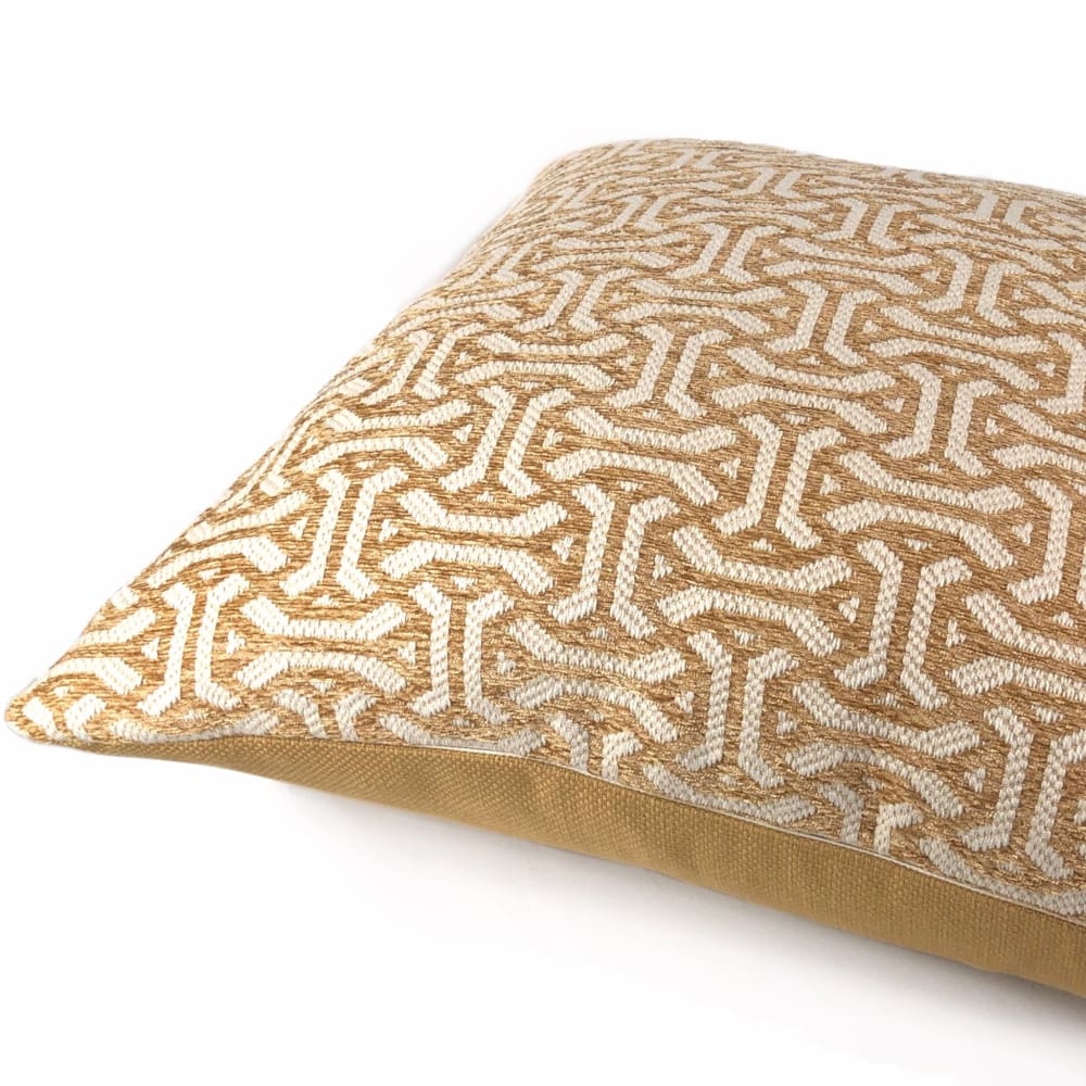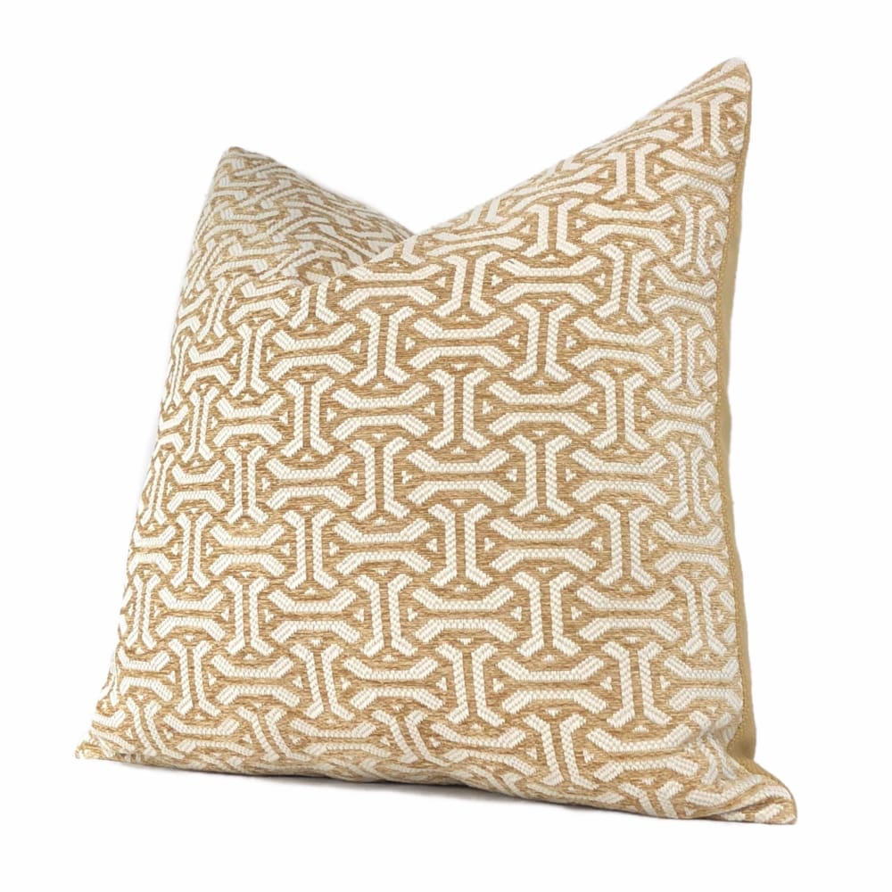 The Gramercy pillow features a classic geometric pattern woven in golden brown and cream. Choose from the designer pattern fabric on both sides or with a coordinating solid backside. Photographed on 20.5x20.5 cover (filled with 22x22 insert).