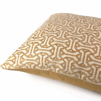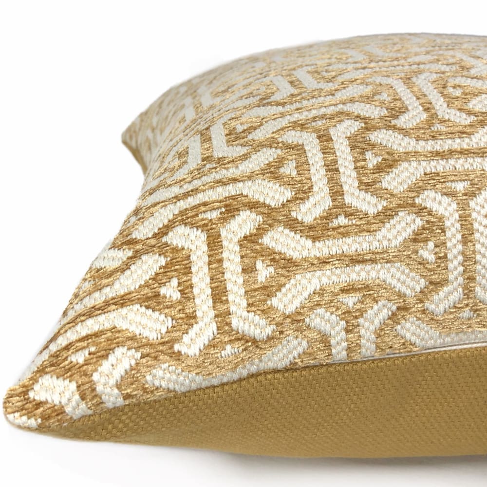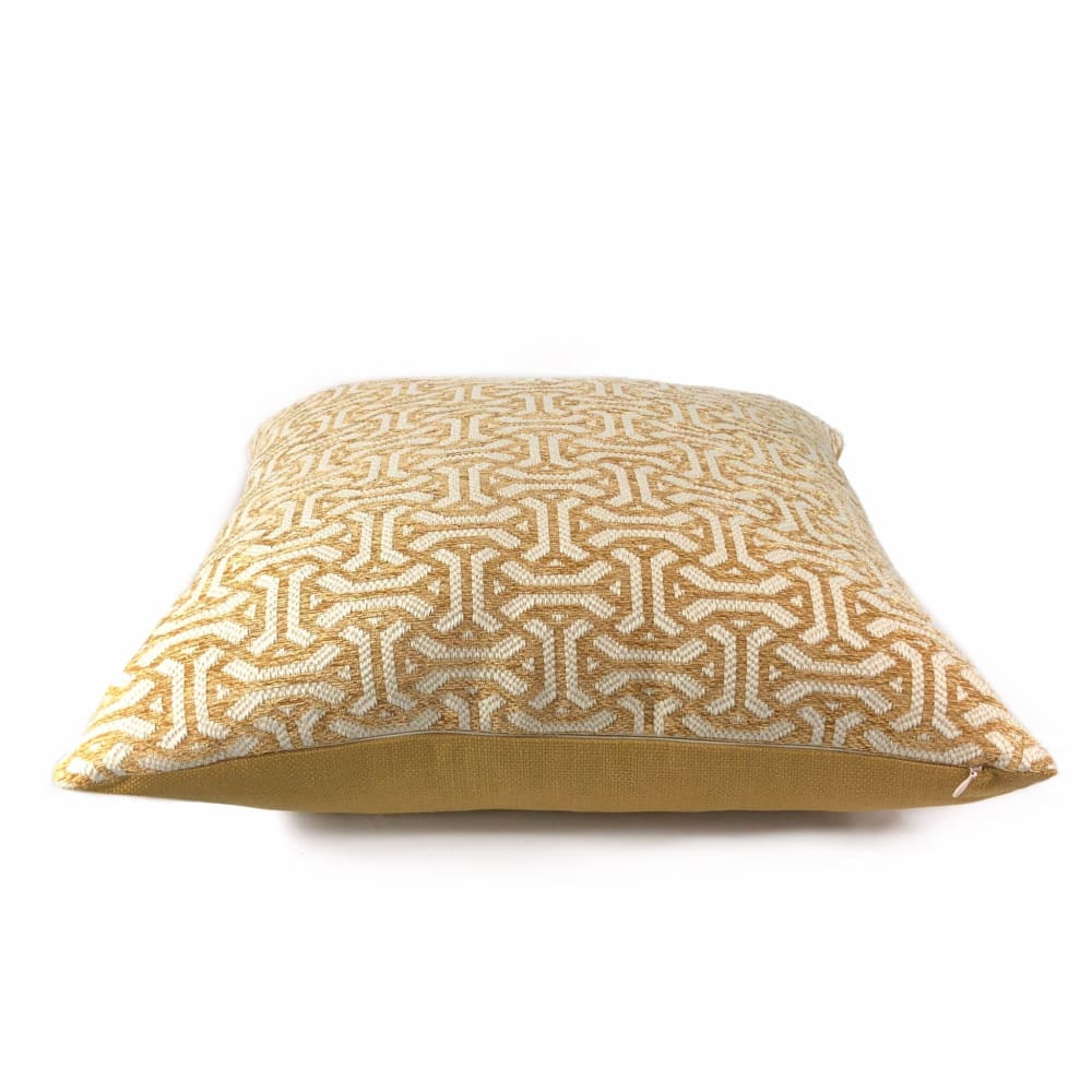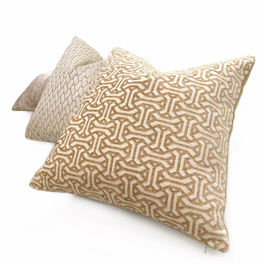 The Gramercy pillow features a classic geometric pattern woven in golden brown and cream. Choose from the designer pattern fabric on both sides or with a coordinating solid backside. Photographed on 20.5x20.5 cover (filled with 22x22 insert).