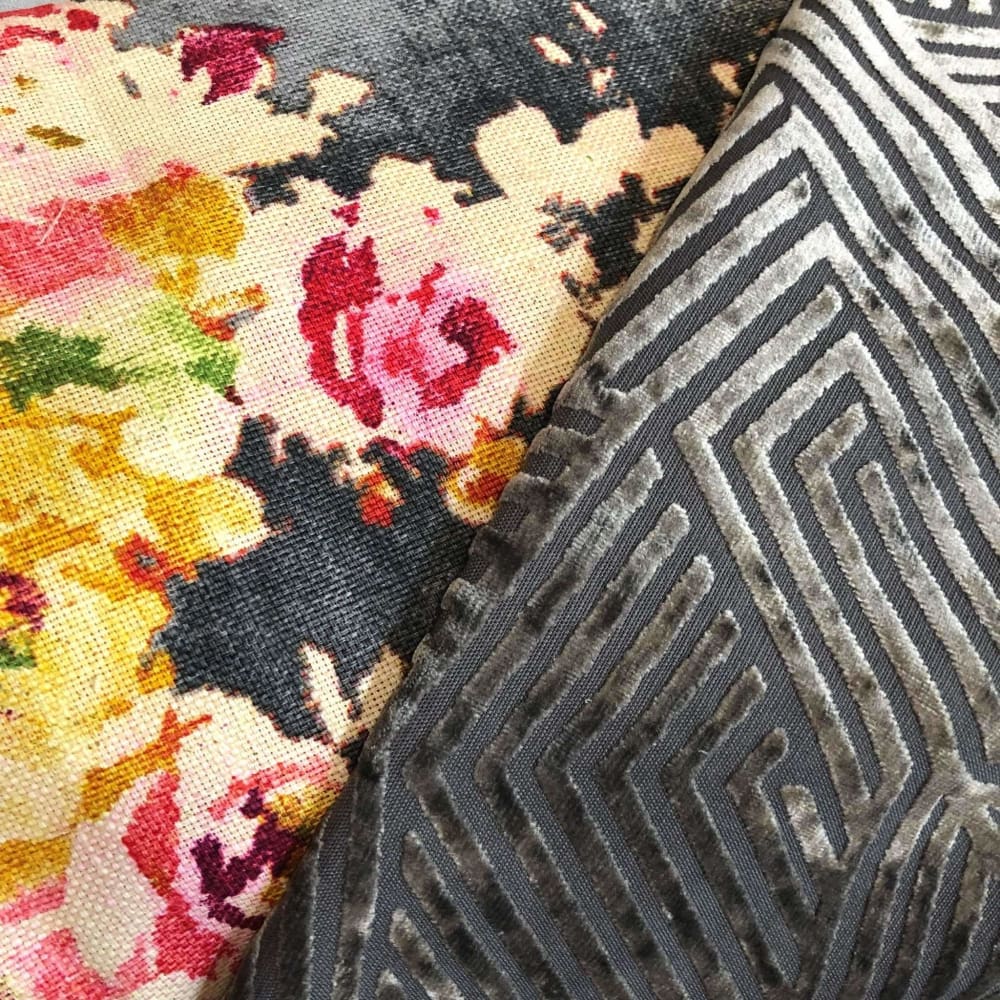 The designer pattern fabric is 75% cotton 25% linen and is used on both sides. Photographed on 19x19 cover (filled with 20x20 insert).