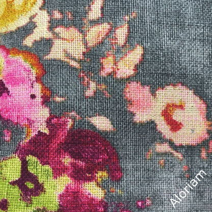 This voluptuous floral pillow cover will do Aphrodite, the Greek goddess of love, proud! The large blooms are printed in muted colors of green and pink on a medium gray background.