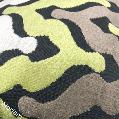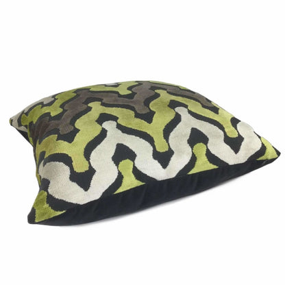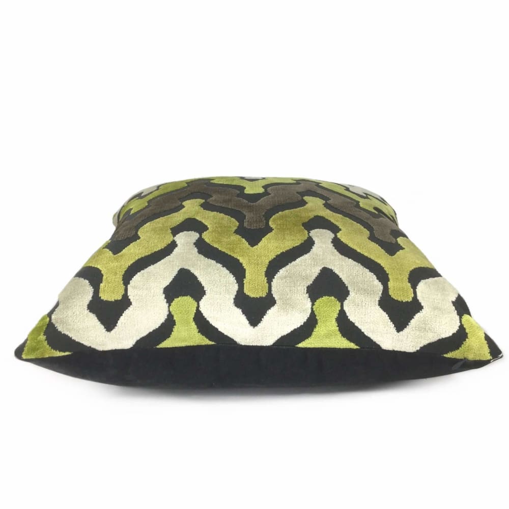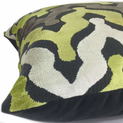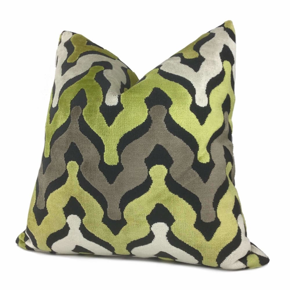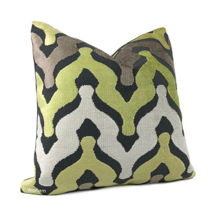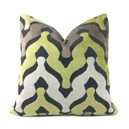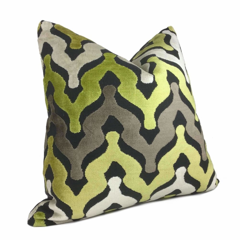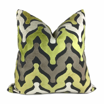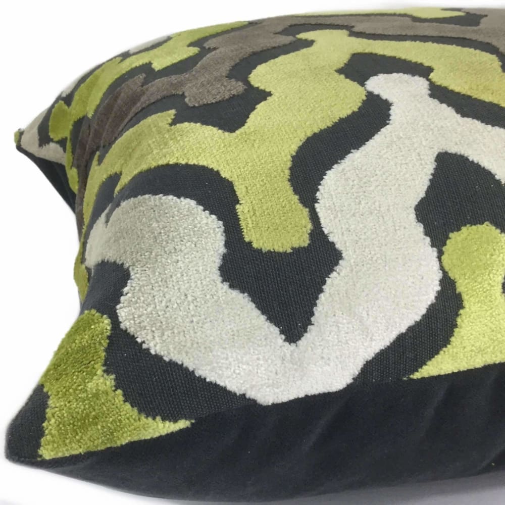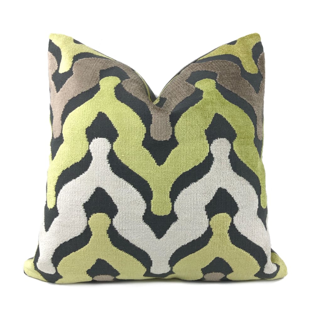 Wow your guests with some pillows made in this designer velvet textured fabric. Ogee waves woven in yellow-green, cream and taupe velvet on a matte medium gray background make this pillow an eye catching choice for any décor. Choose from the pattern fabric used on the front side with a coordinating solid gray backside, or the pattern fabric used on both sides.