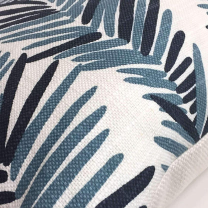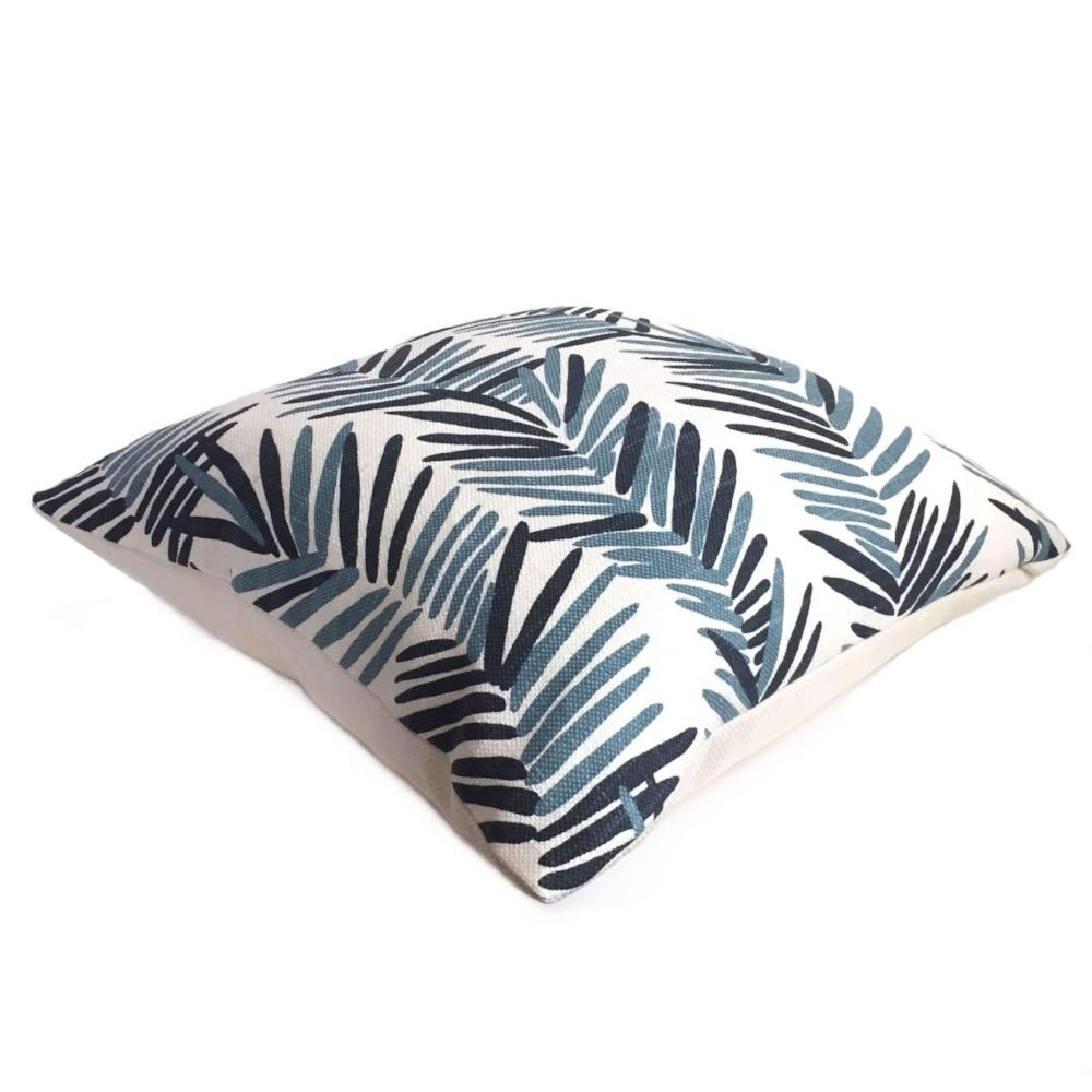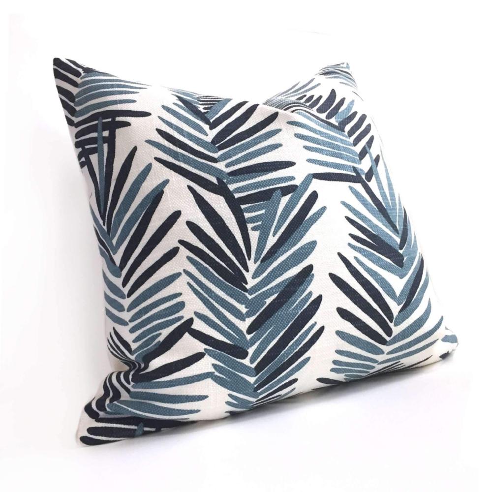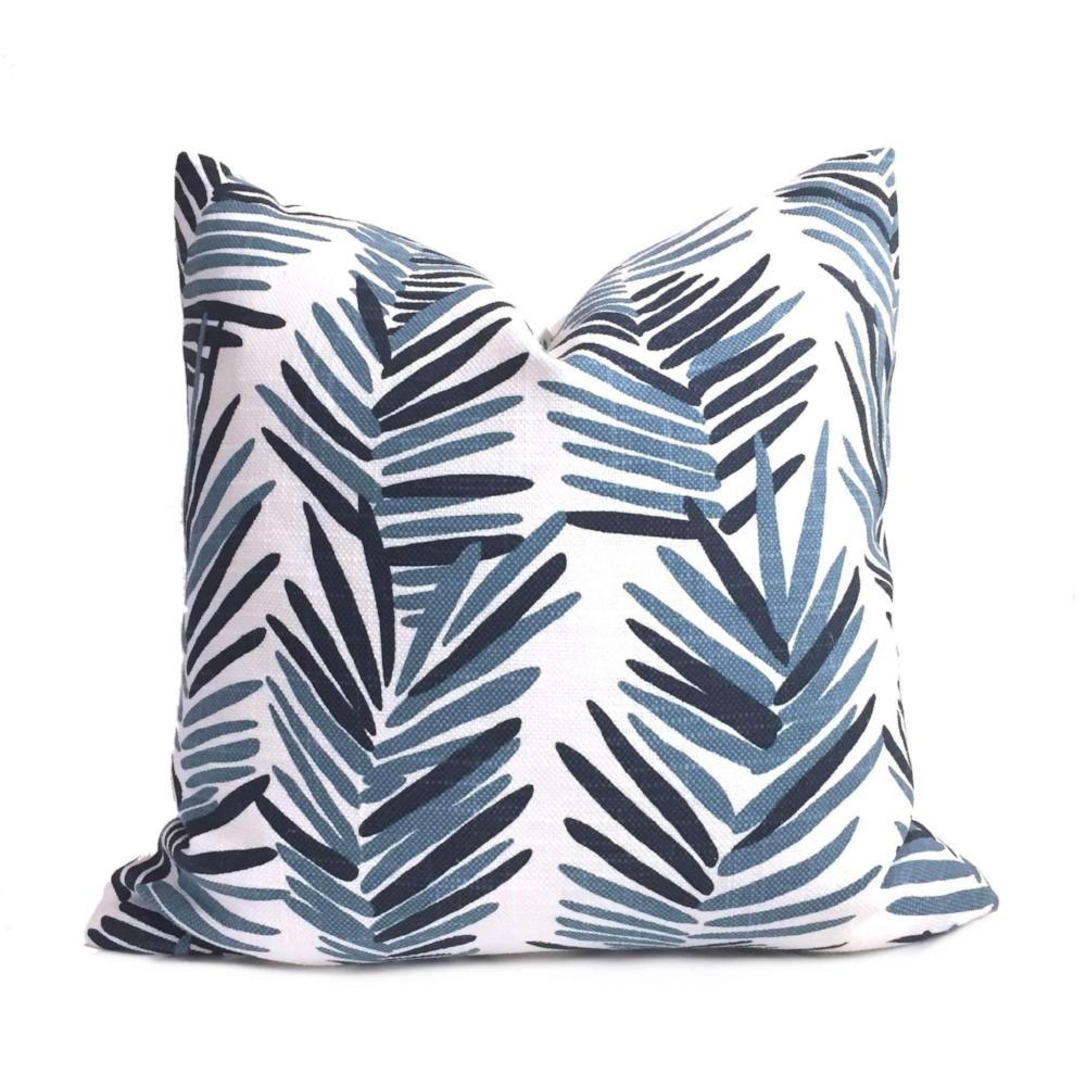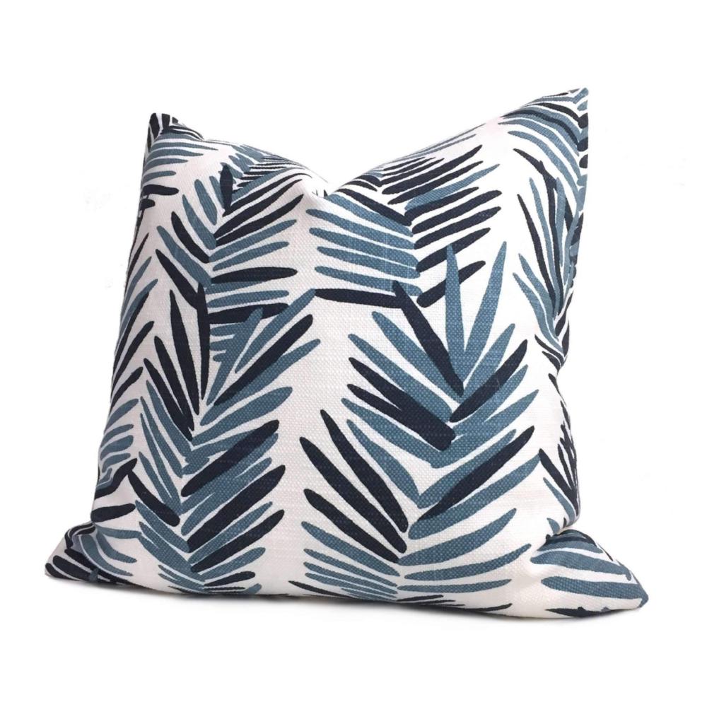 Sewn in a designer fabric by Lulu DK / HC Monogram, this pillow cover is a gorgeous addition to brighten up any décor. The abstract leaf shapes botanical pattern is whimsical and fun! Printed in multiple shades of blue on a white background, the pattern fabric is 75% cotton 25% linen. Choose from the pattern fabric used on the front side with a coordinating solid white upholstery fabric on the backside, or the pattern fabric used on both sides. Photographed on 19x19 cover (filled with 20x20 insert). **This is a special order fabric, please allow extra time for production.**
