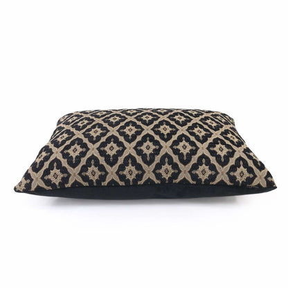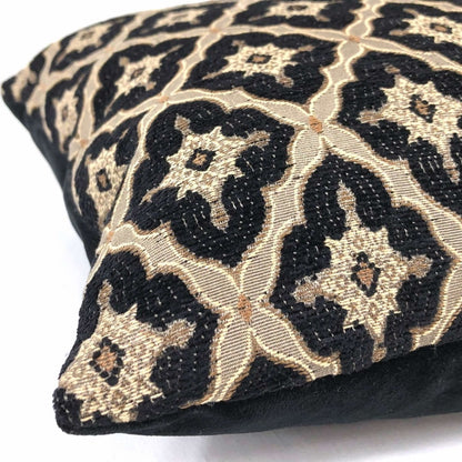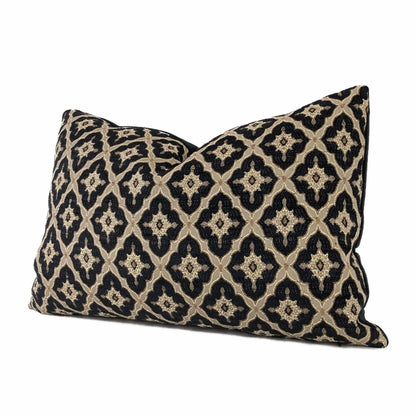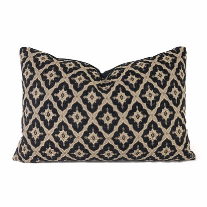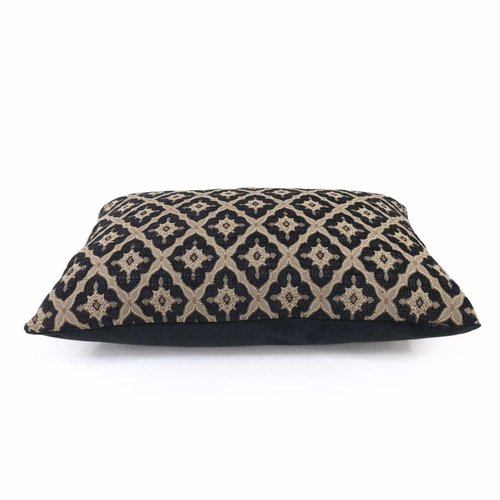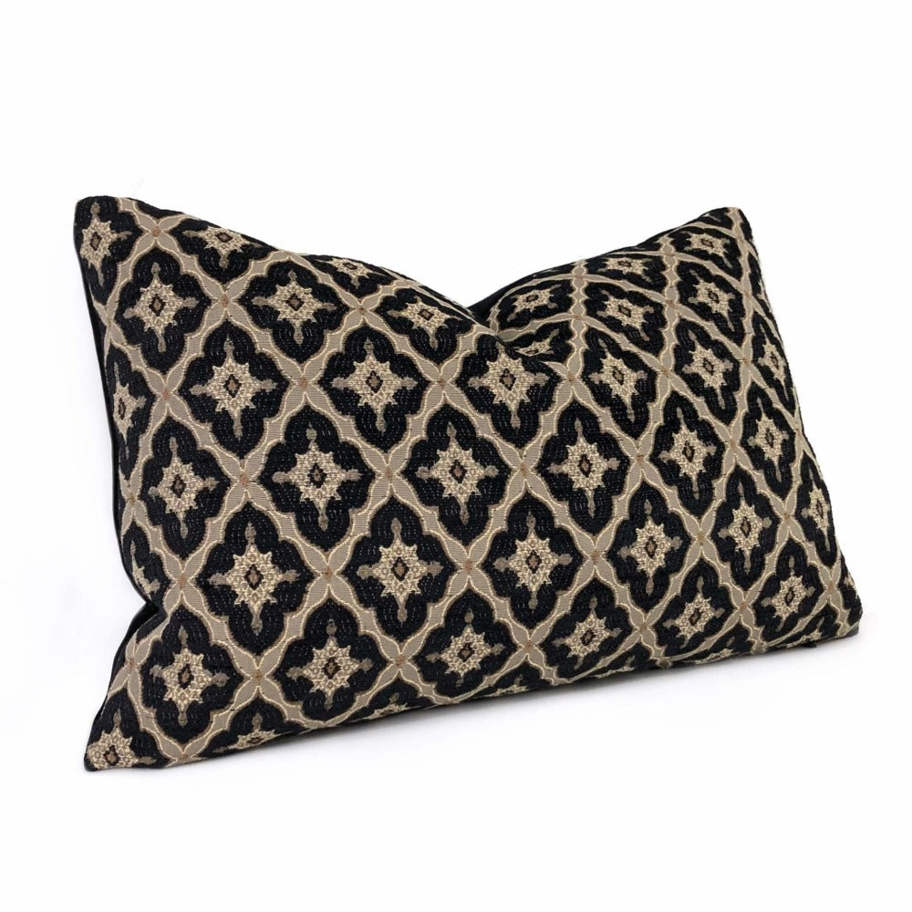 This pillow cover features a designer Highland Court geometric medallion diamond tile pattern in black and linen beige from the traditional Greenwich collection.
