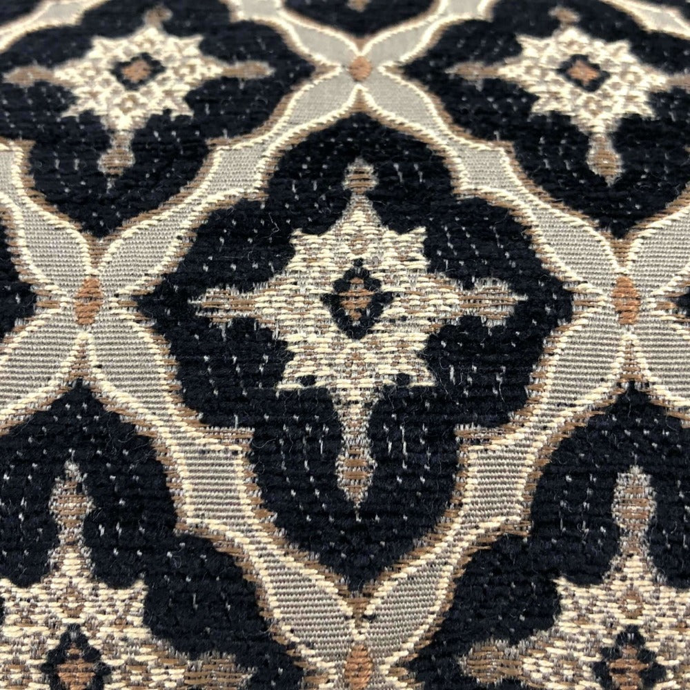 This is a heavy, high quality designer upholstery fabric reversing to a solid black velvet fabric on the backside. Photographed on 12x18 insert. Limited availability!