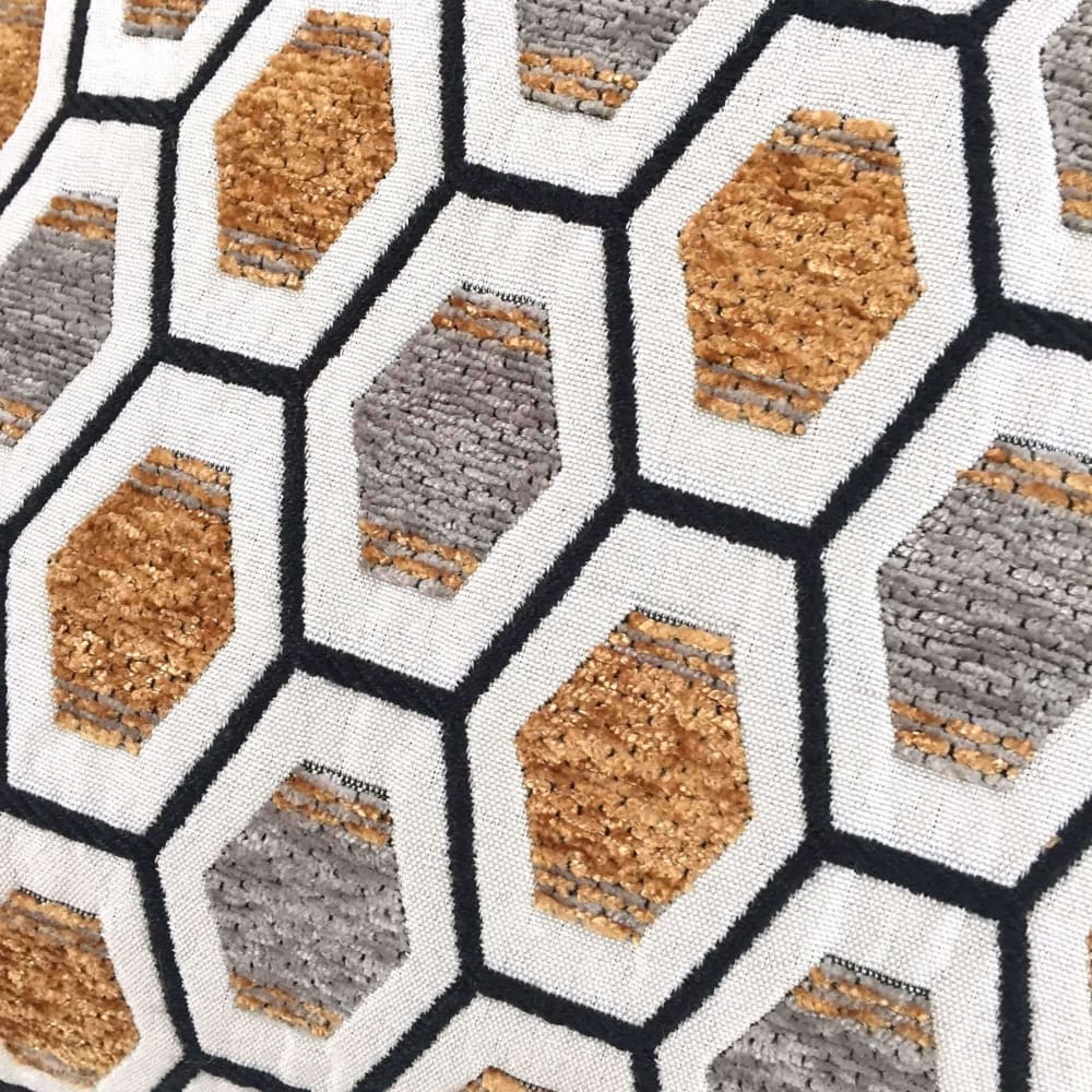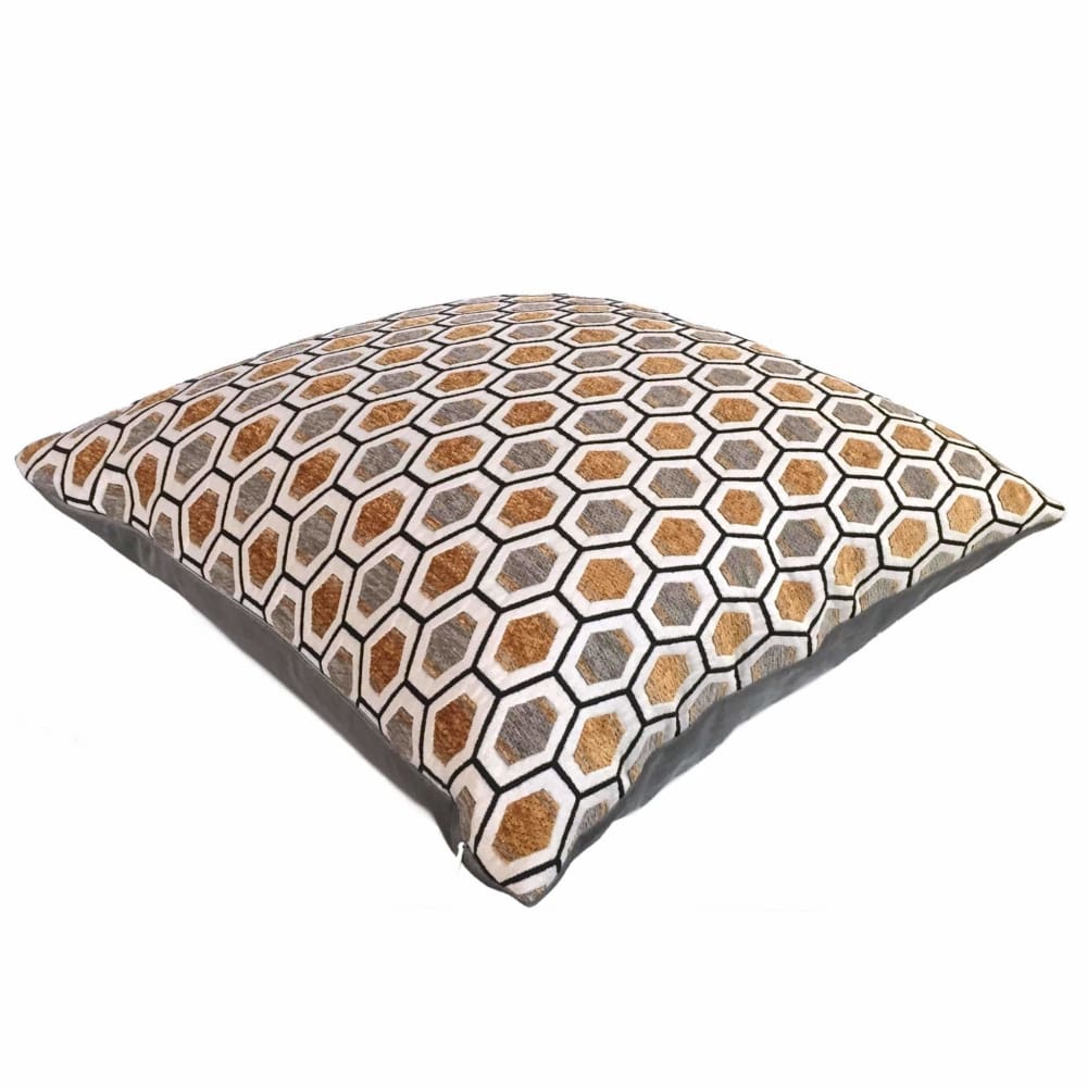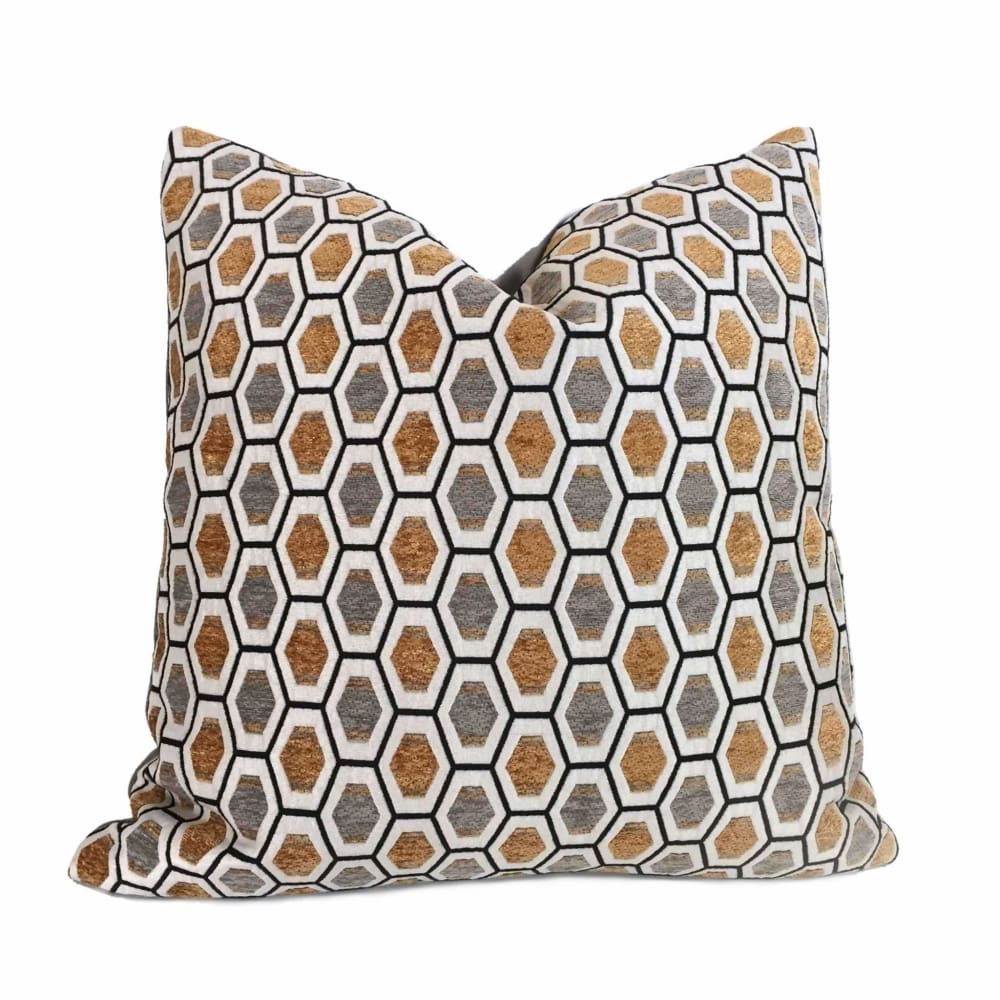 This pillow cover features a geometric honeycomb pattern woven in gray and orange-toned gold, outlined in black, on an off-white background. Front side is the pattern upholstery weight chenille fabric; backside is a coordinating solid gray fabric. Photographed on 17x17 cover (filled with 18x18 insert).