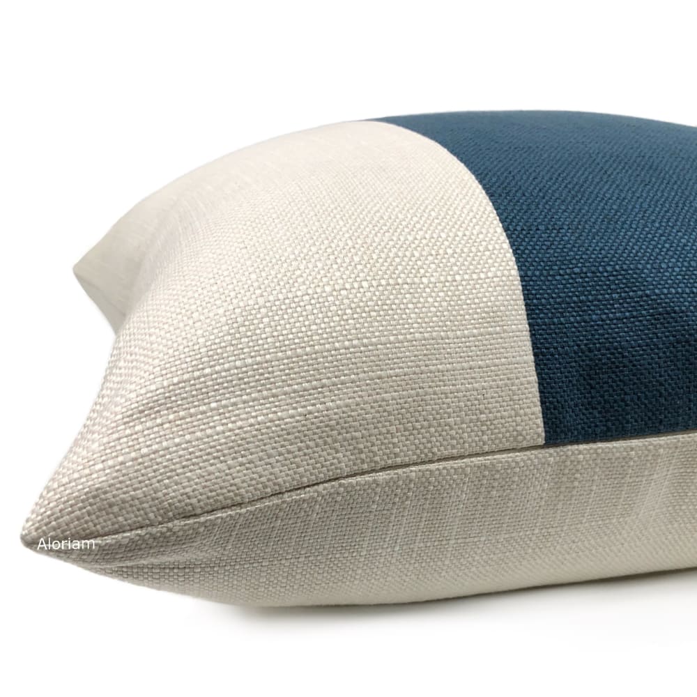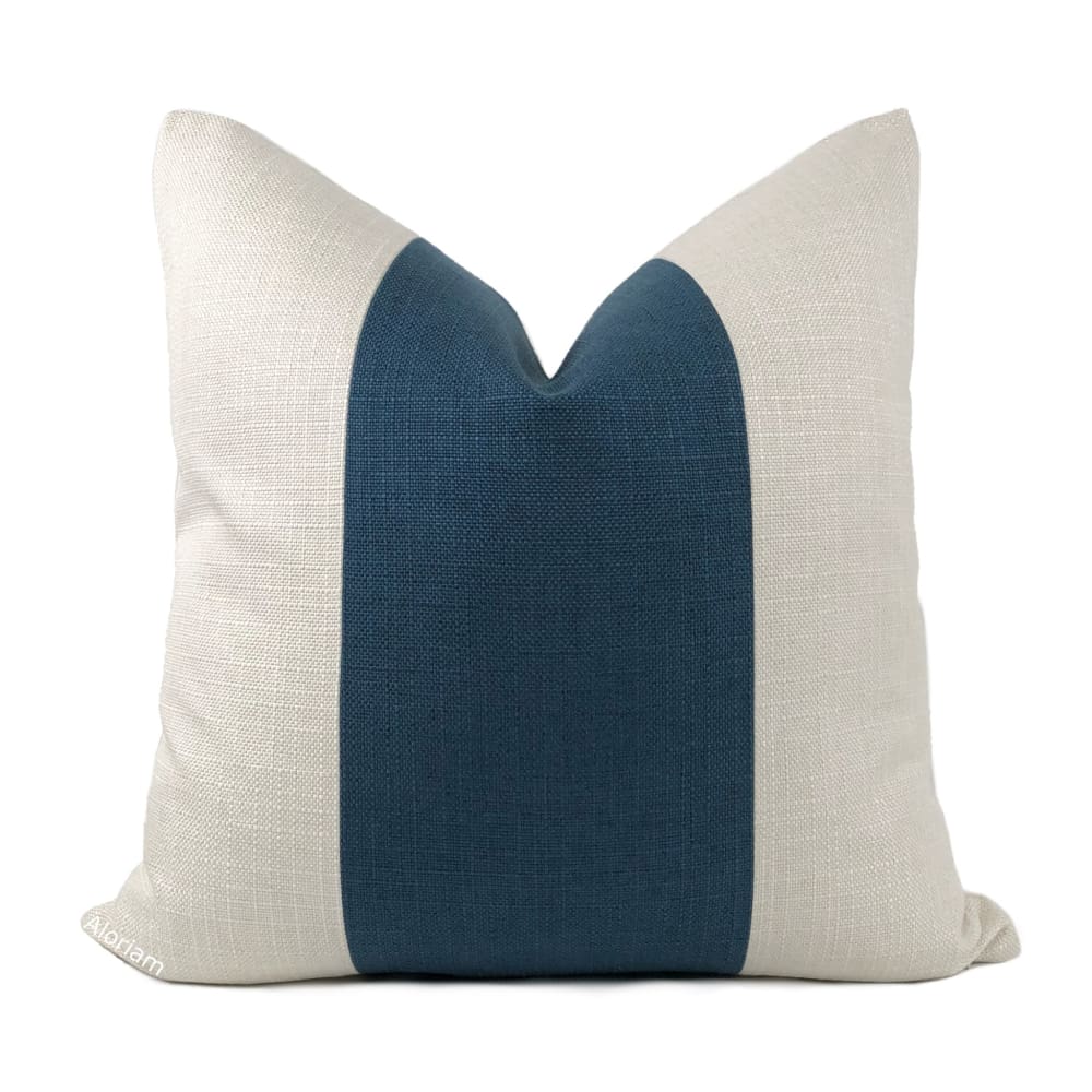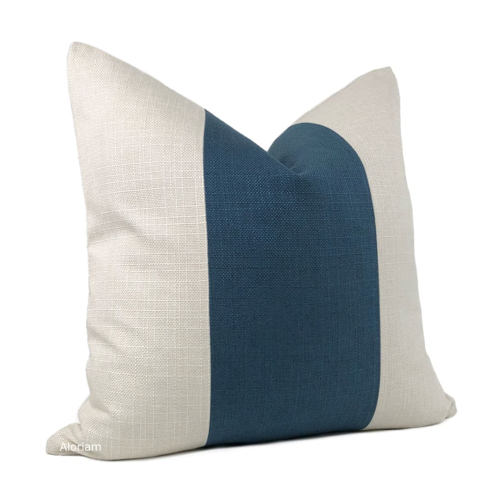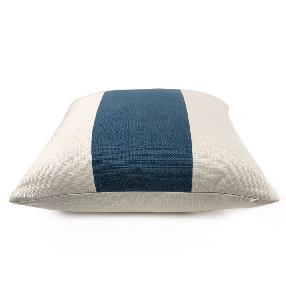 A wide navy blue panel flanked by creamy white bands on either side make this pillow cover a perfect casual addition to any contemporary interior. This pillow cover reverses over to a solid creamy white backside. Photographed on 20.5x20.5 cover (filled with 22x22 insert).