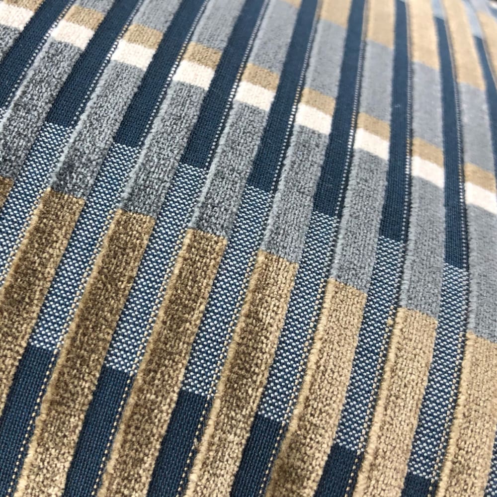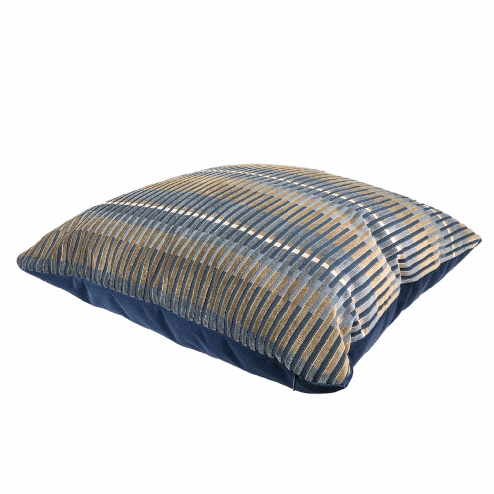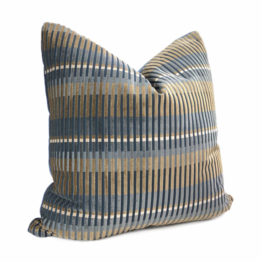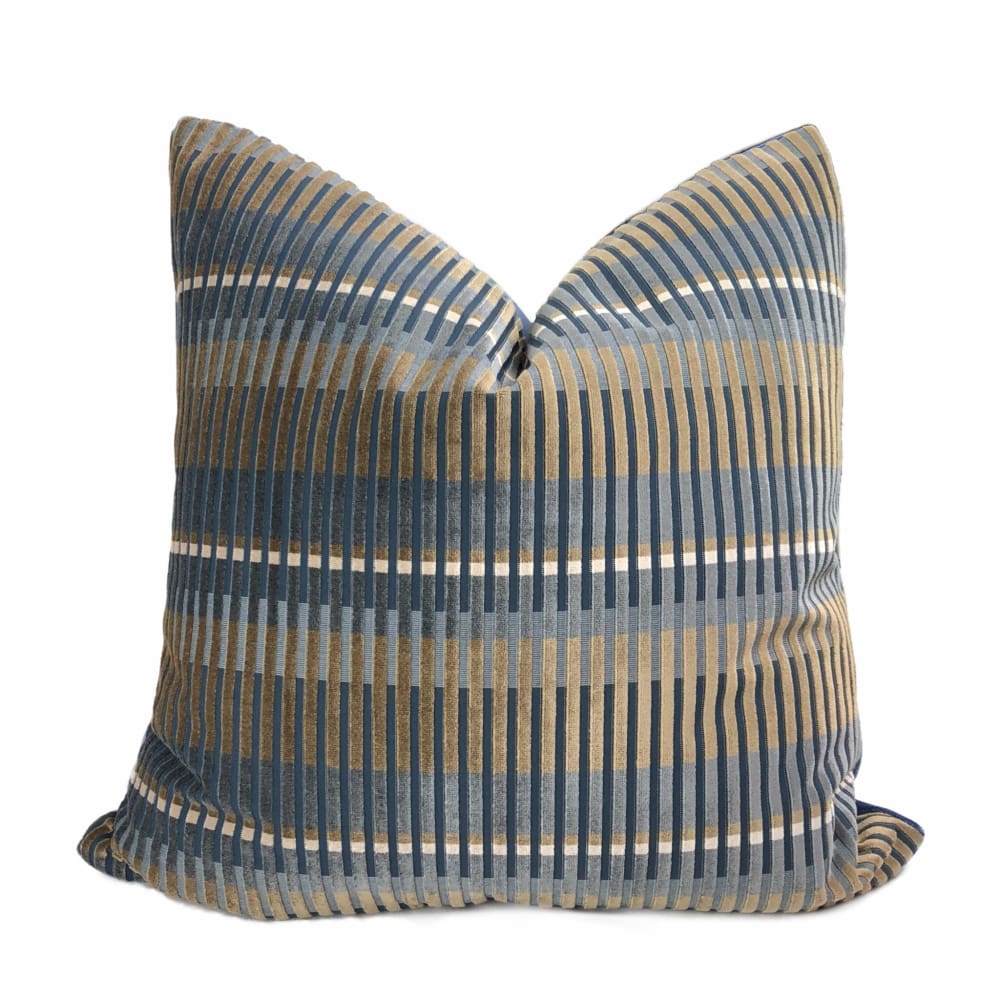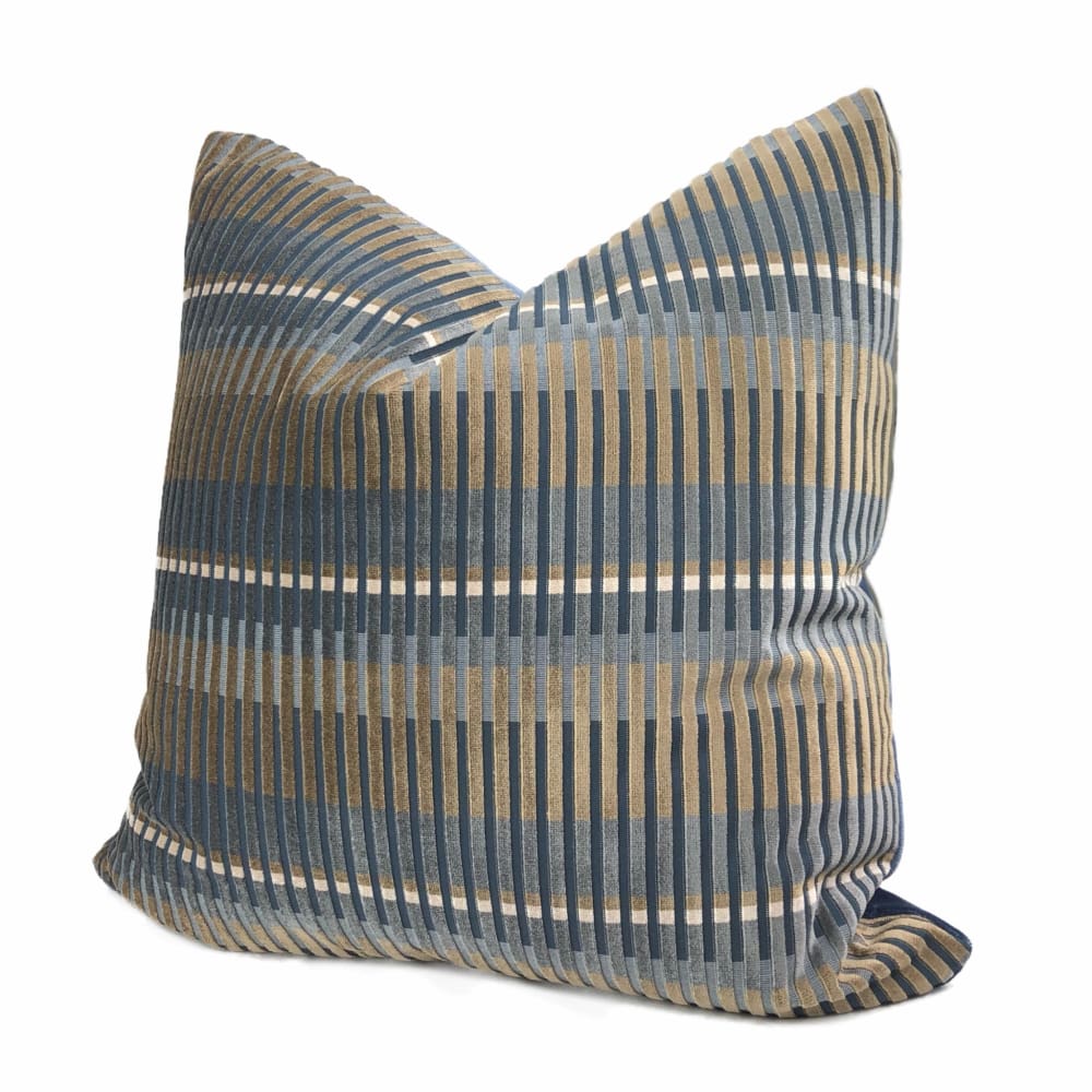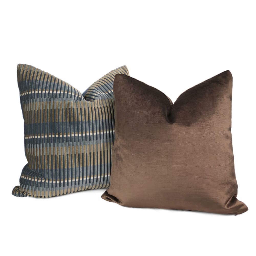 The Humbolt pillow cover features mid-century modern styling in its narrow vertical velvet stripes woven in blue and brown. Your choice of the pattern fabric on both sides or with a coordinating solid backside. Photographed on 19x19 cover (filled with 20x20 insert).