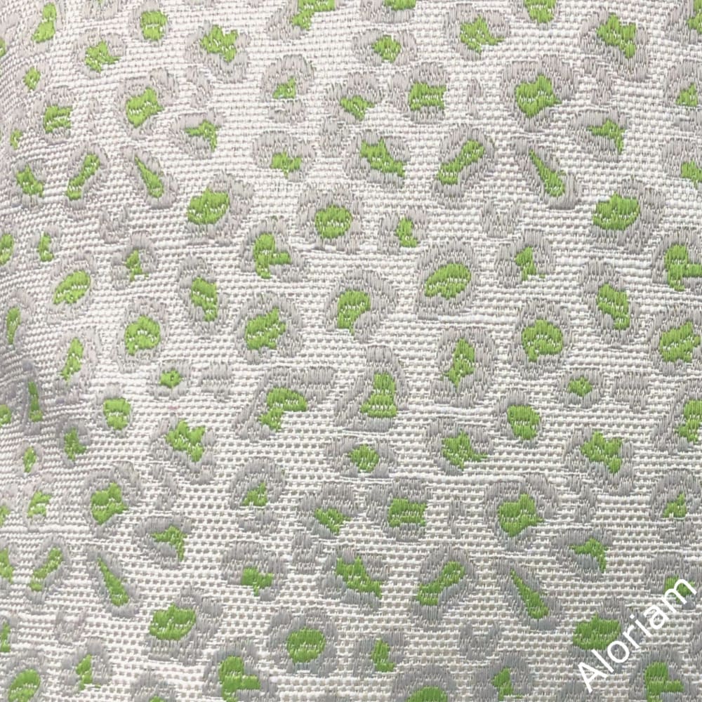 Jaclyn is a leopard pattern pillow cover with the leopard spots woven in a lime green center rimmed in gray on an off-white background.