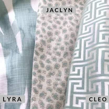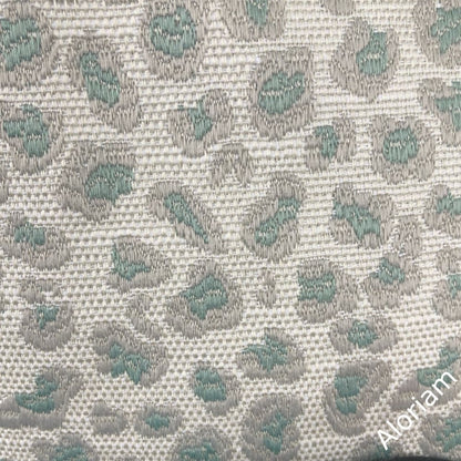 Jaclyn is a leopard pattern pillow cover with the leopard spots woven in a mineral green center rimmed in gray on an off-white background.