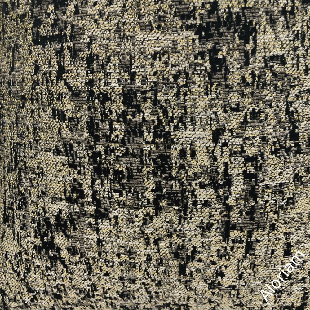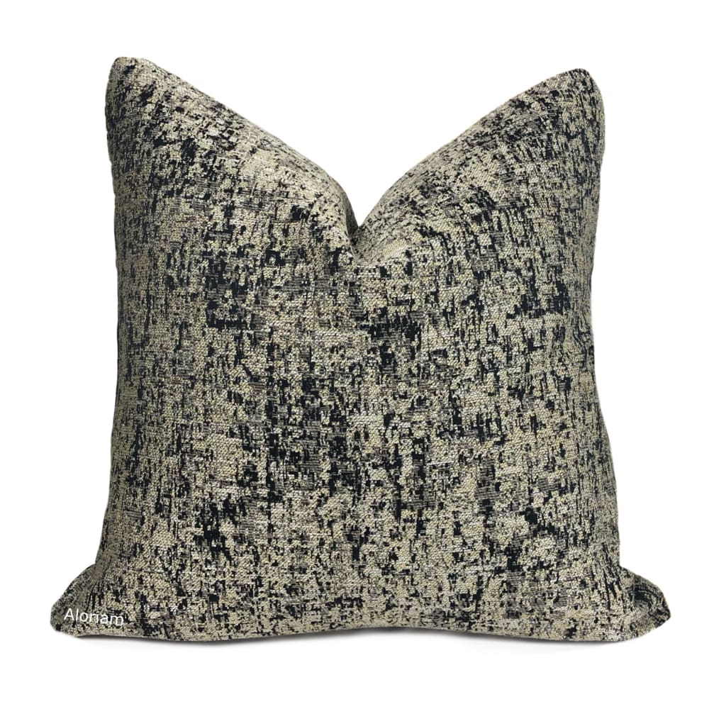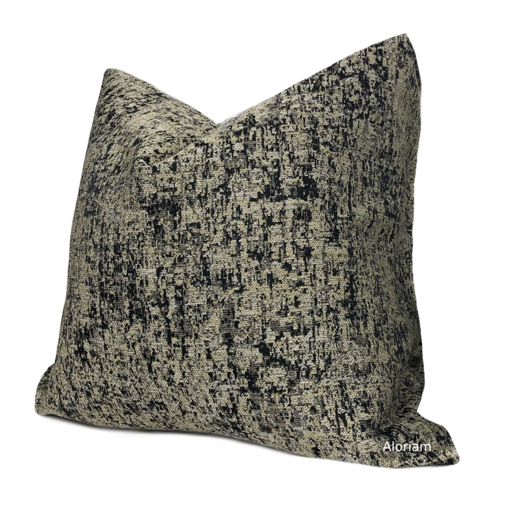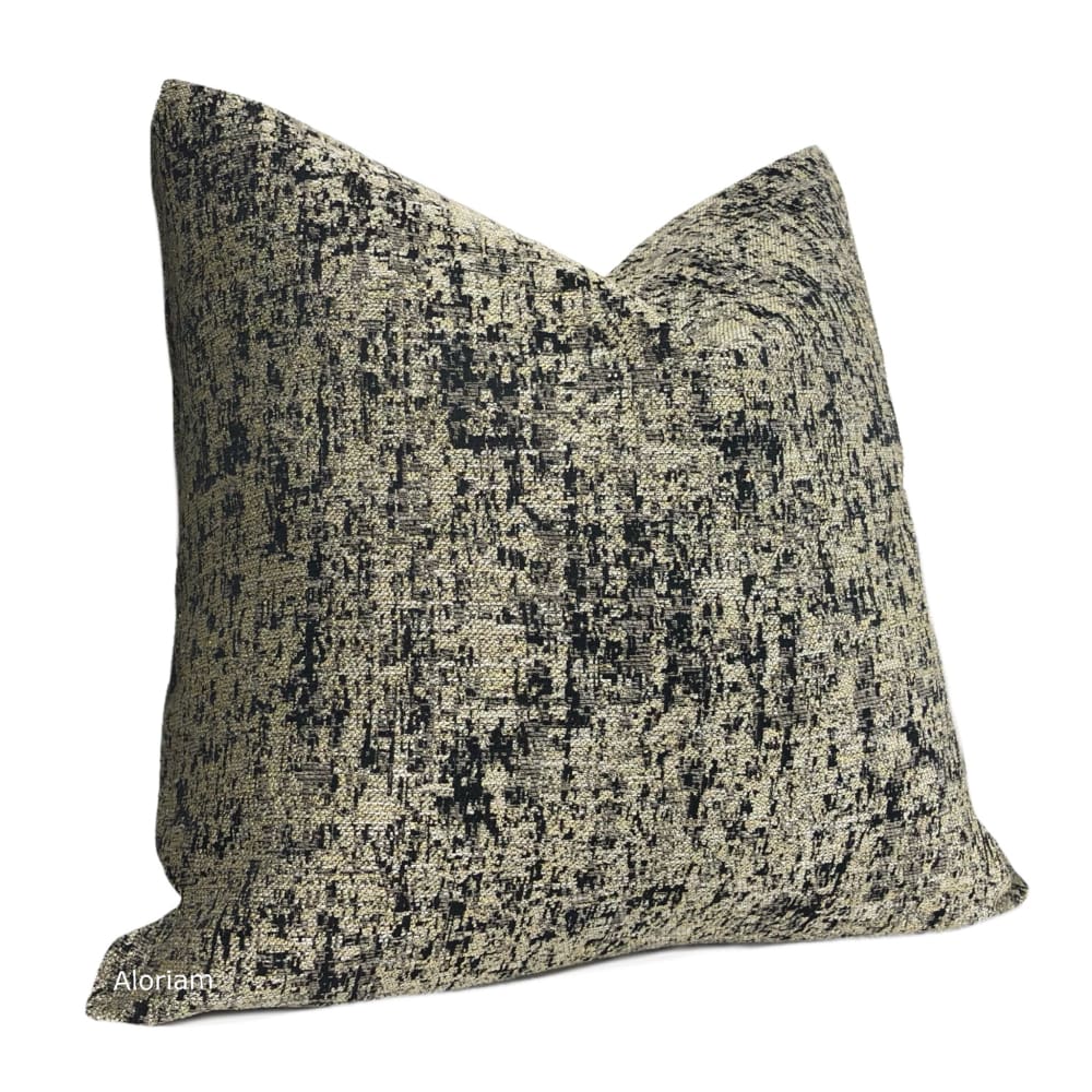 The Jacqueline pillow cover interweaves black and metallic gold yarns in an abstract pyrite-like pattern.