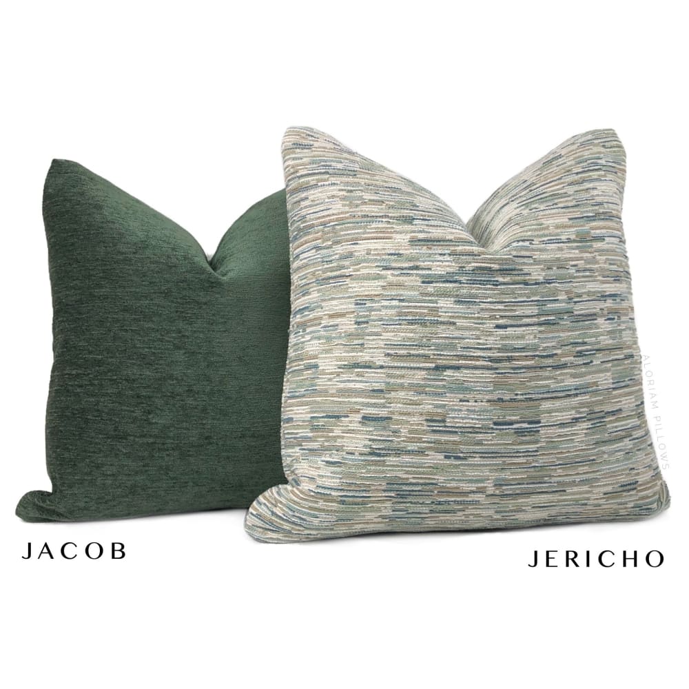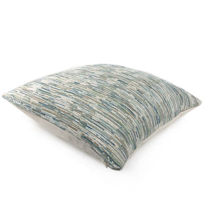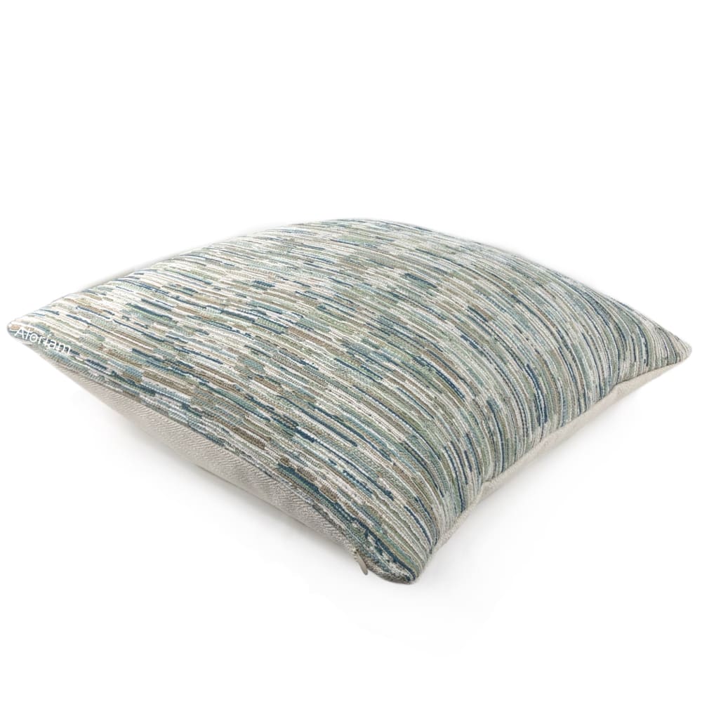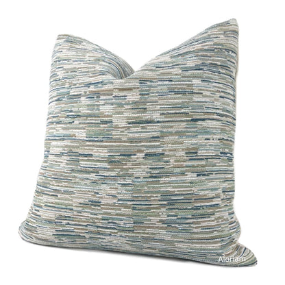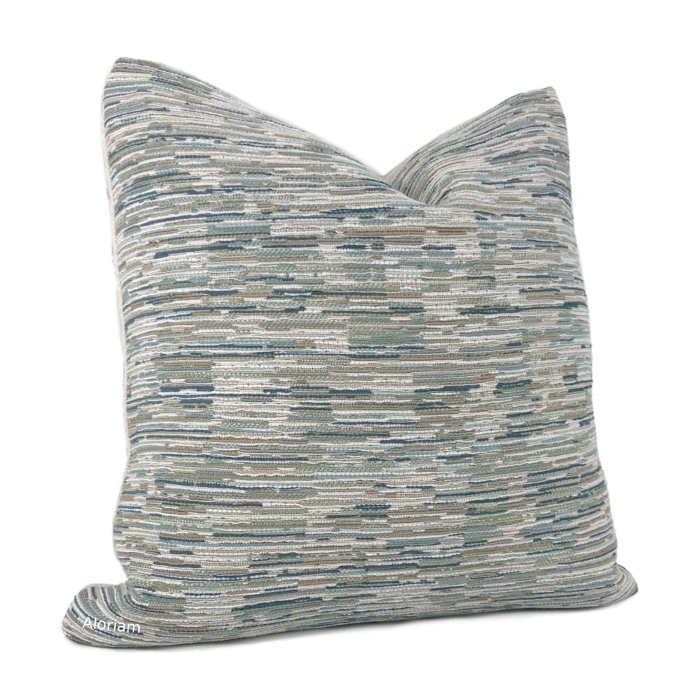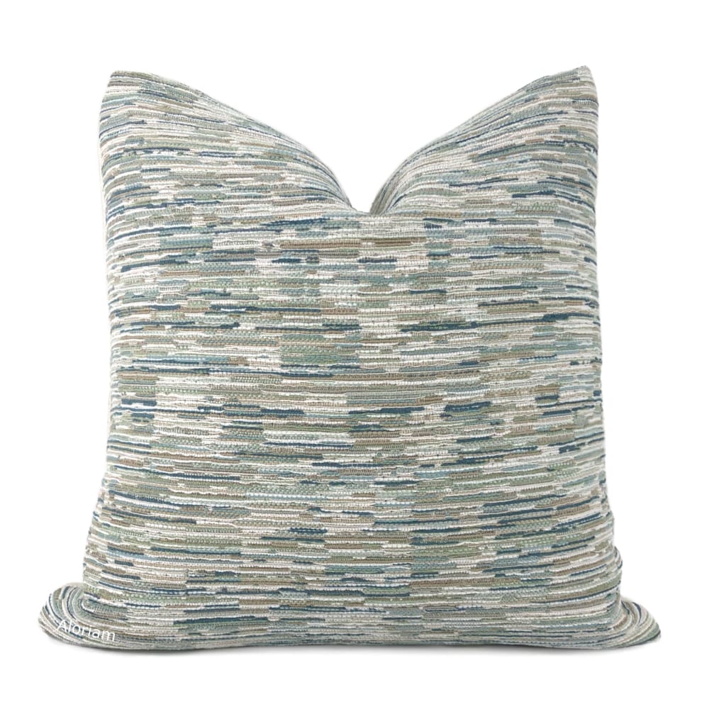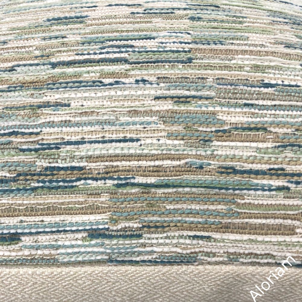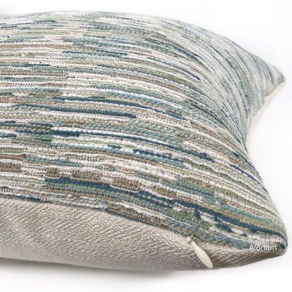 Jericho is a textured pillow cover with a mix of natural hues: cream, beige, light brown, light green, aqua and teal.