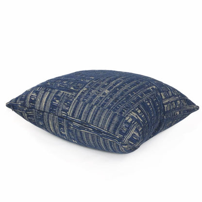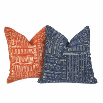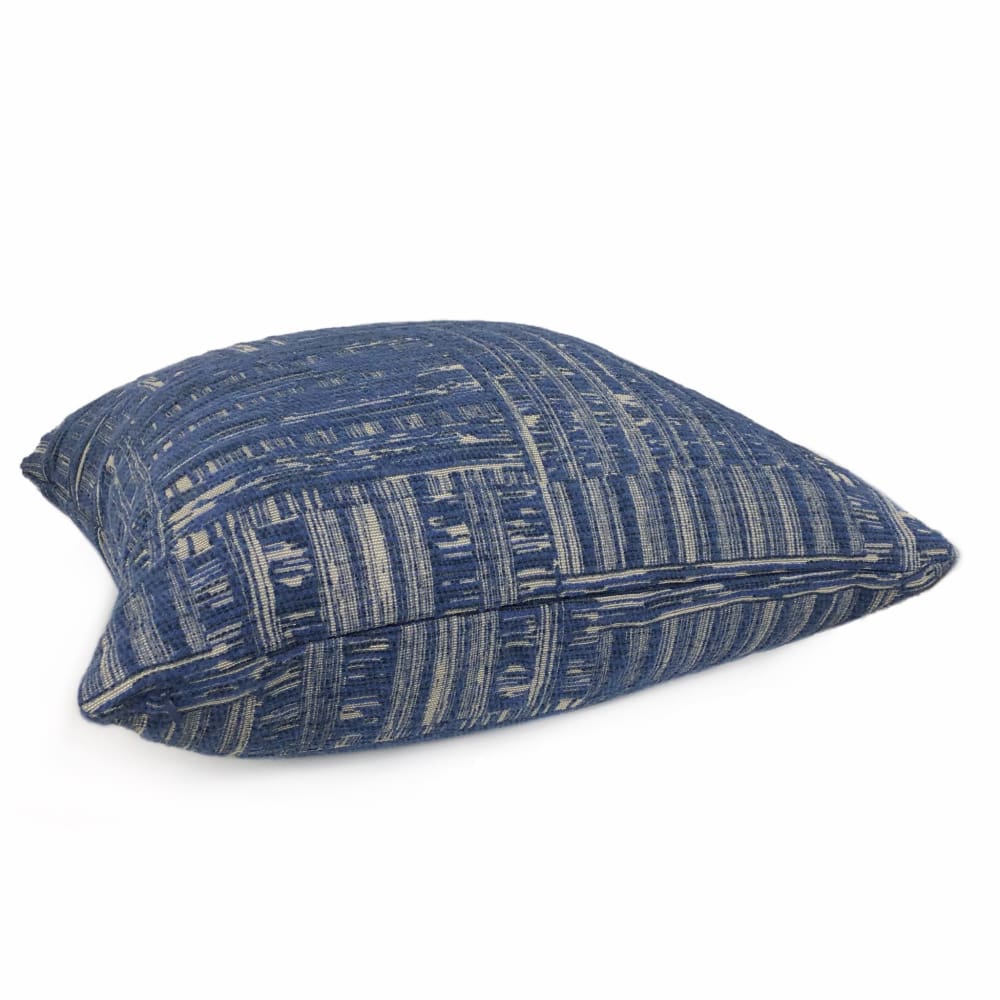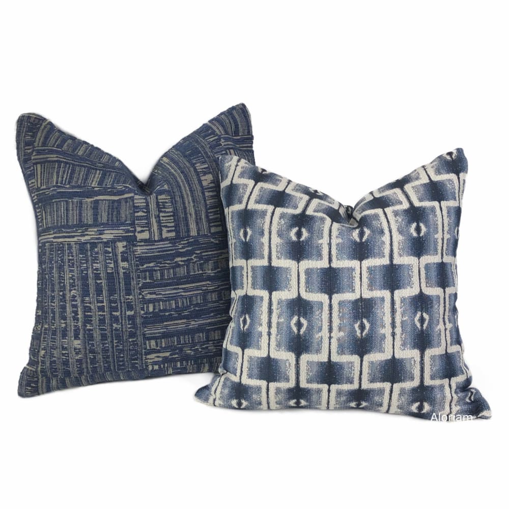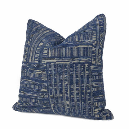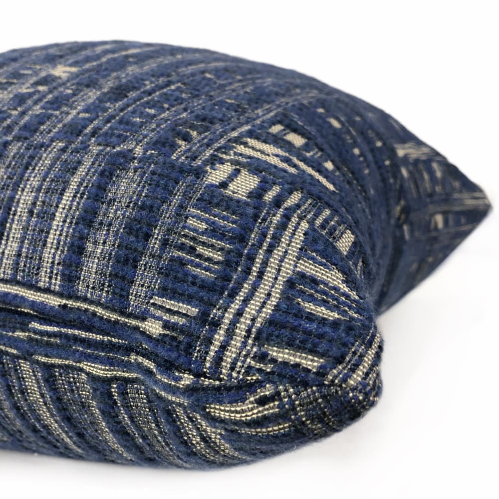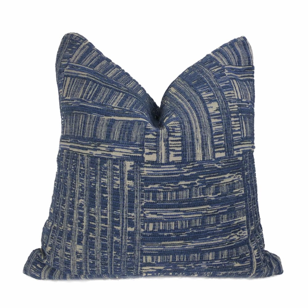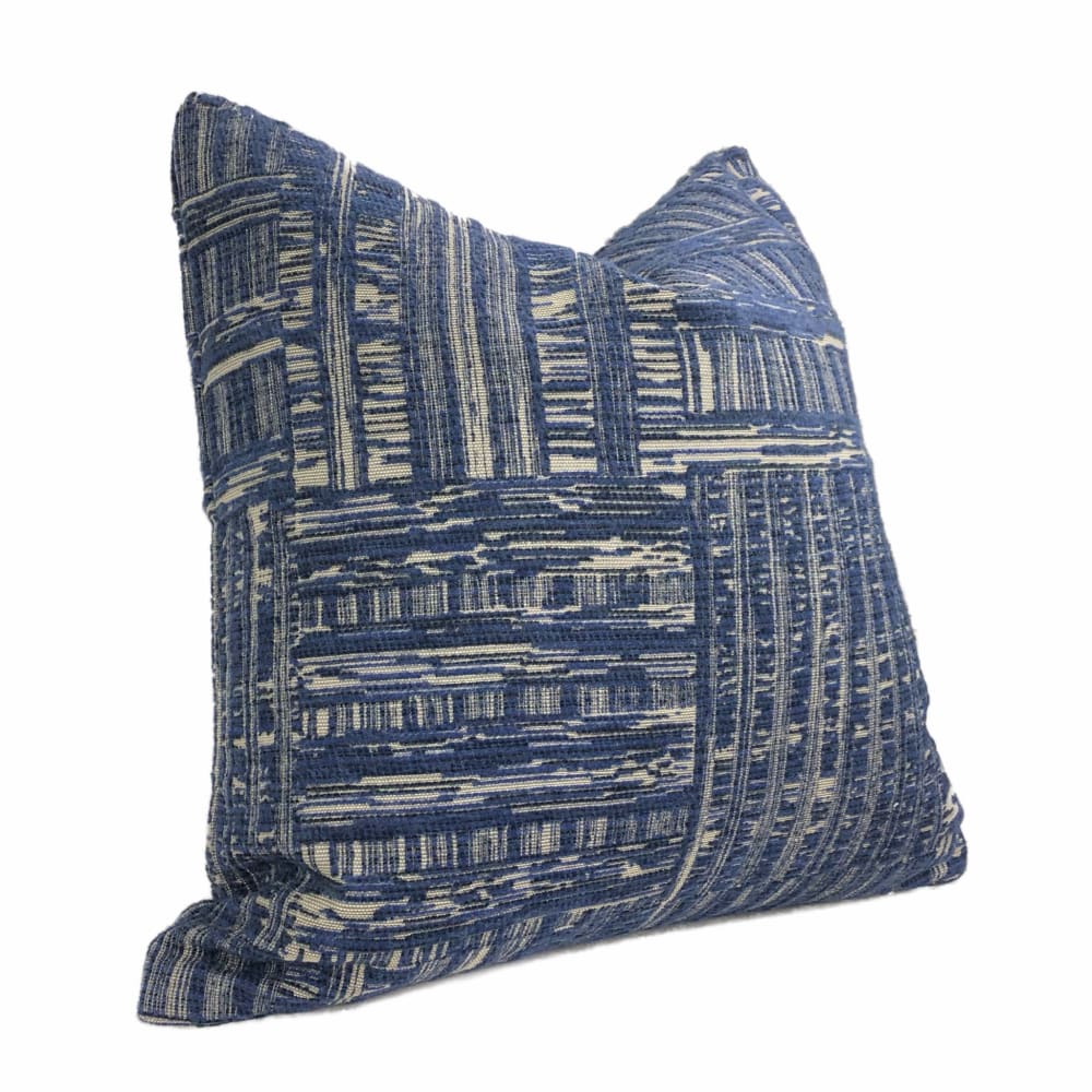 The Joplin pillow cover rocks a heavily textured abstract design woven in cobalt blue on a greige background. Photographed on 19x19 cover (filled with 20x20 insert). Designer pattern fabric has a soft chenille texture and is offered in your choice of the pattern fabric on both sides or with a coordinating solid backside.