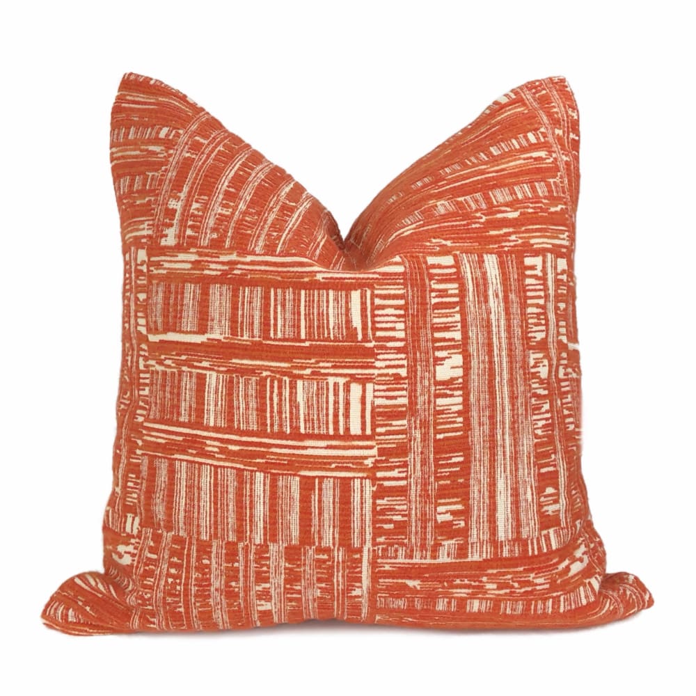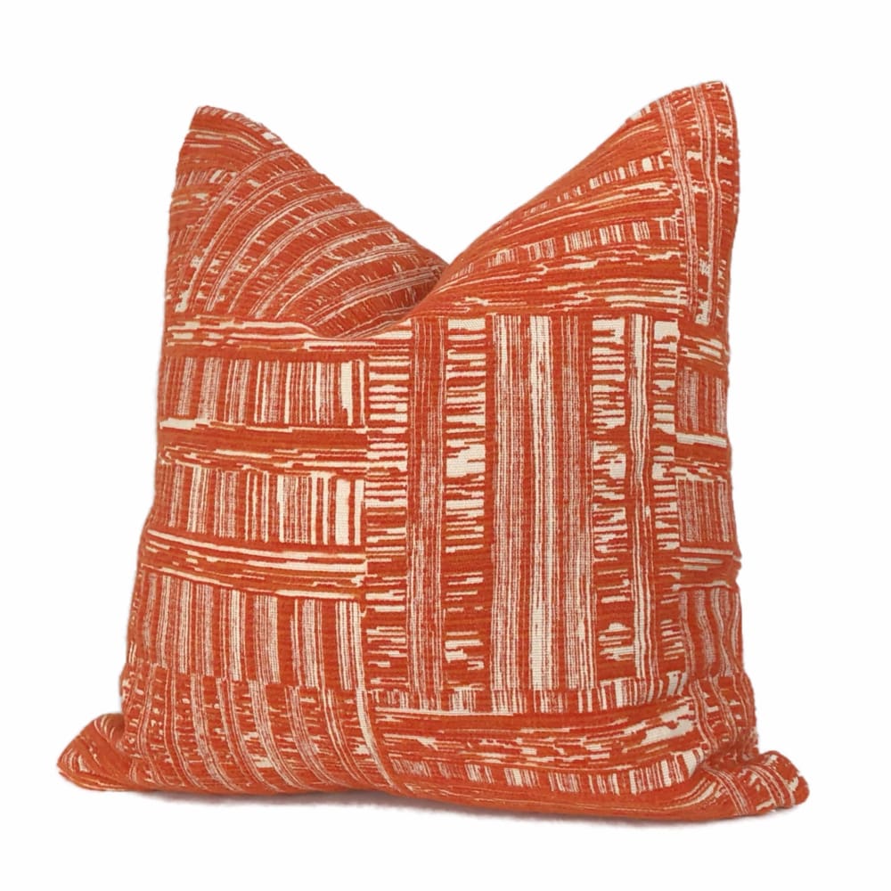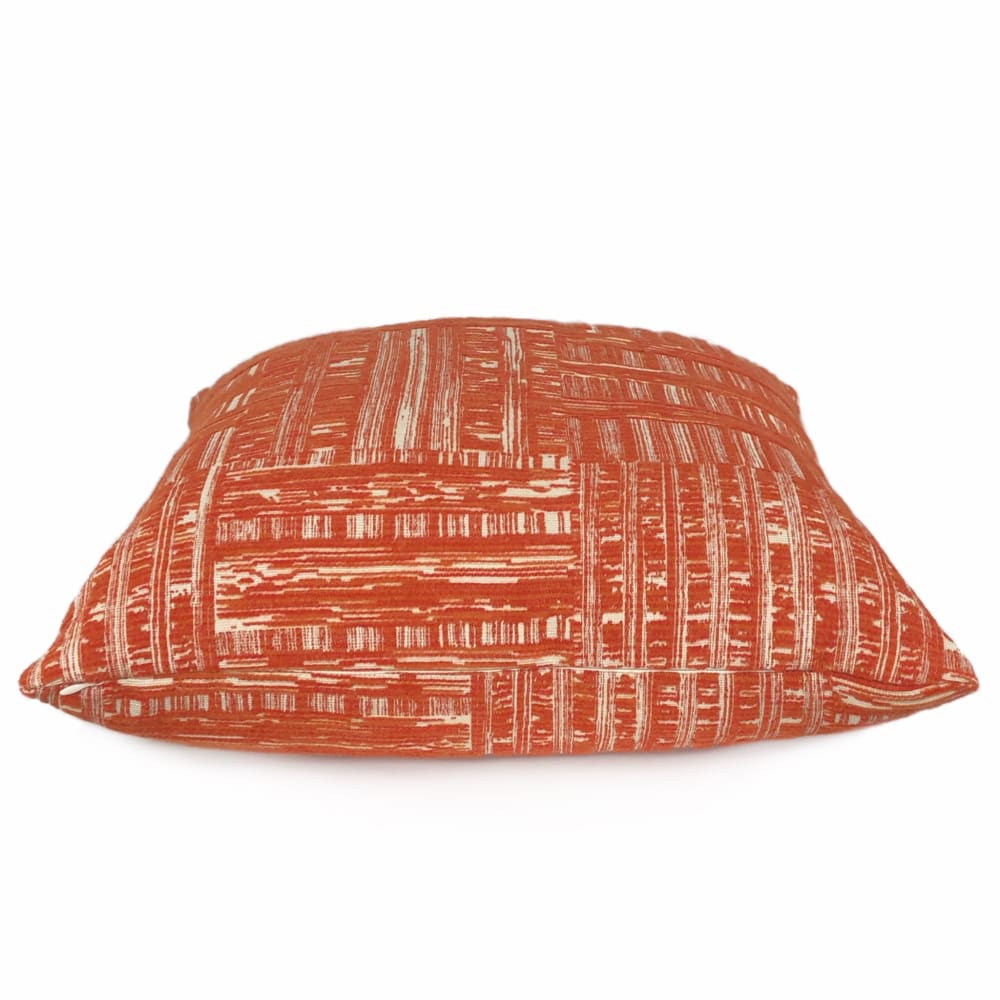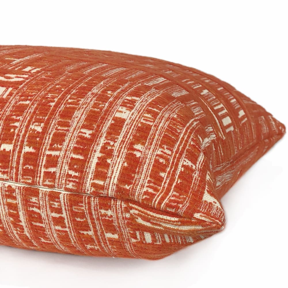 The Joplin pillow cover rocks a heavily textured abstract design woven in orange on a cream background. Photographed on 19x19 cover (filled with 20x20 insert). Designer pattern fabric has a soft chenille texture.