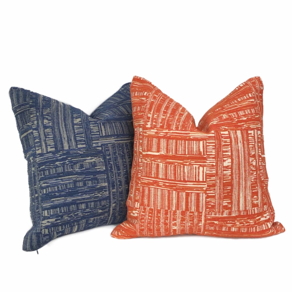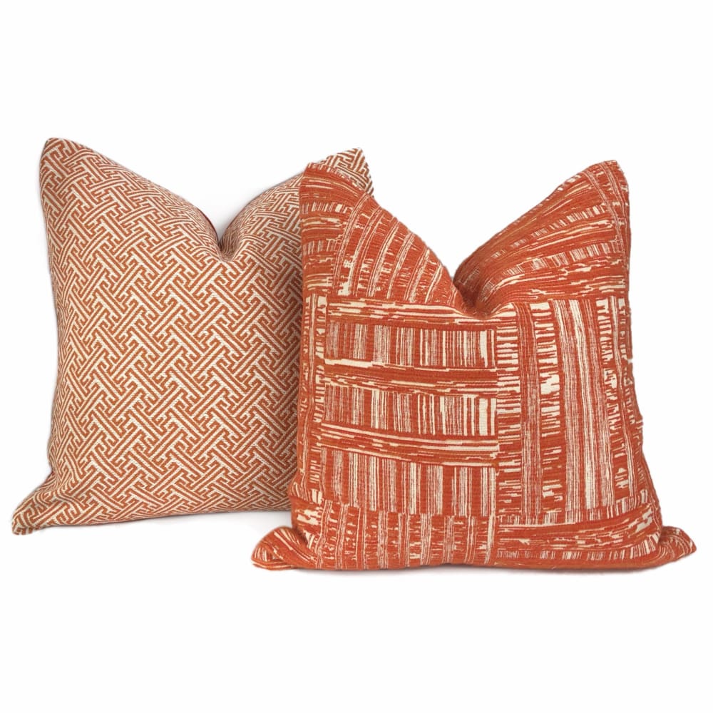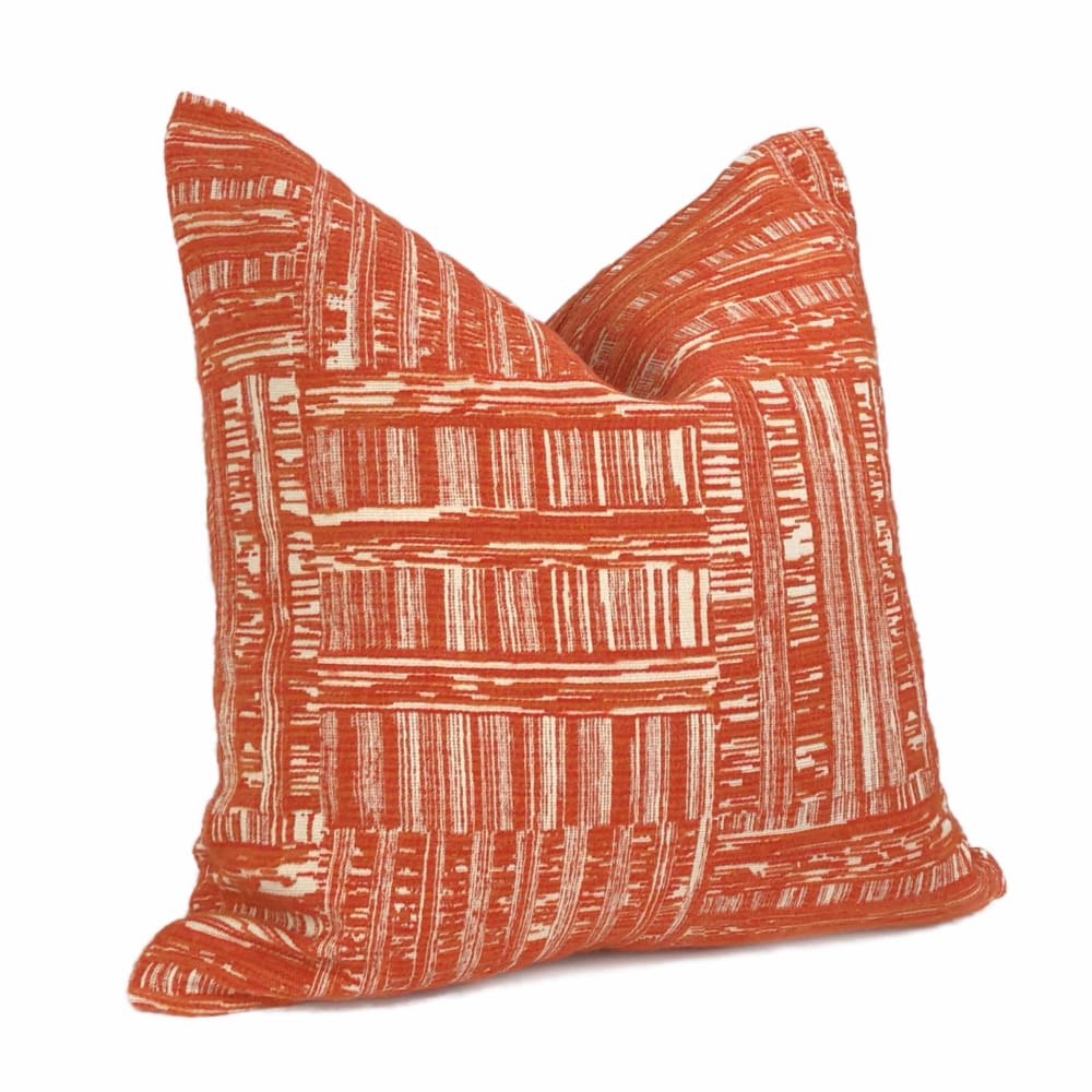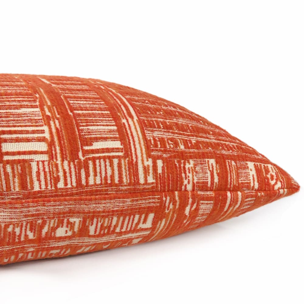 The Joplin pillow cover rocks a heavily textured abstract design woven in orange on a cream background. Photographed on 19x19 cover (filled with 20x20 insert). Designer pattern fabric has a soft chenille texture.