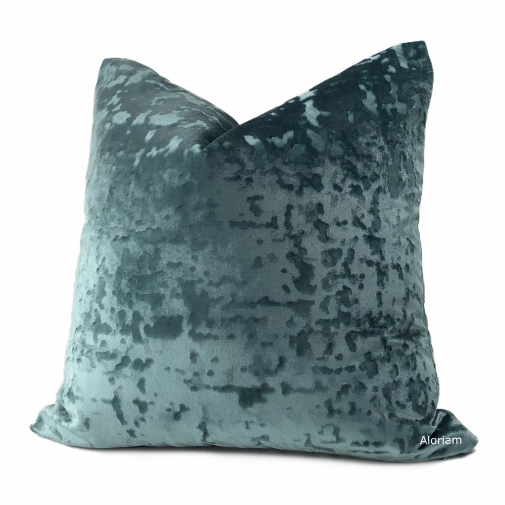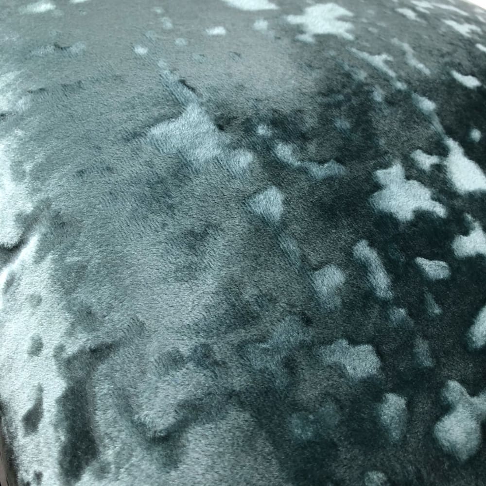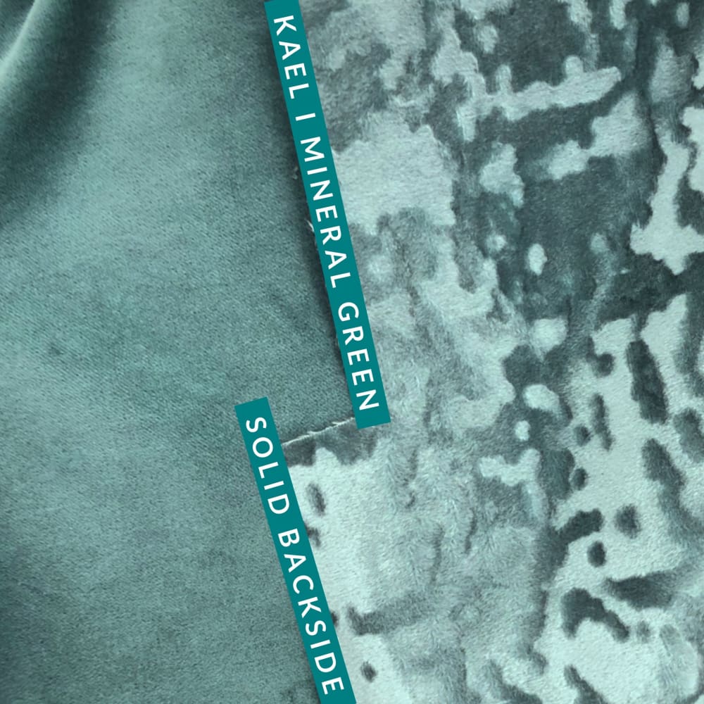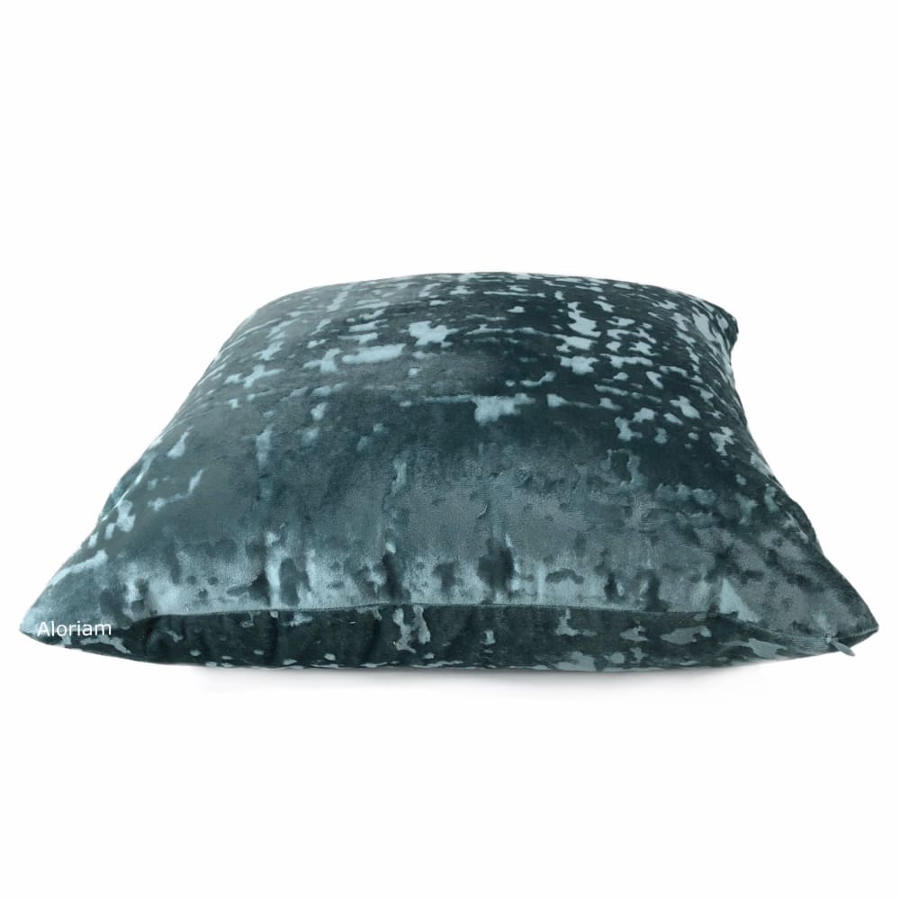 Kael is a mineral green velvet pillow cover with a tonal distressed finish. The abstract pattern drifts from light to dark as you change your viewing angle, heightening visual interest and movement in the overall design.