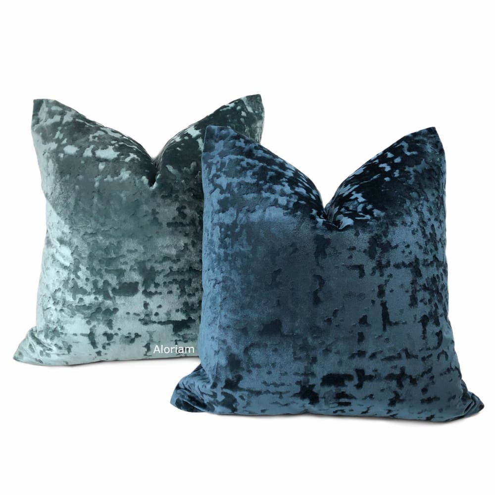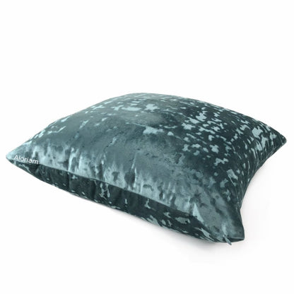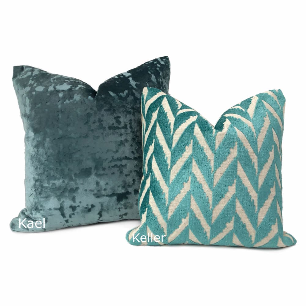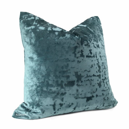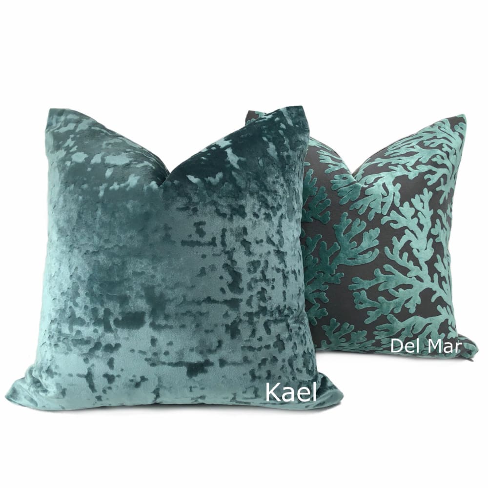 Kael is a mineral green velvet pillow cover with a tonal distressed finish. The abstract pattern drifts from light to dark as you change your viewing angle, heightening visual interest and movement in the overall design.