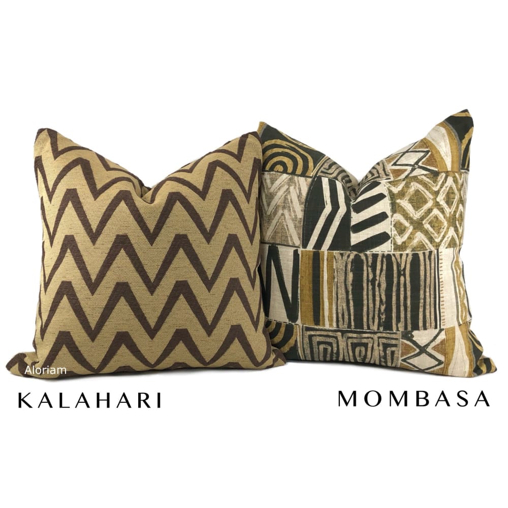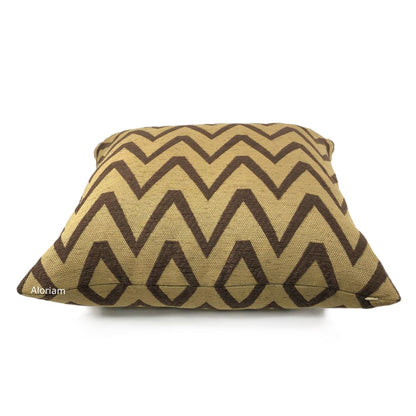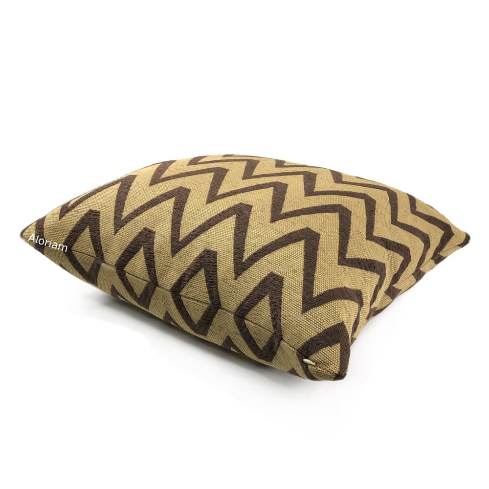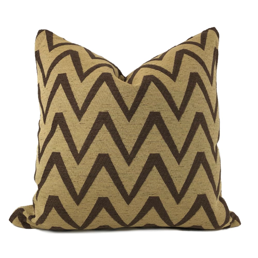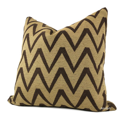 The Kalahari pillow cover rocks an earth-toned color combination and a dynamic chevron design. The brown zig zag pattern woven against a warm tan background is a wonderful accompaniment to many other designs. Pattern fabric on both sides. Photographed on 20.5x20.5 cover (filled with 22x22 insert).