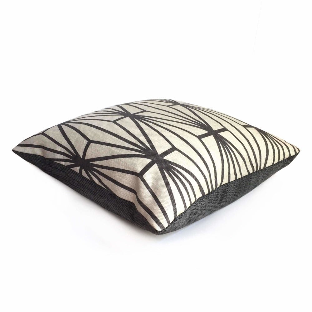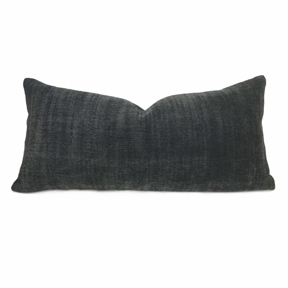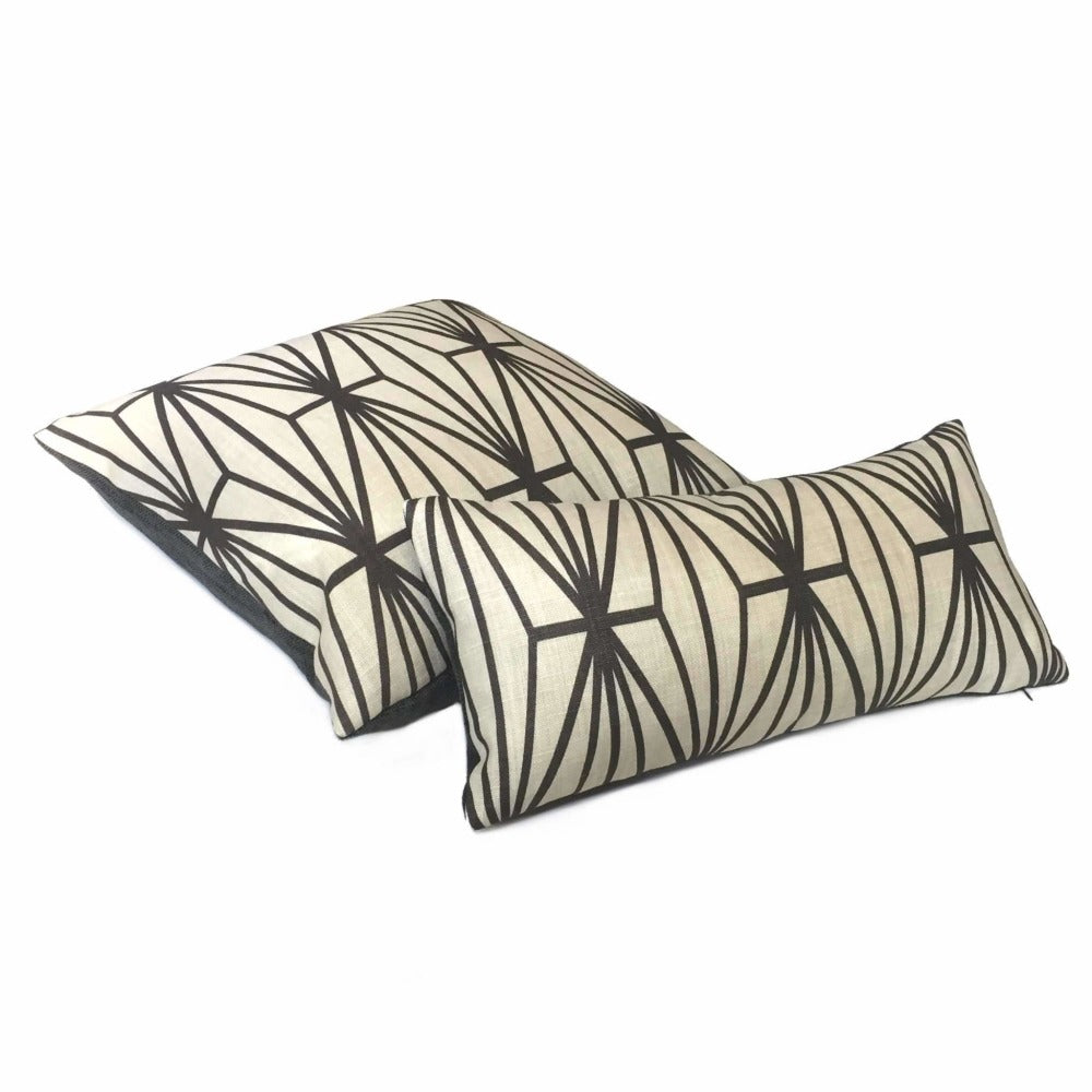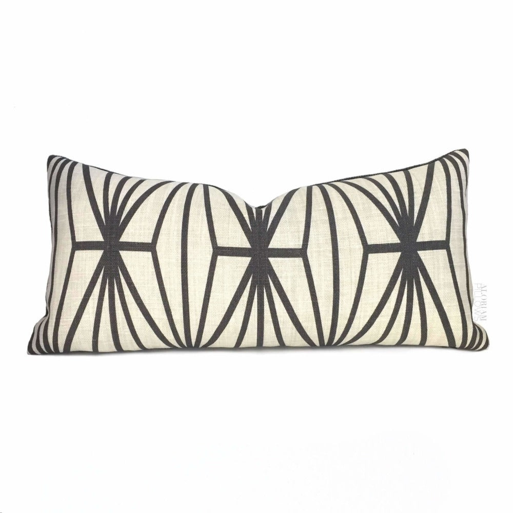 Sewn in an iconic Lee Jofa / Groundworks fabric designed by Kelly Wearstler "Katana" in the "Ebony" colorway, this pillow cover coordinates superbly with many decors! The main colors are a charcoal-light black on an ecru-linen (with gray undertone) colored background. This genuine Kelly Wearstler designer pattern fabric is 100% heavyweight linen and retails for over $130 a yard! This pillow cover reverses to a coordinating solid charcoal gray heavyweight upholstery backside. Pattern placement will be symmetrical. Photographed on 24x24 and 12x24 inserts.