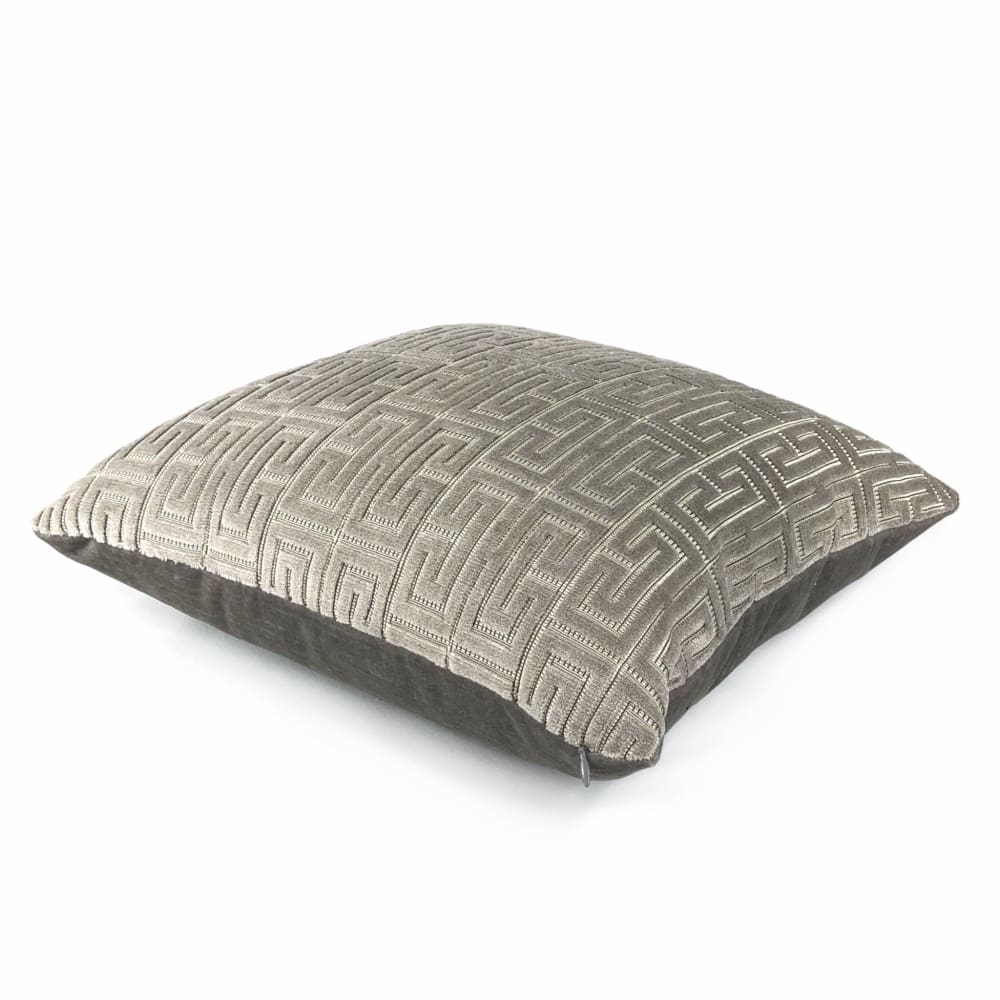 The Knossos pillow cover combines the luxury of cut velvet with a classic Greek key design. Woven in a warm gray color, this pillow cover is a masterpiece of timeless elegance and style.