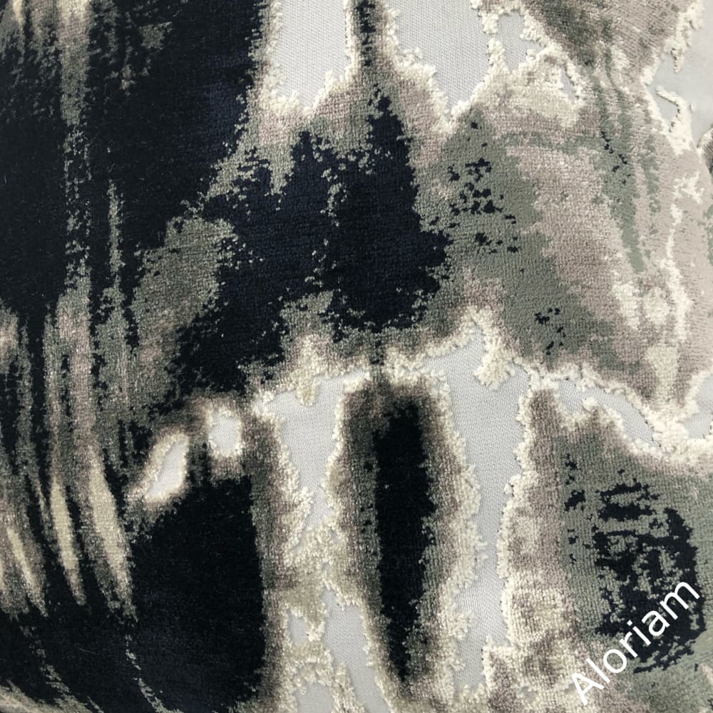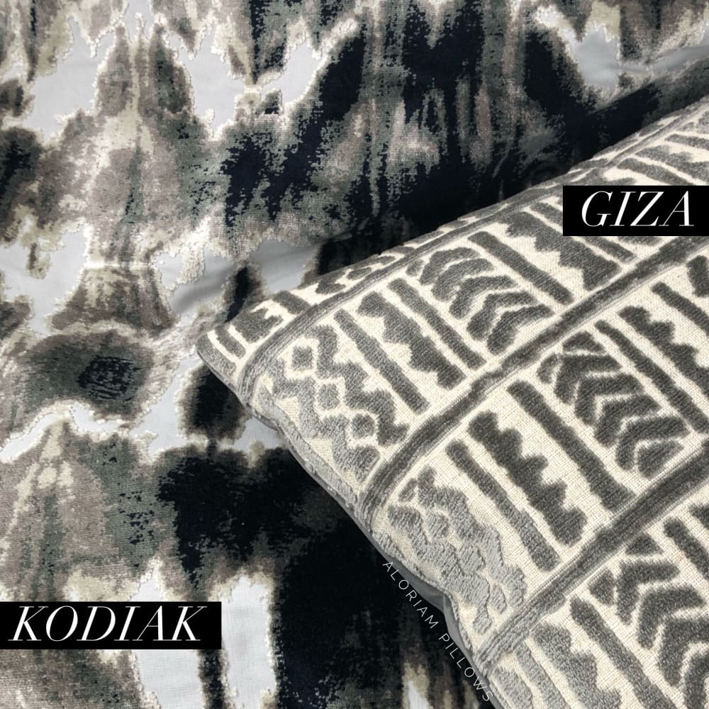 The Kodiak velvet pillow cover features a large scale abstract design with a lively organic feel. Primary colors include black, gray and taupe.