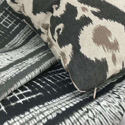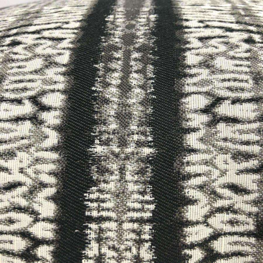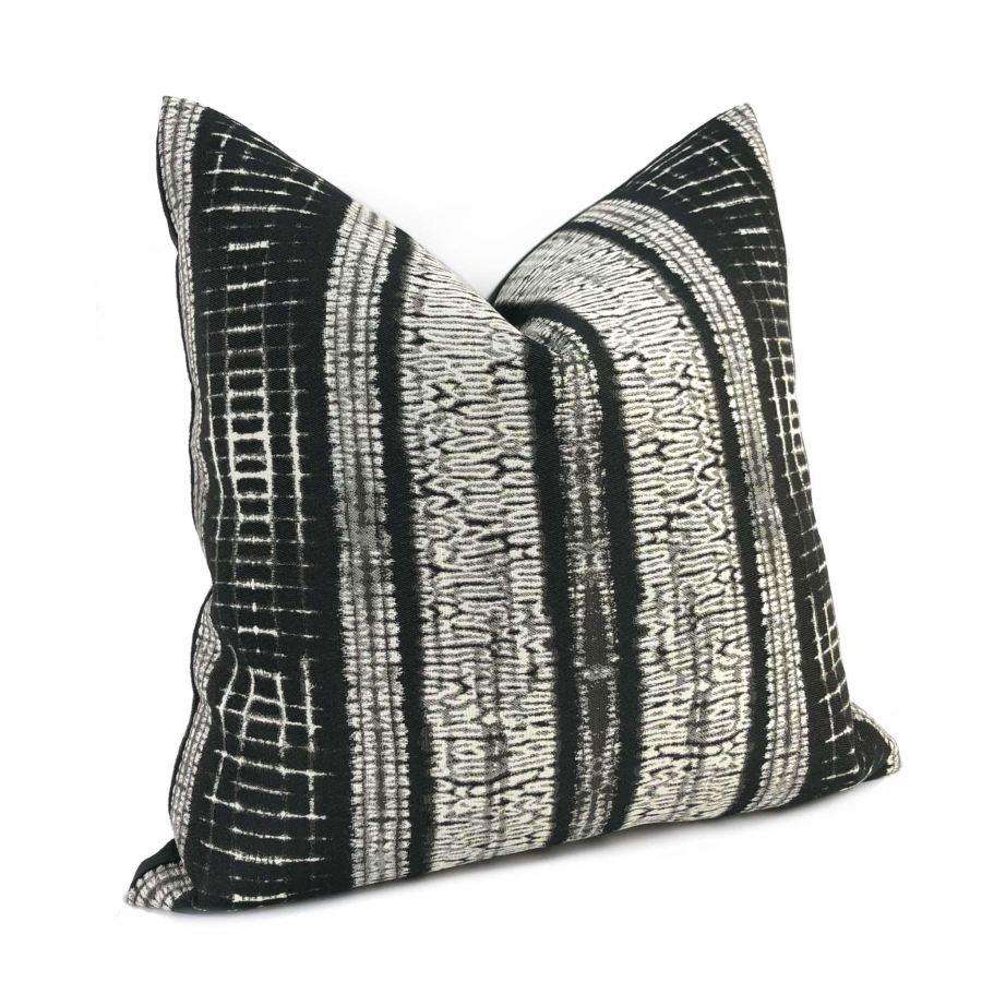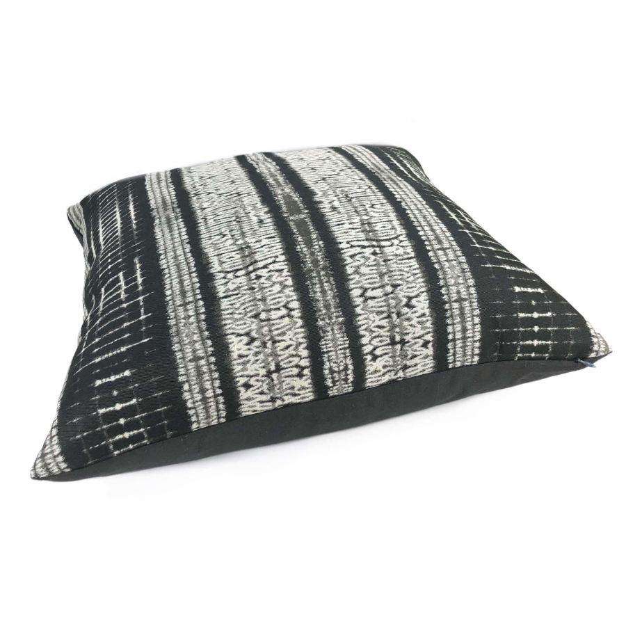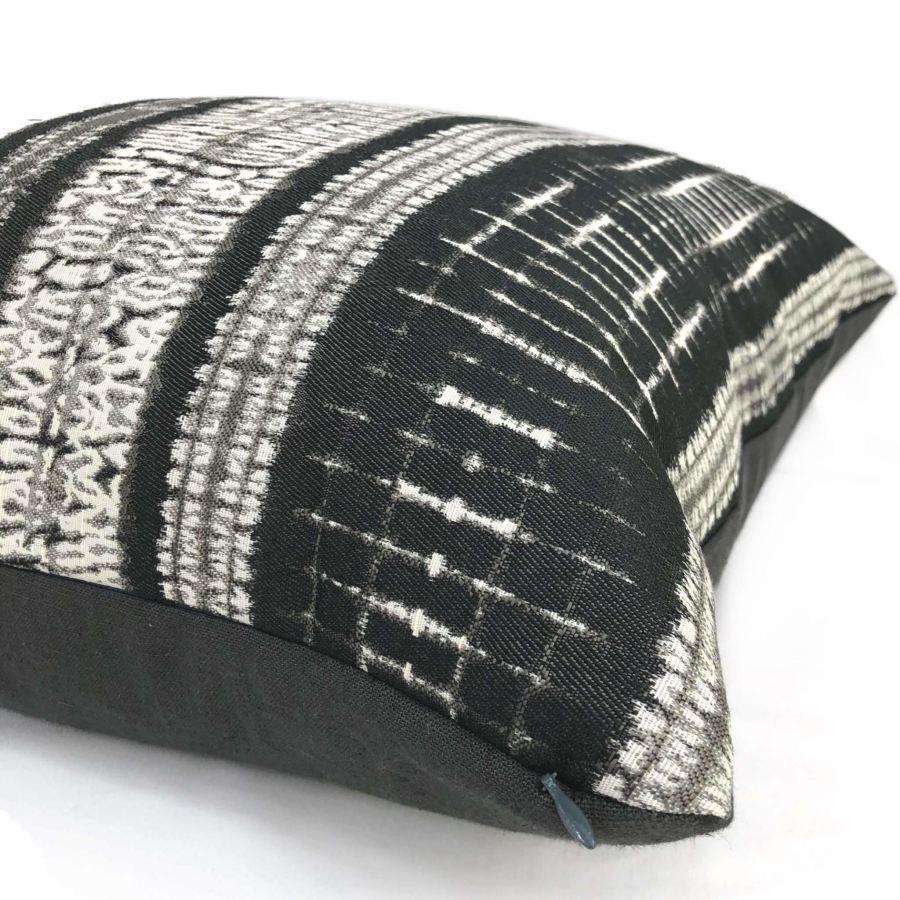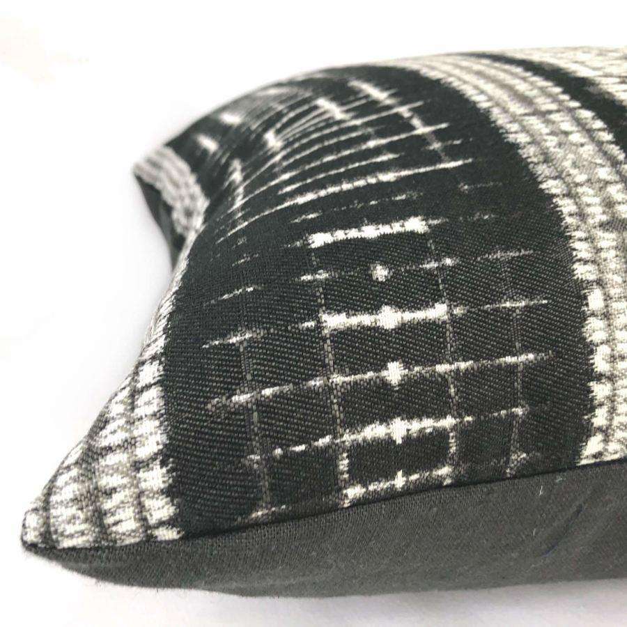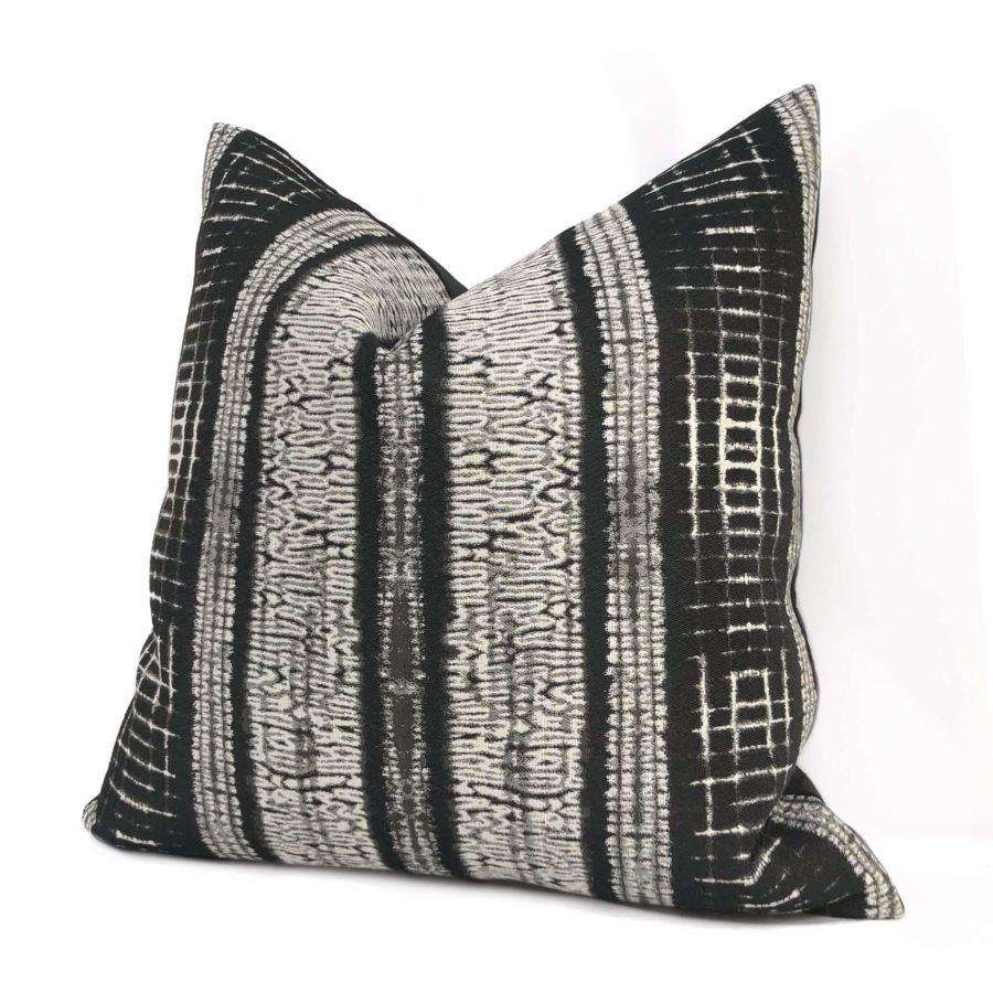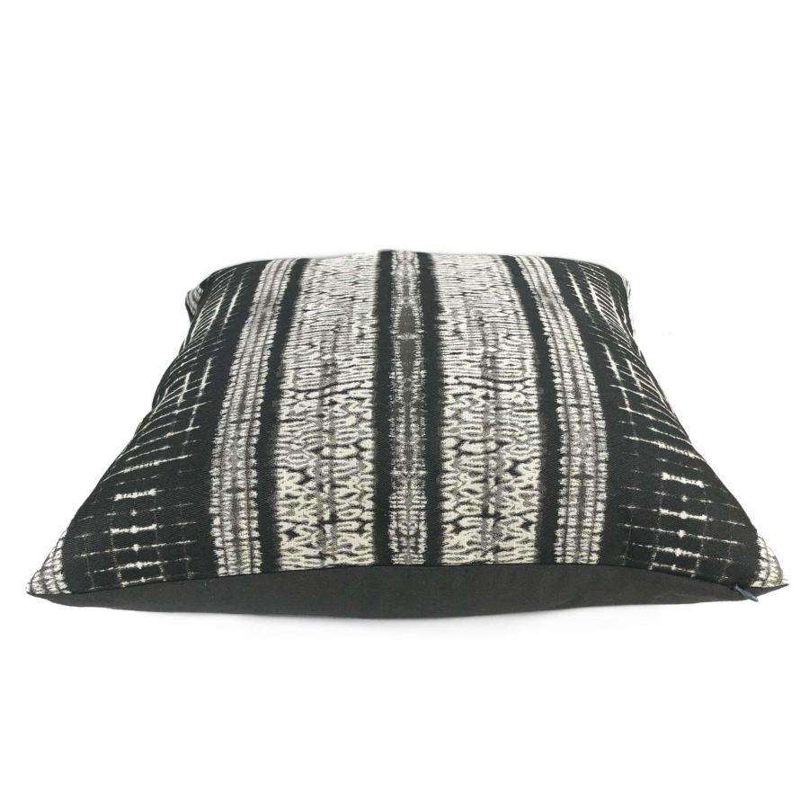 Almost sold out! Woven in a tribal stripe pattern in soft black and off-white, this pillow cover is a great way to add some global ethnic chic to your decor. Choose from the pattern fabric used on both sides or front only with a coordinating solid backside. Photographed on 22x22 cover (filled with 24x24 insert).