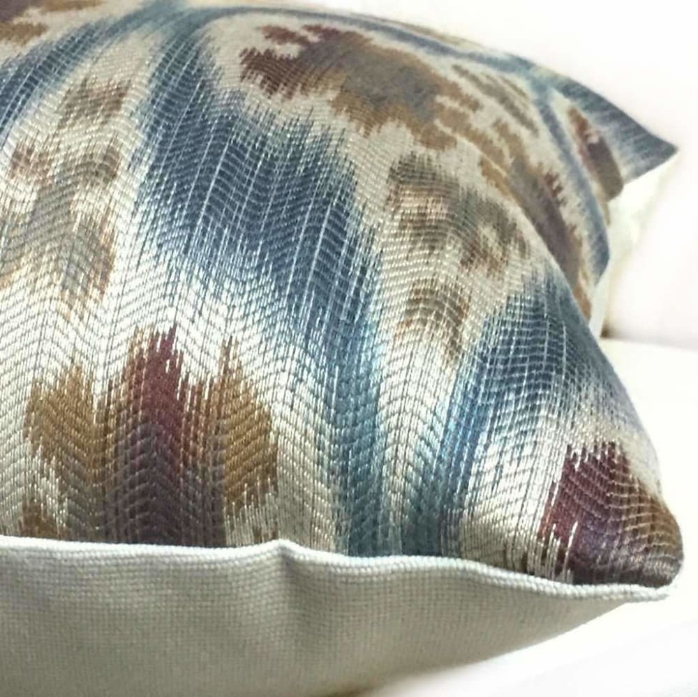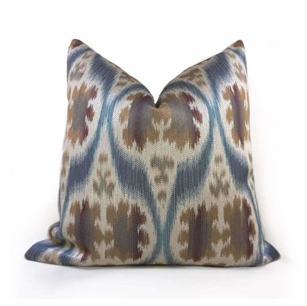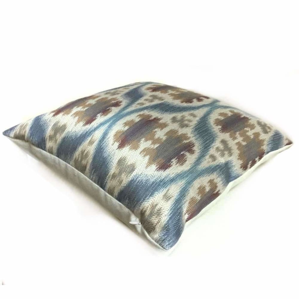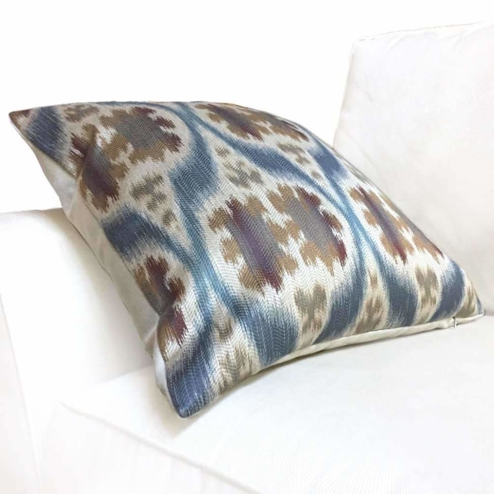 Limited availability! The Dinesh pillow cover features a stunning Ikat or ethnic style motif woven in slate blue, tan beige and brown.
