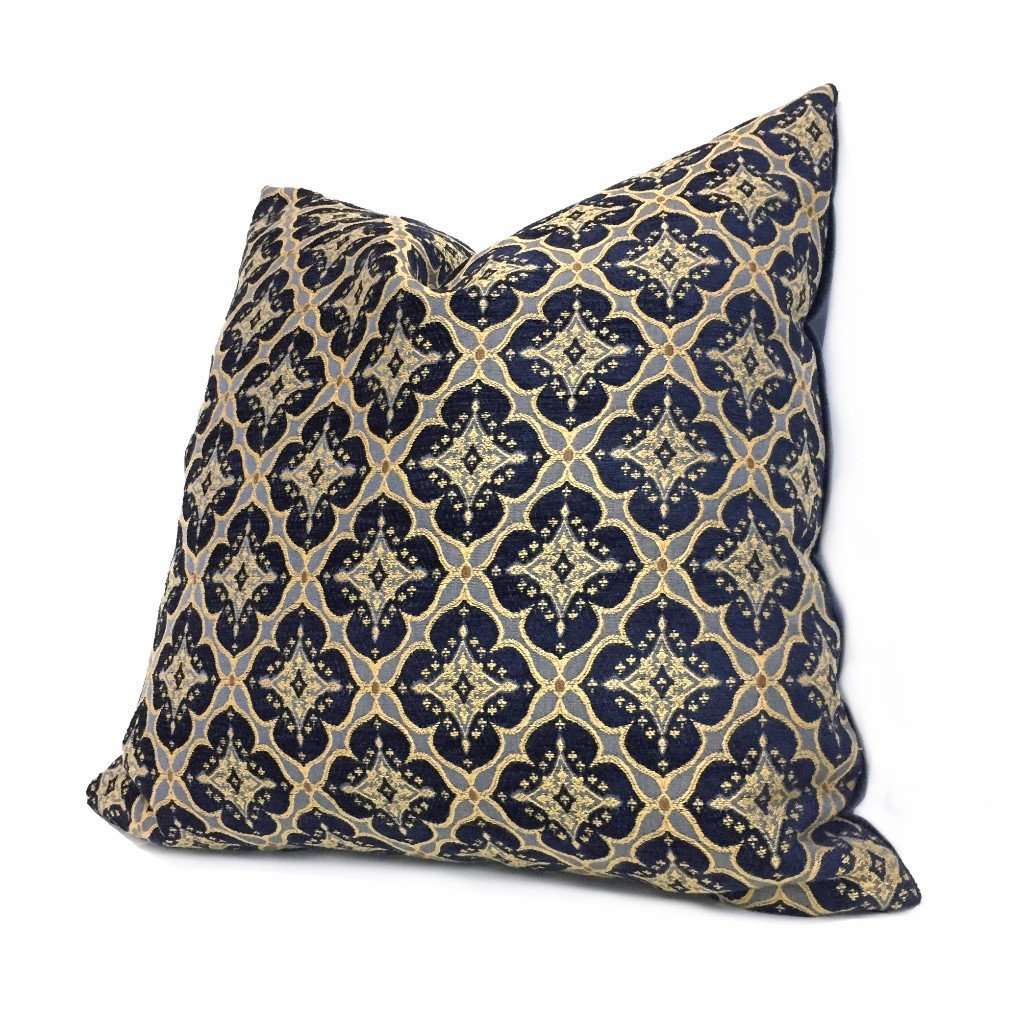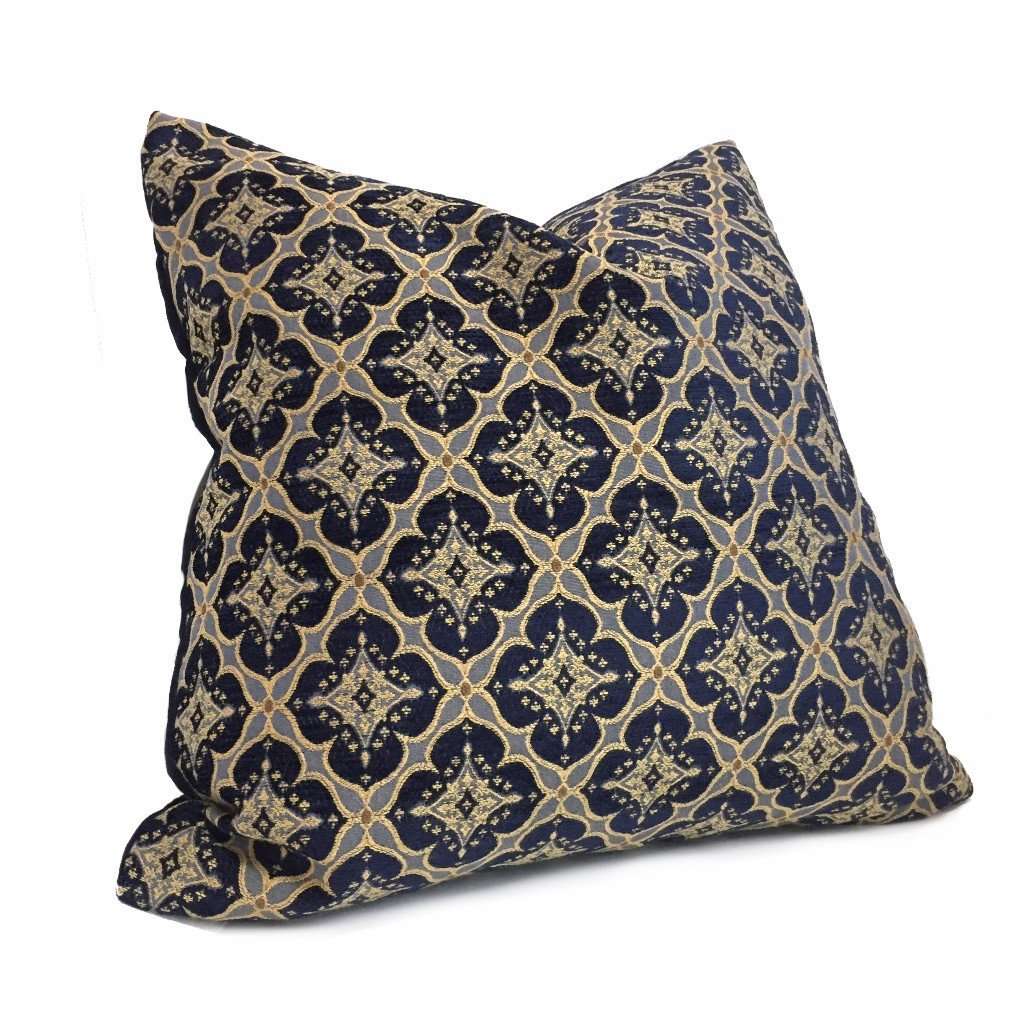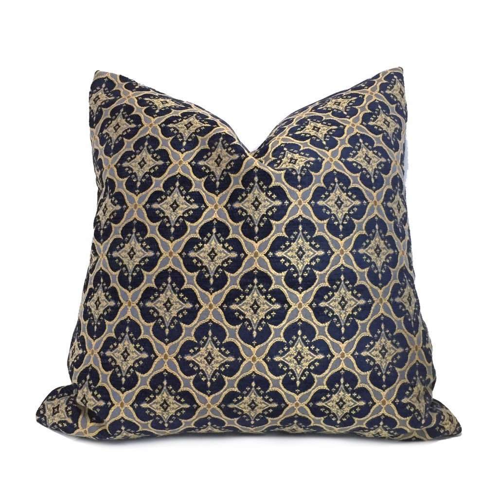This pillow cover features a designer Kravet couture geometric medallion diamond tile pattern woven in navy blue with gold accents. Pattern fabric is a heavy, high quality designer upholstery chenille retailing at over $180 a yard. Coordinating solid blue solid fabric on the backside. Pictured on 20x20 insert.