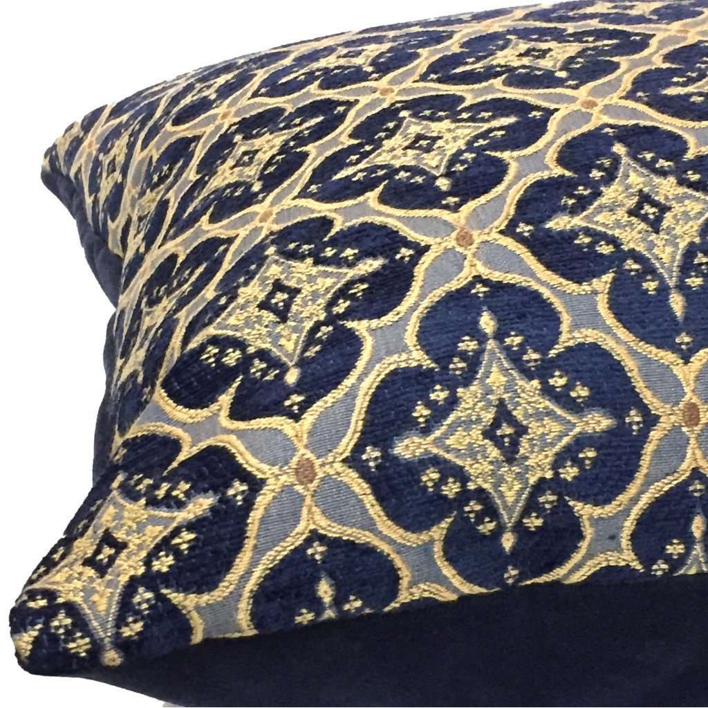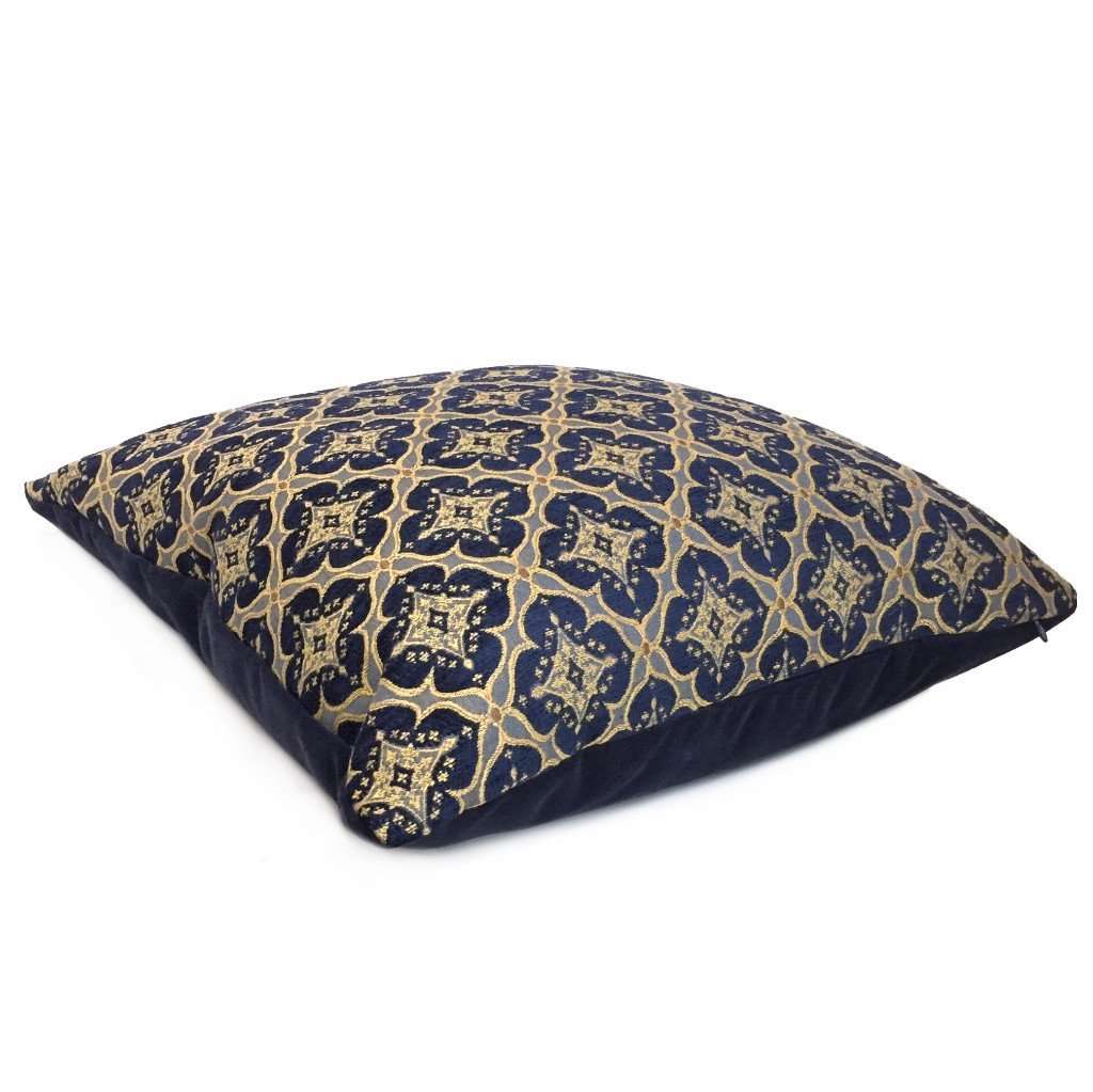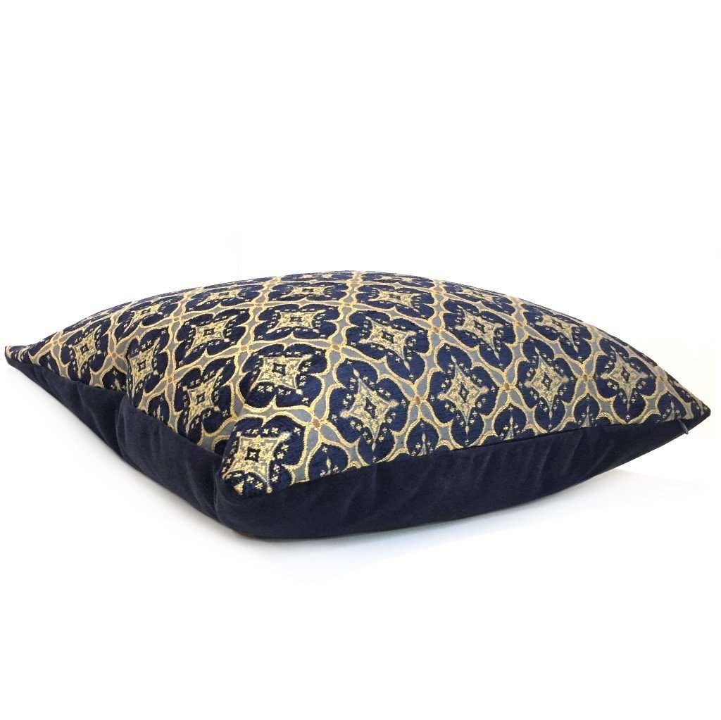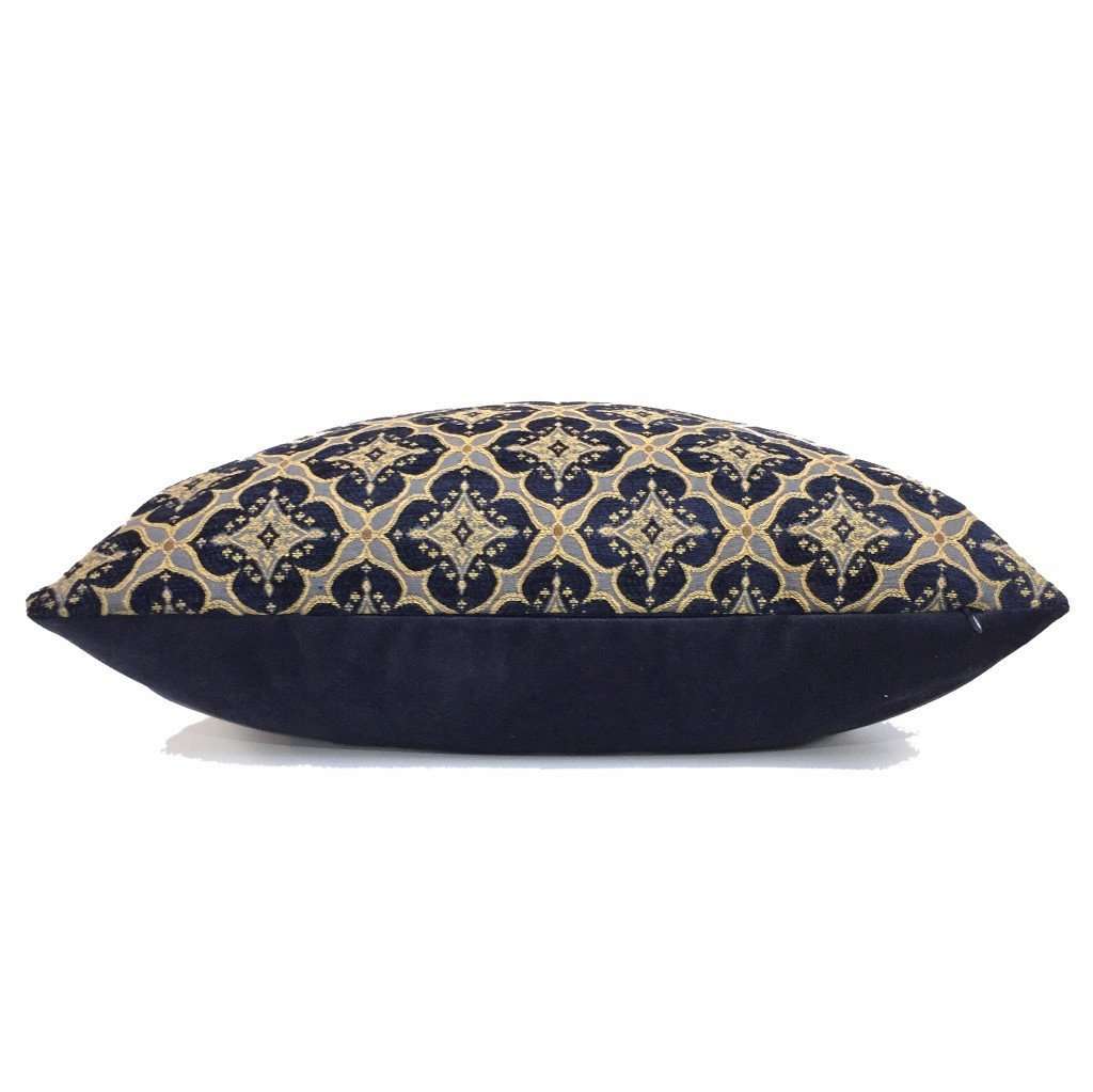 This pillow cover features a designer Kravet couture geometric medallion diamond tile pattern woven in navy blue with gold accents. Pattern fabric is a heavy, high quality designer upholstery chenille retailing at over $180 a yard. Coordinating solid blue solid fabric on the backside. Pictured on 20x20 insert.