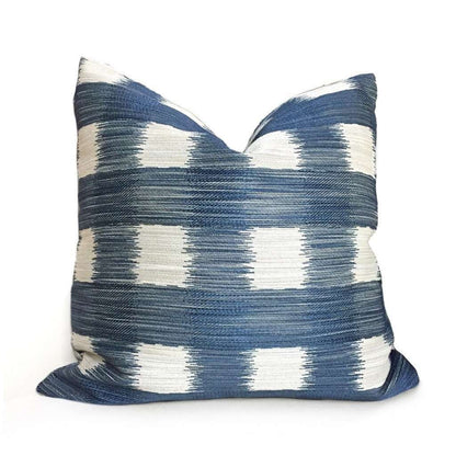 Sewn in an Ikat style plaid geometric fabric by Kravet, this pillow cover is a superb mixer with many other patterns! Punch it up with bright pinks and orange or other blues, this cushion cover can party with them all.