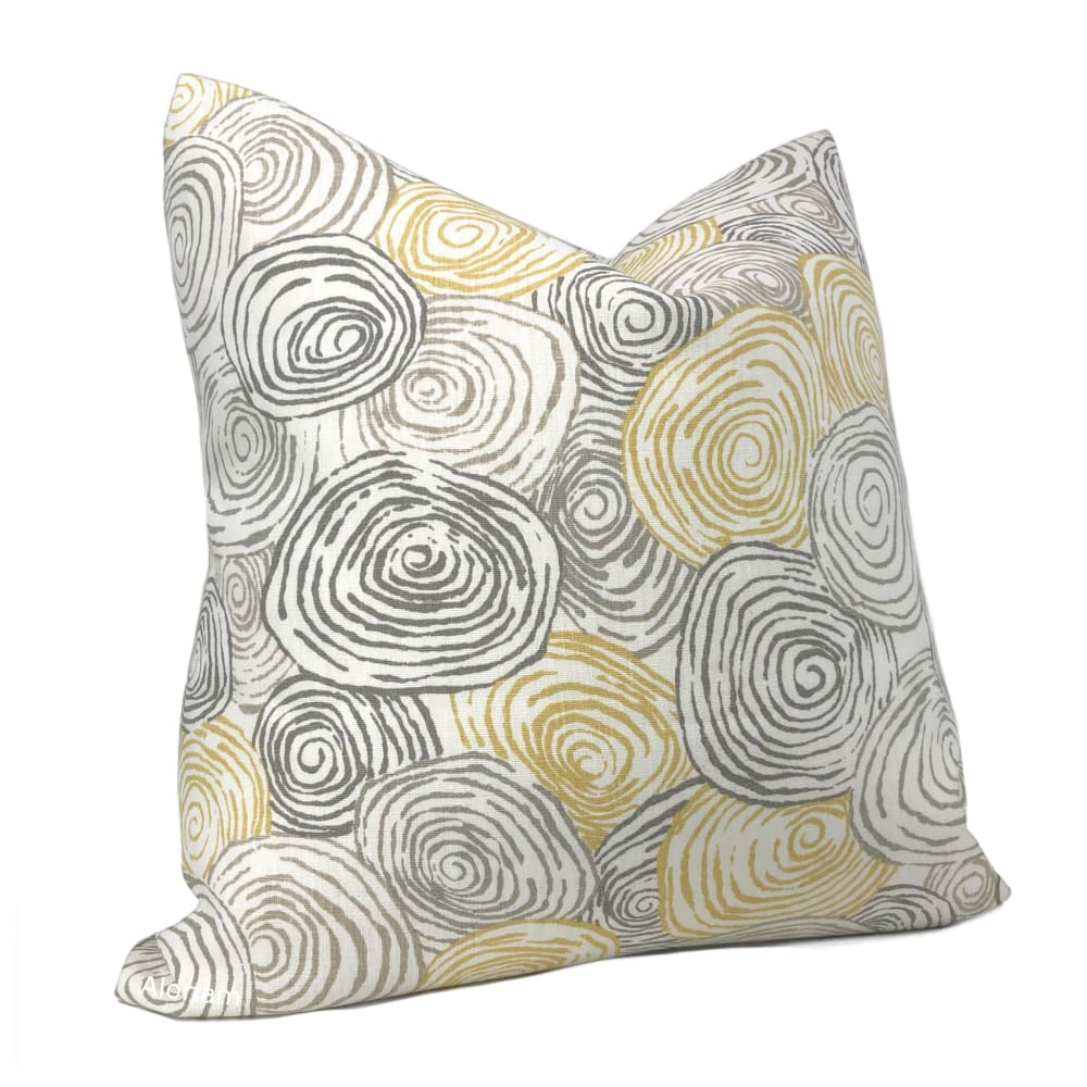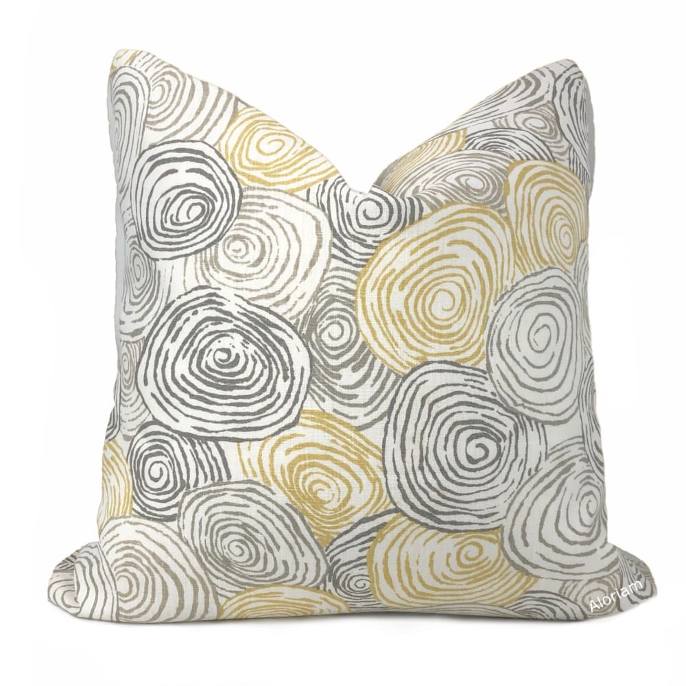 Sewn in a fabric designed by Jeffrey Alan Marks for Kravet, this pillow cover is a gorgeous addition to brighten up any casual décor. The abstract spiral pattern is printed in yellow, gray, and taupe on a cream colored 100% linen background.