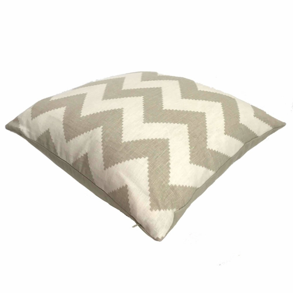 Sewn in a fabric designed by Jonathan Adler for Kravet, this pillow cover is a gorgeous addition to brighten up any casual décor. The chevron stripe pattern is printed in beige and cream on 100% linen. Choose from the pattern fabric used on the front side with a coordinating solid beige fabric on the backside, or the pattern fabric used on both sides. Photographed on 19x19 cover (filled with 20x20 insert).