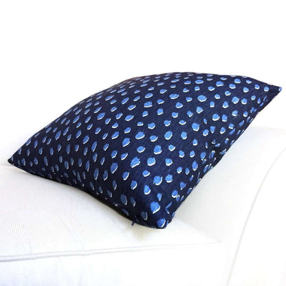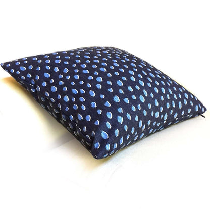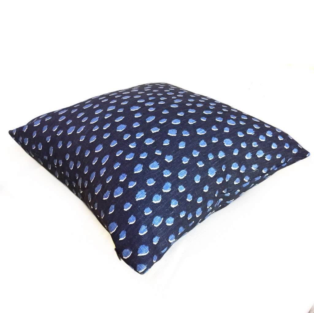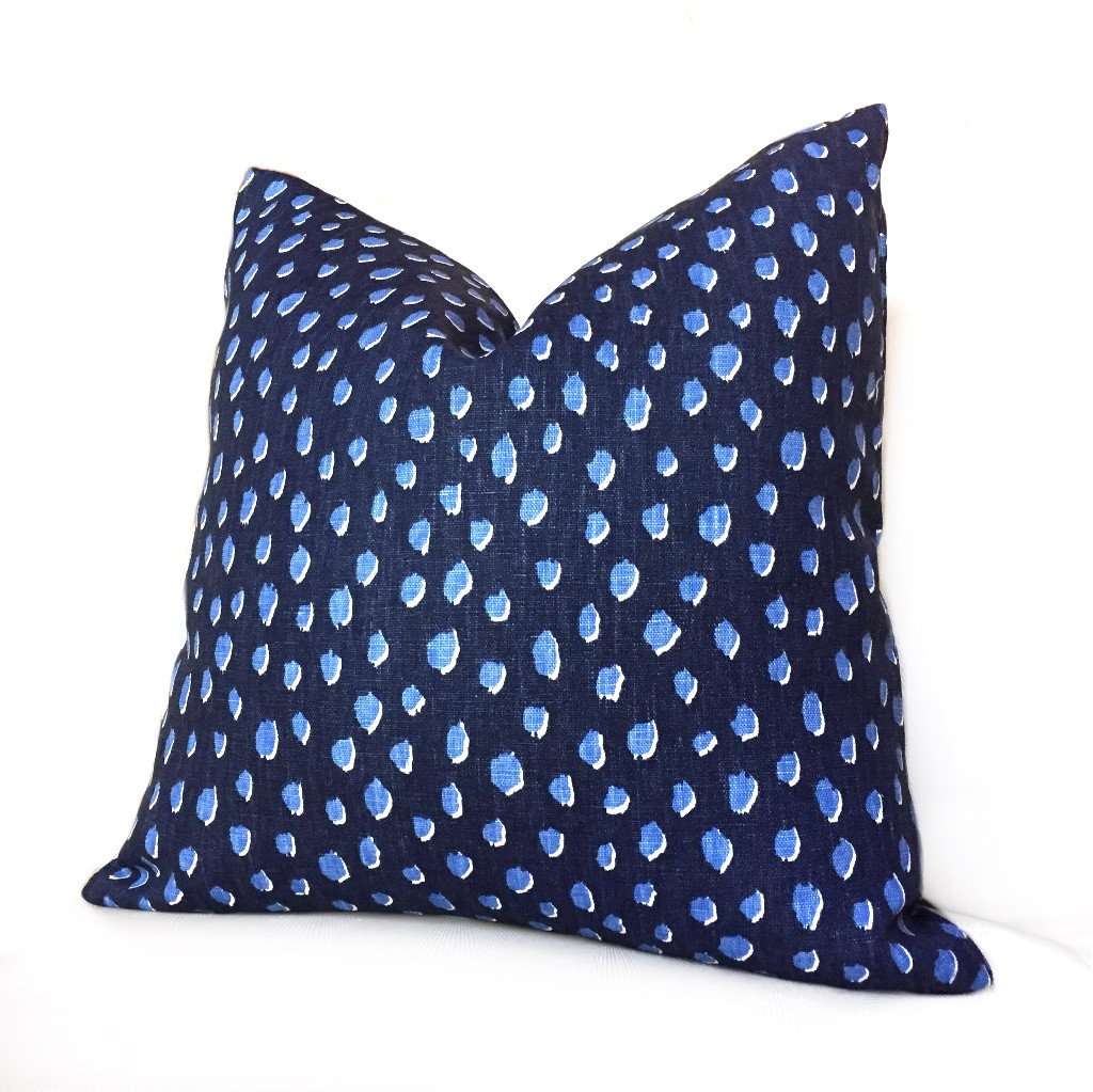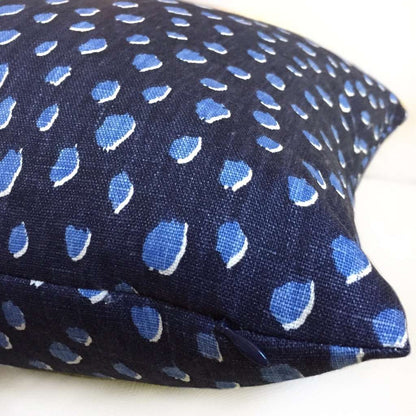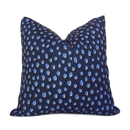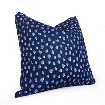 Limited availability! This striking pillow cover is made from a Kravet designer fabric by Kate Spade. Featuring an animal spotted design printed in navy blue with medium blue and white accents, this pillow cover will be a beautiful addition to any space.