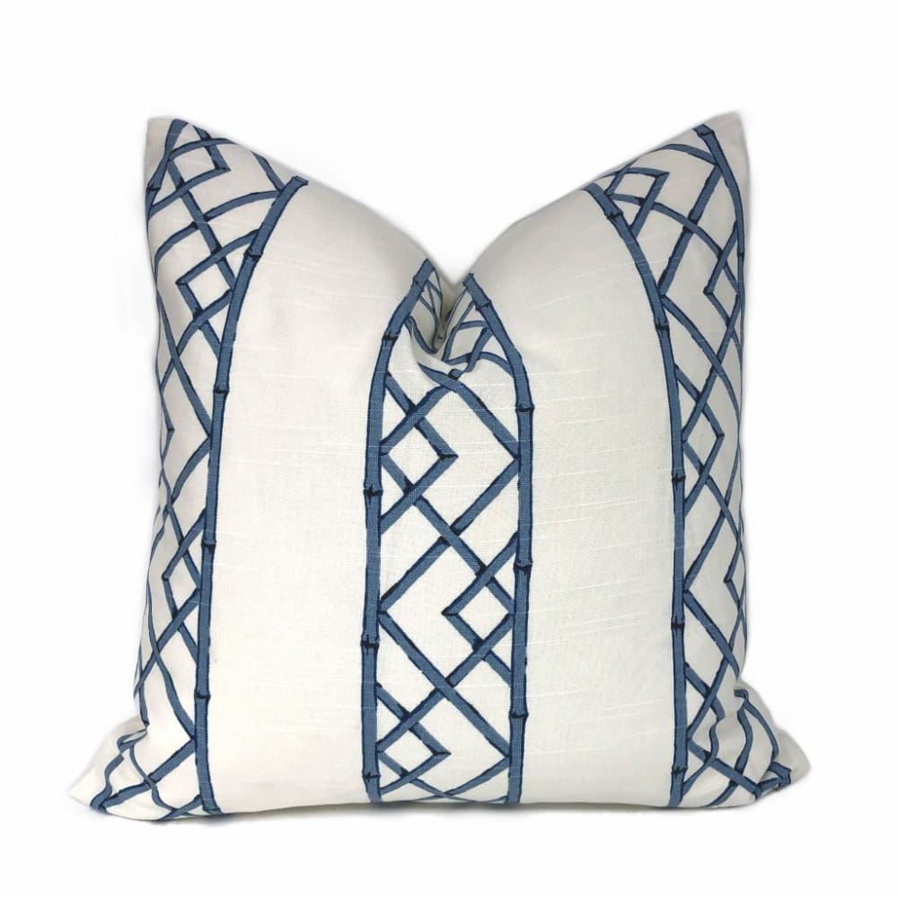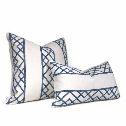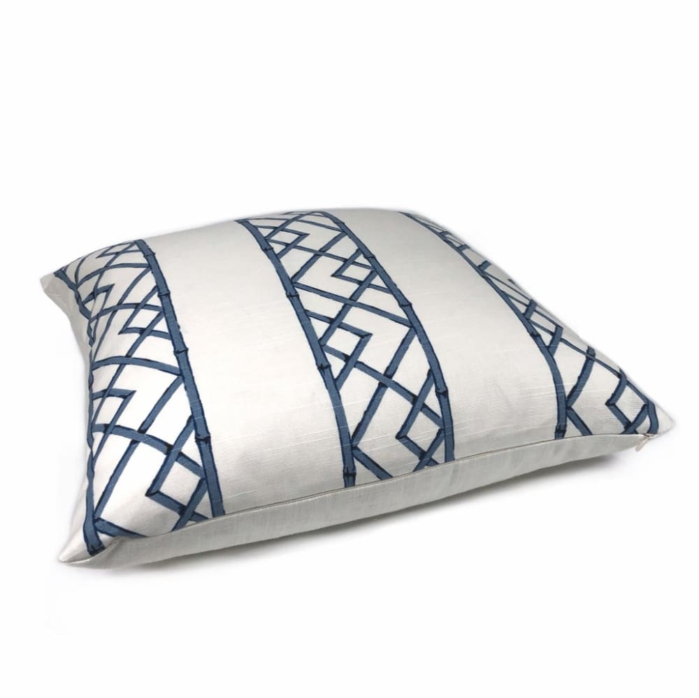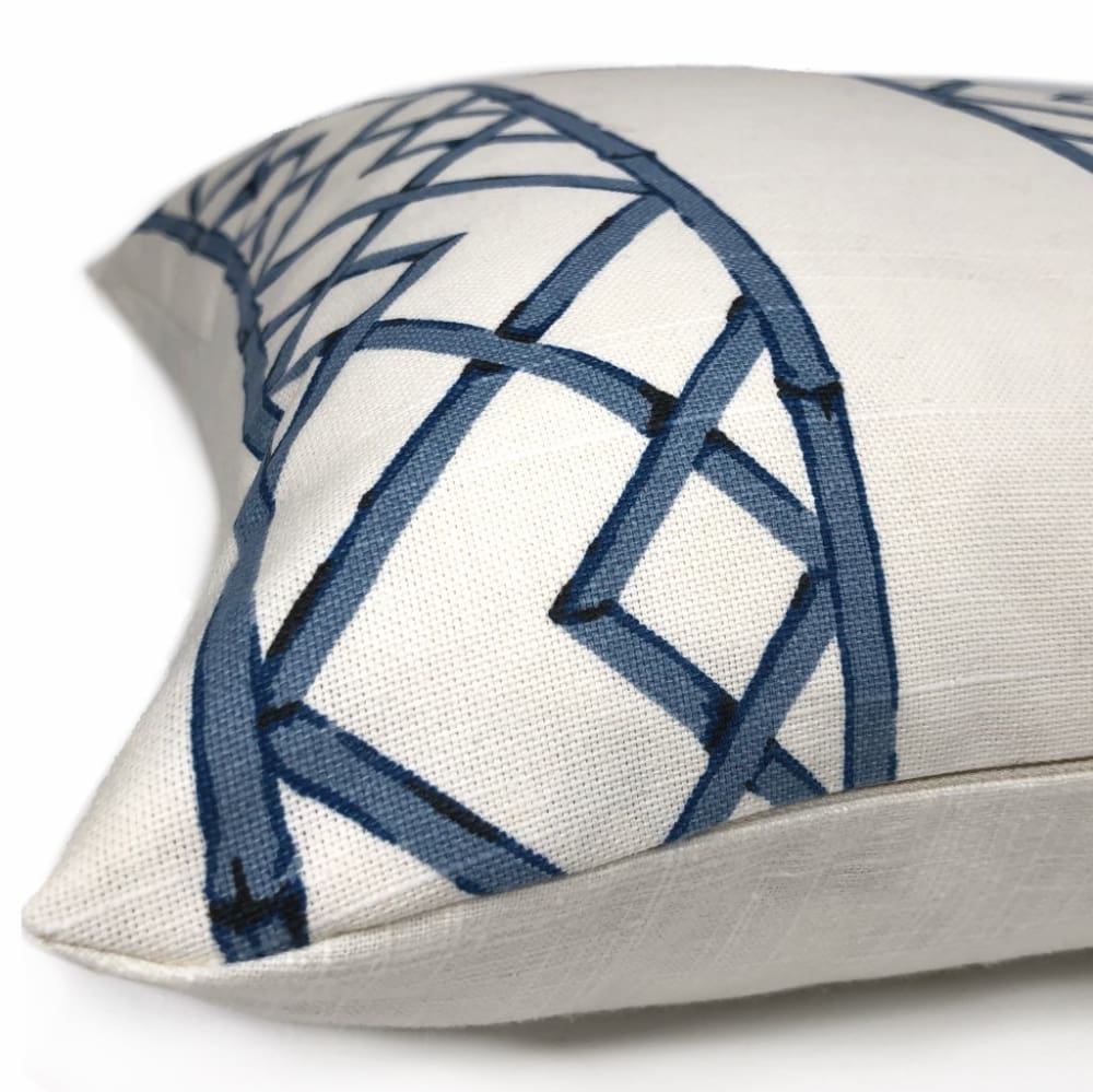 Designed by Sarah Richardson for Kravet, the Latticely pattern features a bamboo trellis stripe pattern printed in blue on a creamy white background. The pattern will be symmetrically placed on each pillow cover. The 100% linen designer pattern fabric is used on your choice of both sides or with a coordinating solid white backside.