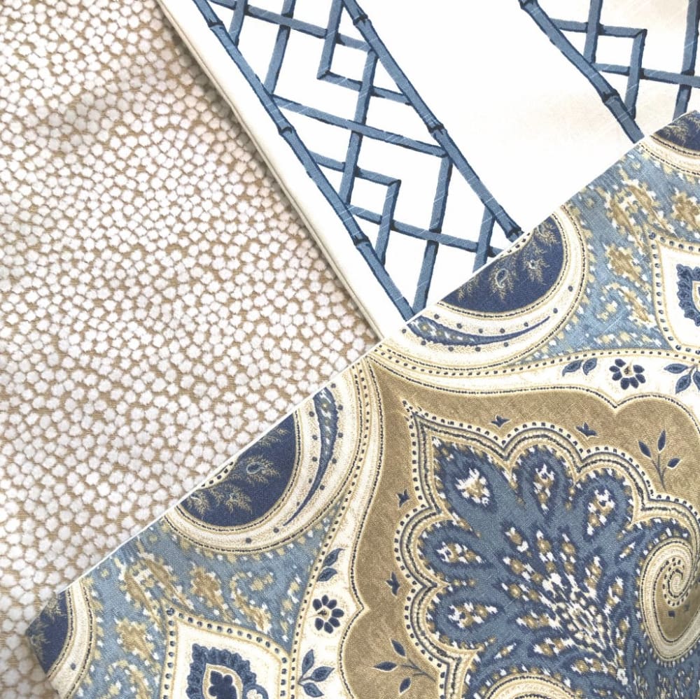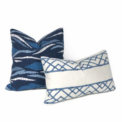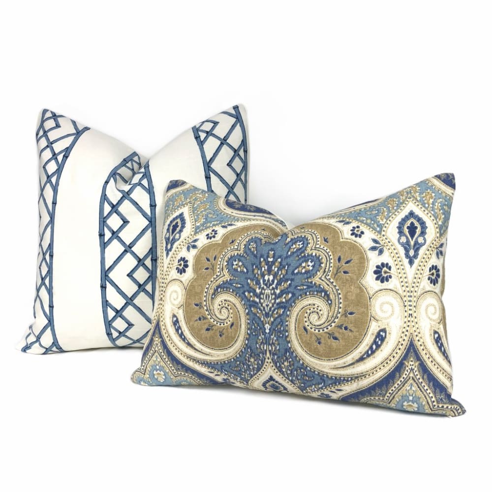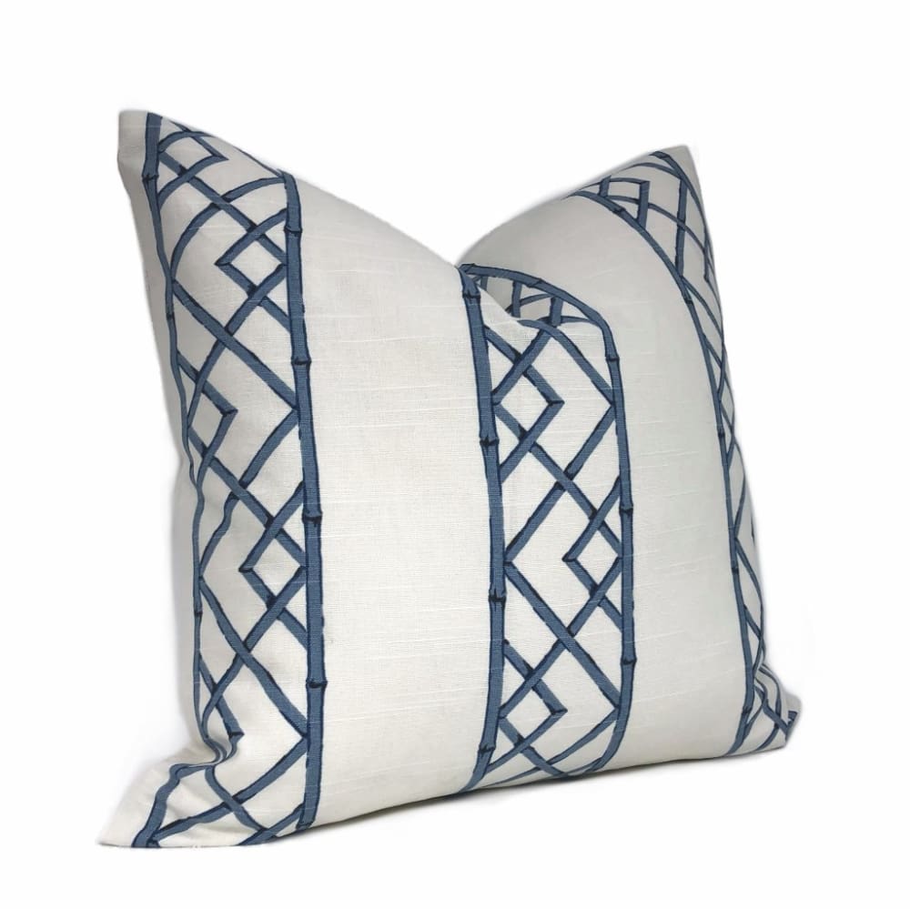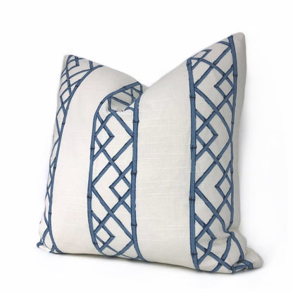 Designed by Sarah Richardson for Kravet, the Latticely pattern features a bamboo trellis stripe pattern printed in blue on a creamy white background. The pattern will be symmetrically placed on each pillow cover. The 100% linen designer pattern fabric is used on your choice of both sides or with a coordinating solid white backside.