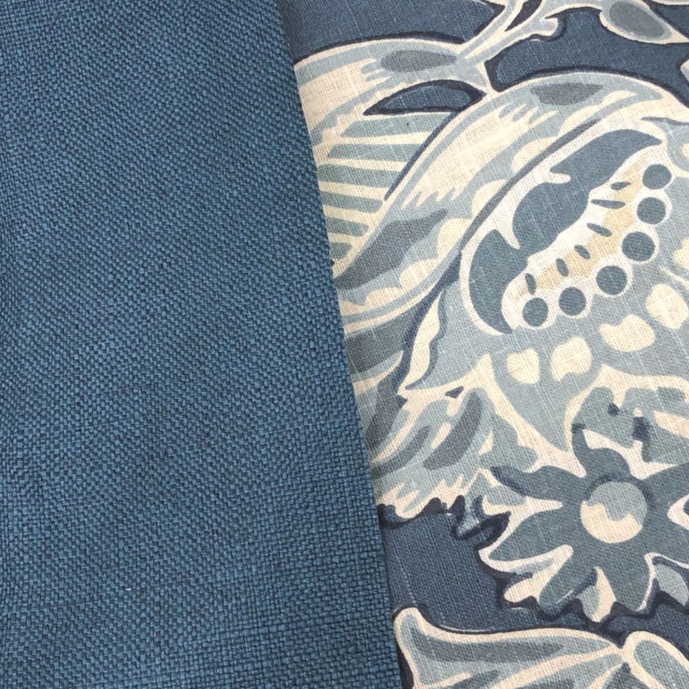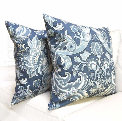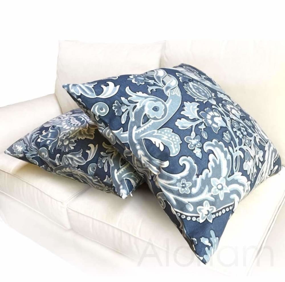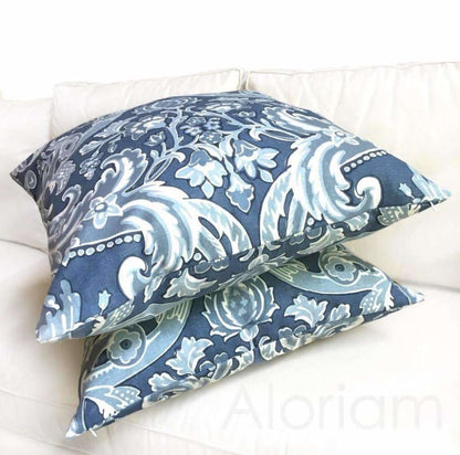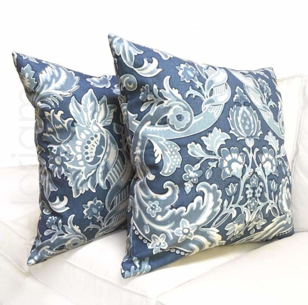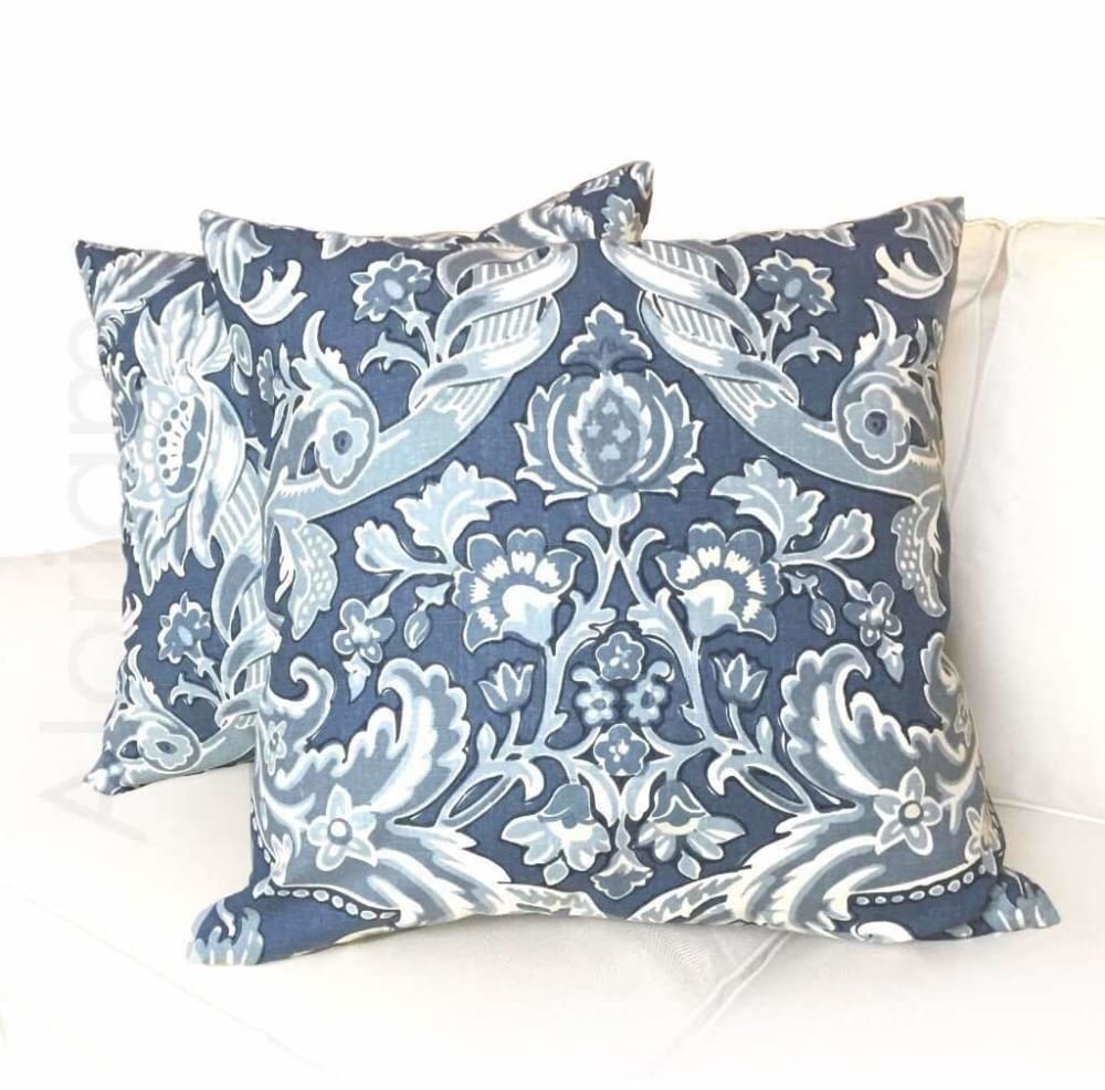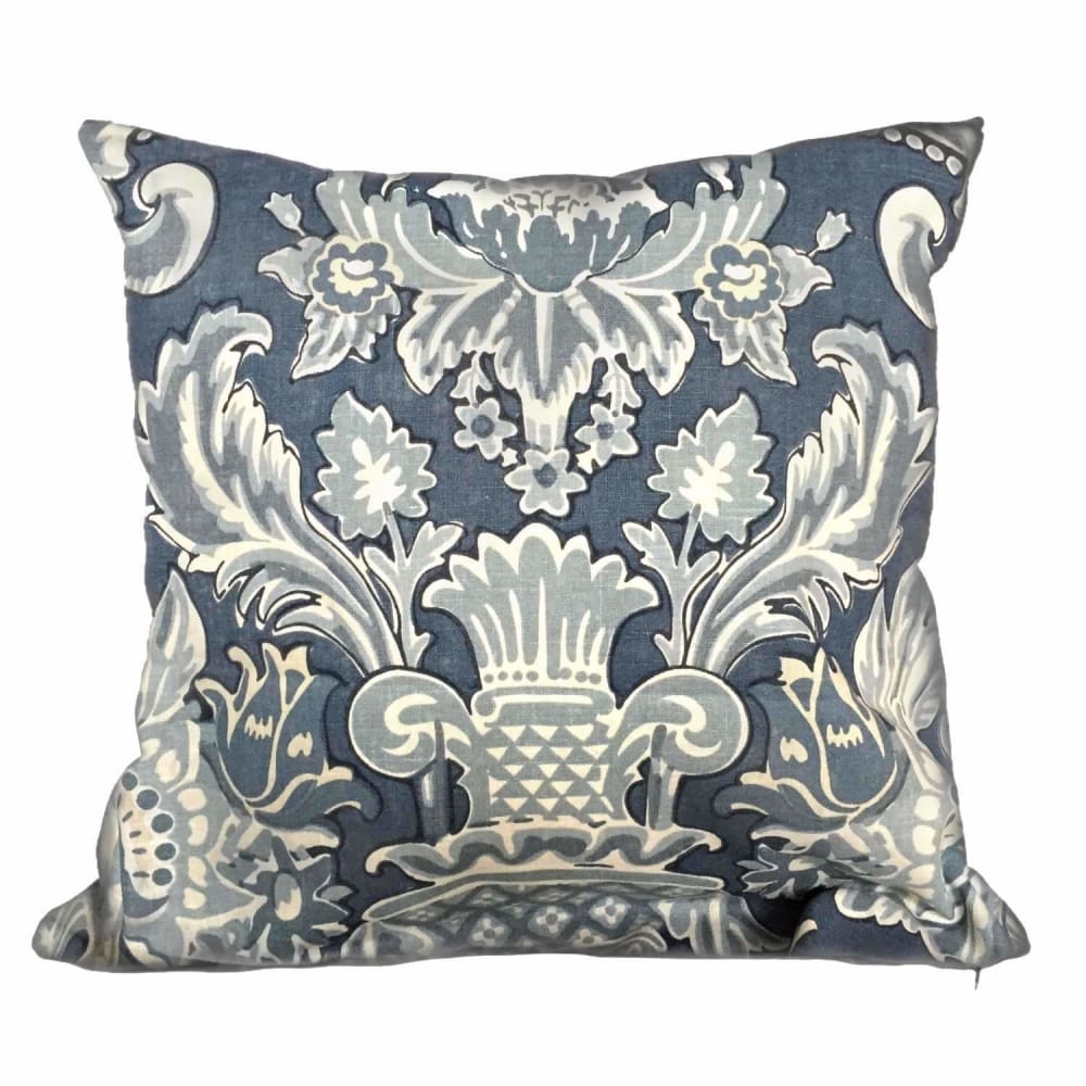Almost sold out! This large scale damask print named ""Lorton"" by Kravet will add an elegant finish to any room. Pure linen exterior features colors of blue and off-white. The pattern fabric is used on both sides of the cover. The larger cover sizes will best suit this print due to the broad scale of the pattern.