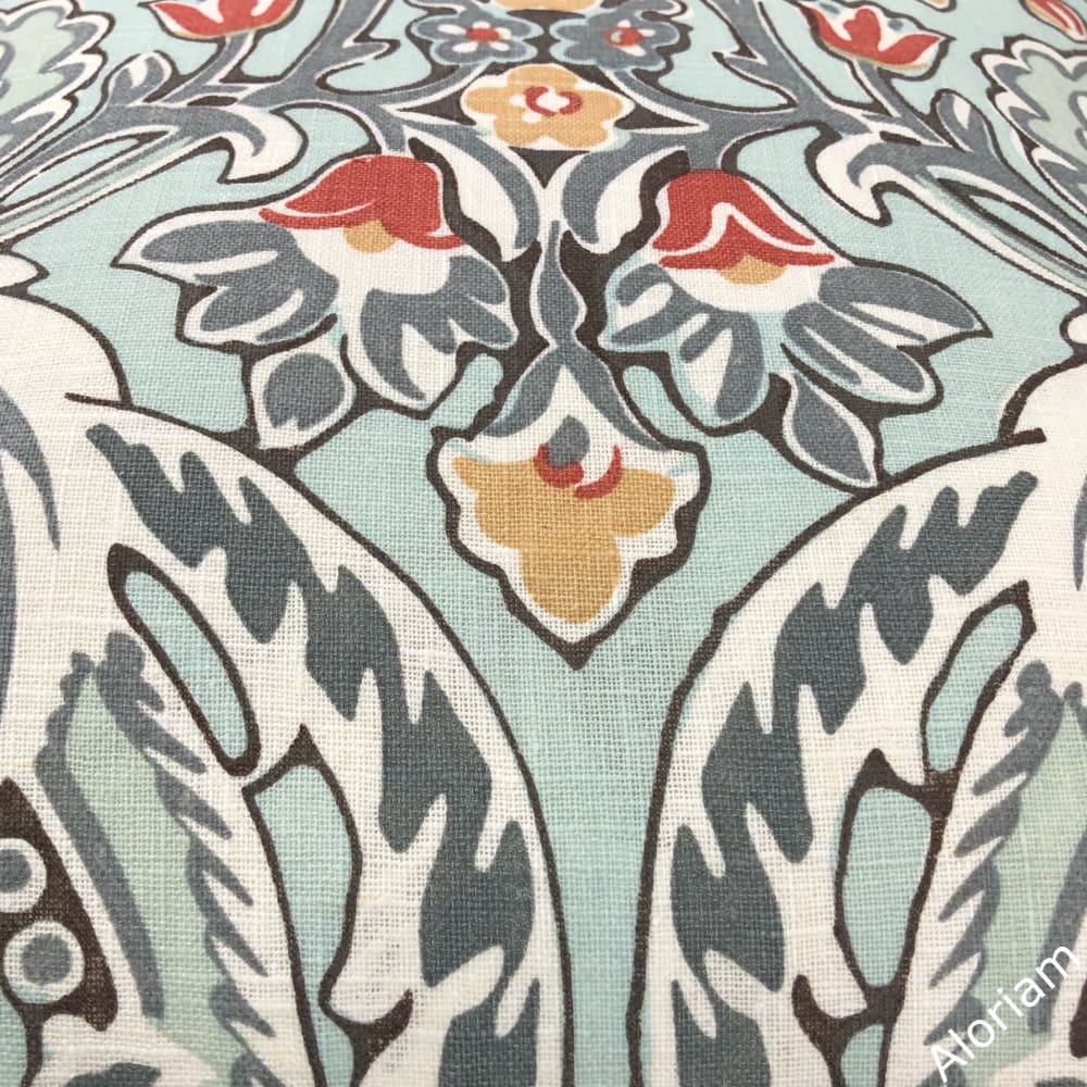 This stunning large scale floral damask design features colors of faded red, orange and white on a light aqua blue background. 100% linen fabric Lorton by design house Kravet.