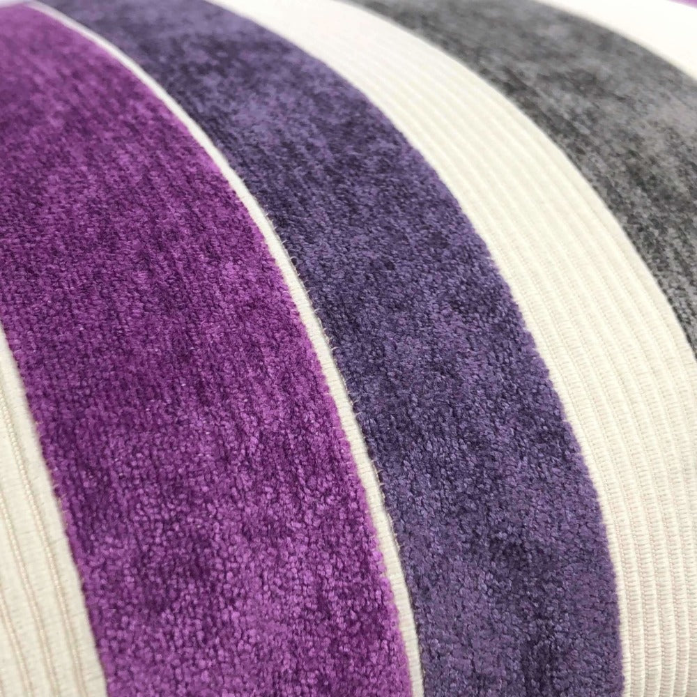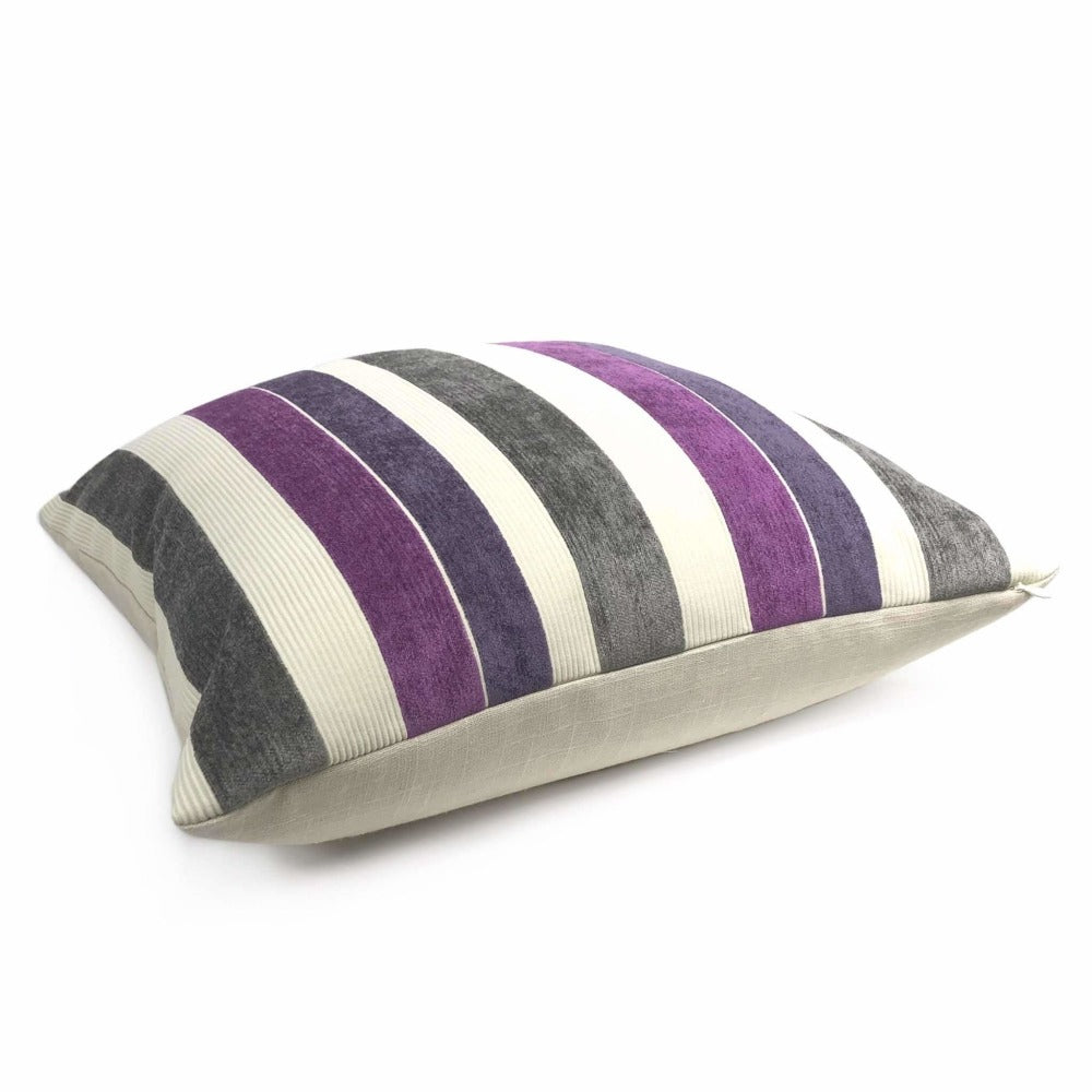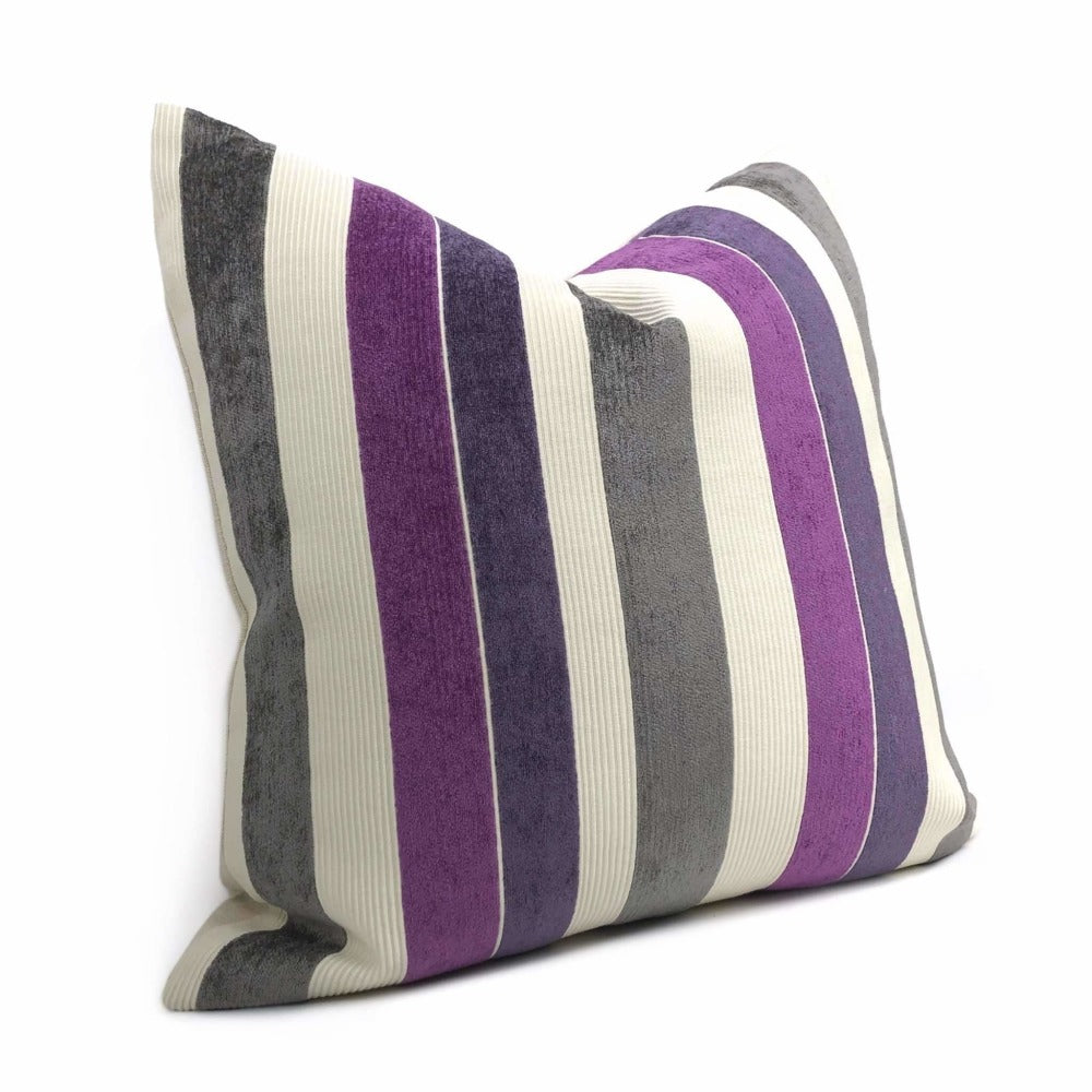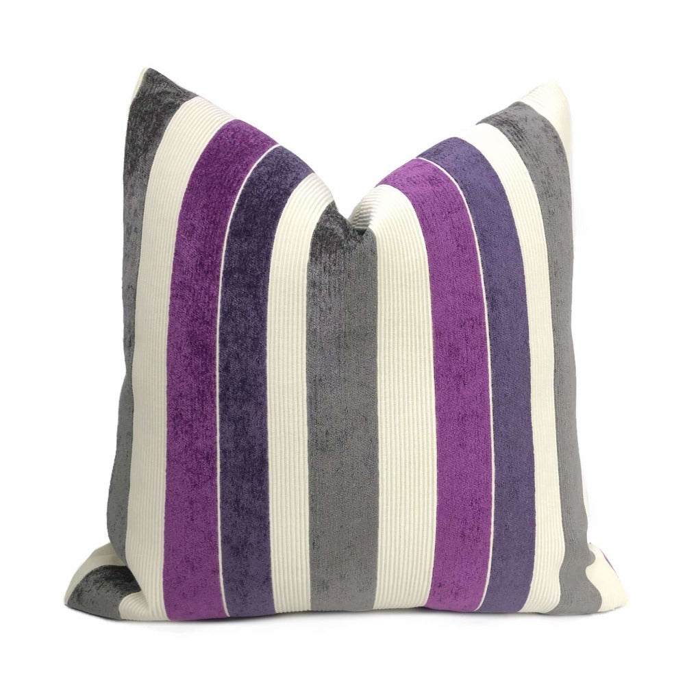 This pillow cover features alternating soft chenille stripes in grape purple, violet and gray woven on a cream background. Designer fabric by Eileen Boyd for Duralee. Choose from the pattern fabric on both sides or on front only with a solid cream linen backside. Photographed on 17x17 cover (filled with 18x18 insert).